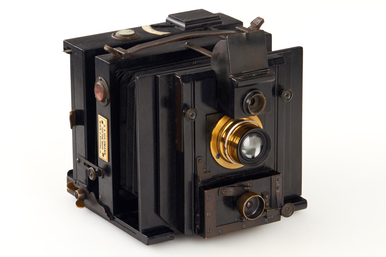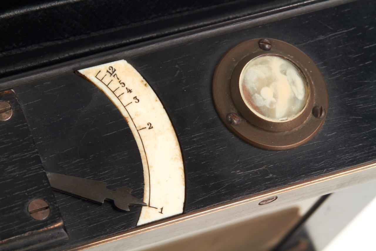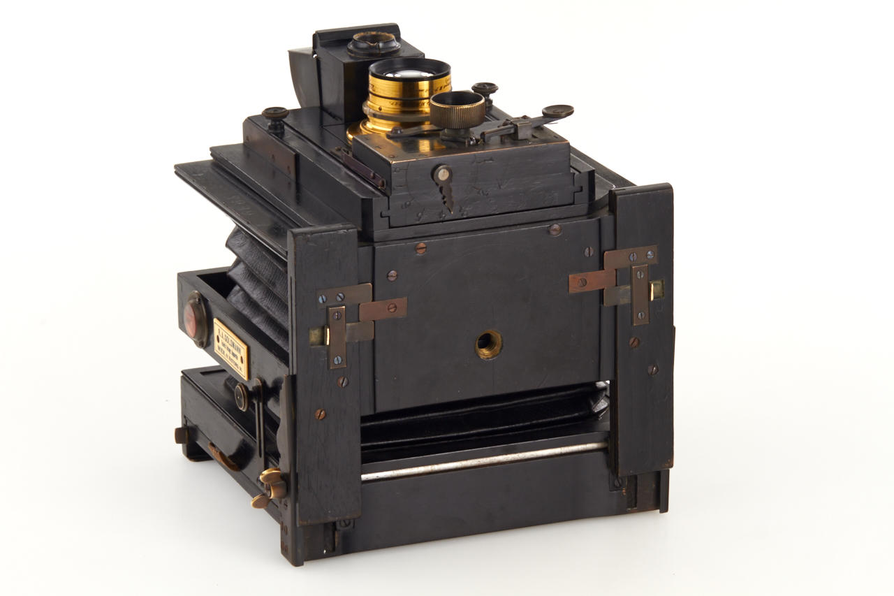 rare advanced camera for 10x13cm exposures, in beautiful condition, ebonized wooden body with complete brass fittings, original bellows, working Guillotine shutter, with Voigtländer Triple Anastigmat III 7.7/140mm no.50800 and Rodenstock Weitwinkel-Bistigmat no.29985, ground glass, five wooden double film holders, in original carrying case