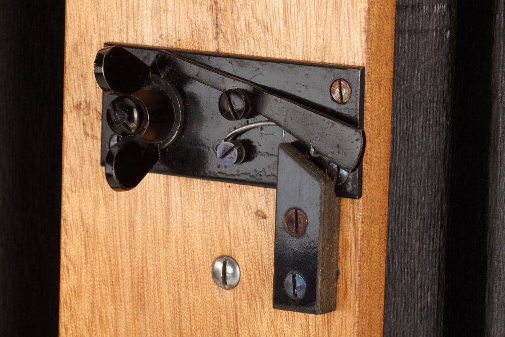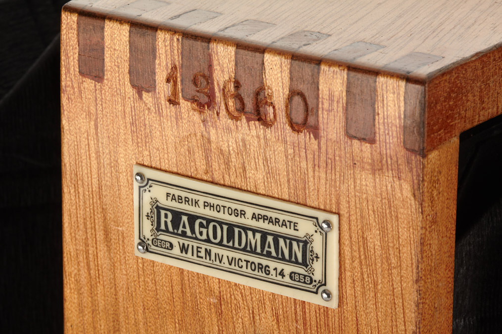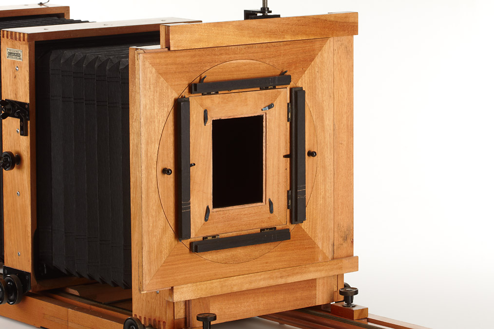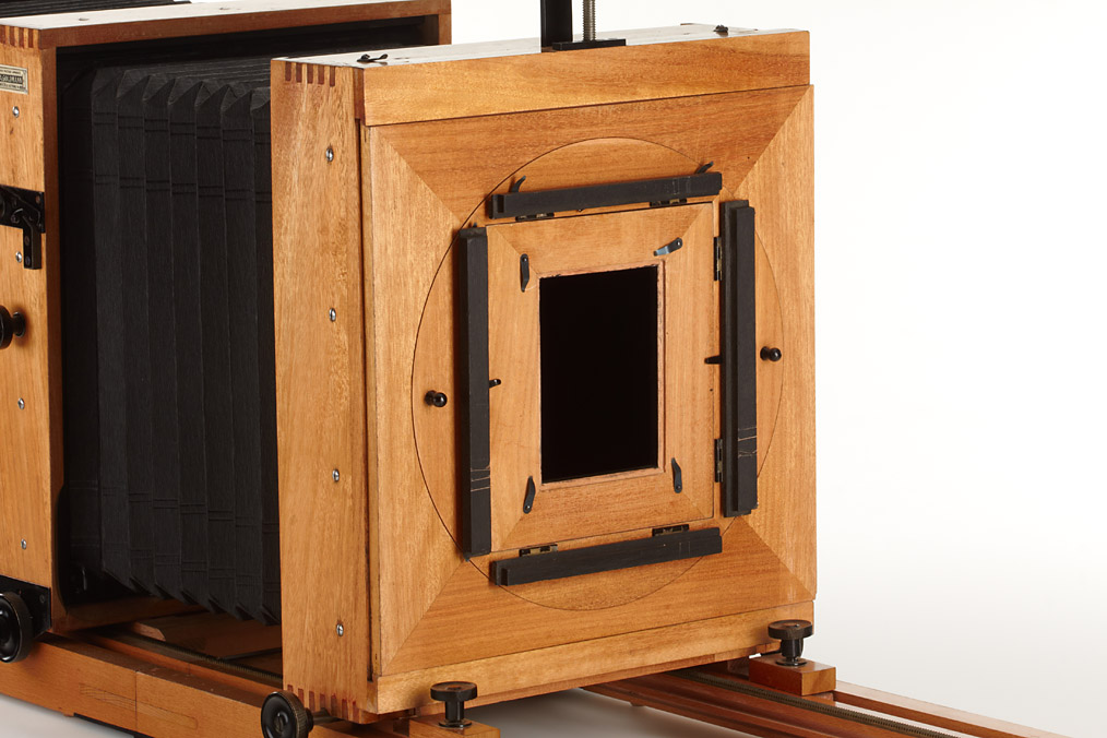 20x30cm, large format universal camera for regular use, repro or enlarging, swing-in plate for enlarging, M39 screw mount lens board, platefilm holder, front panel for tilting and shifting for various formats, black double extension bellows, Rodenstock Monar 3.5 brass lens for waterhouse stops on lens board (not matching) with custom made red filter, some accessories - all in fitted wooden carrying case
