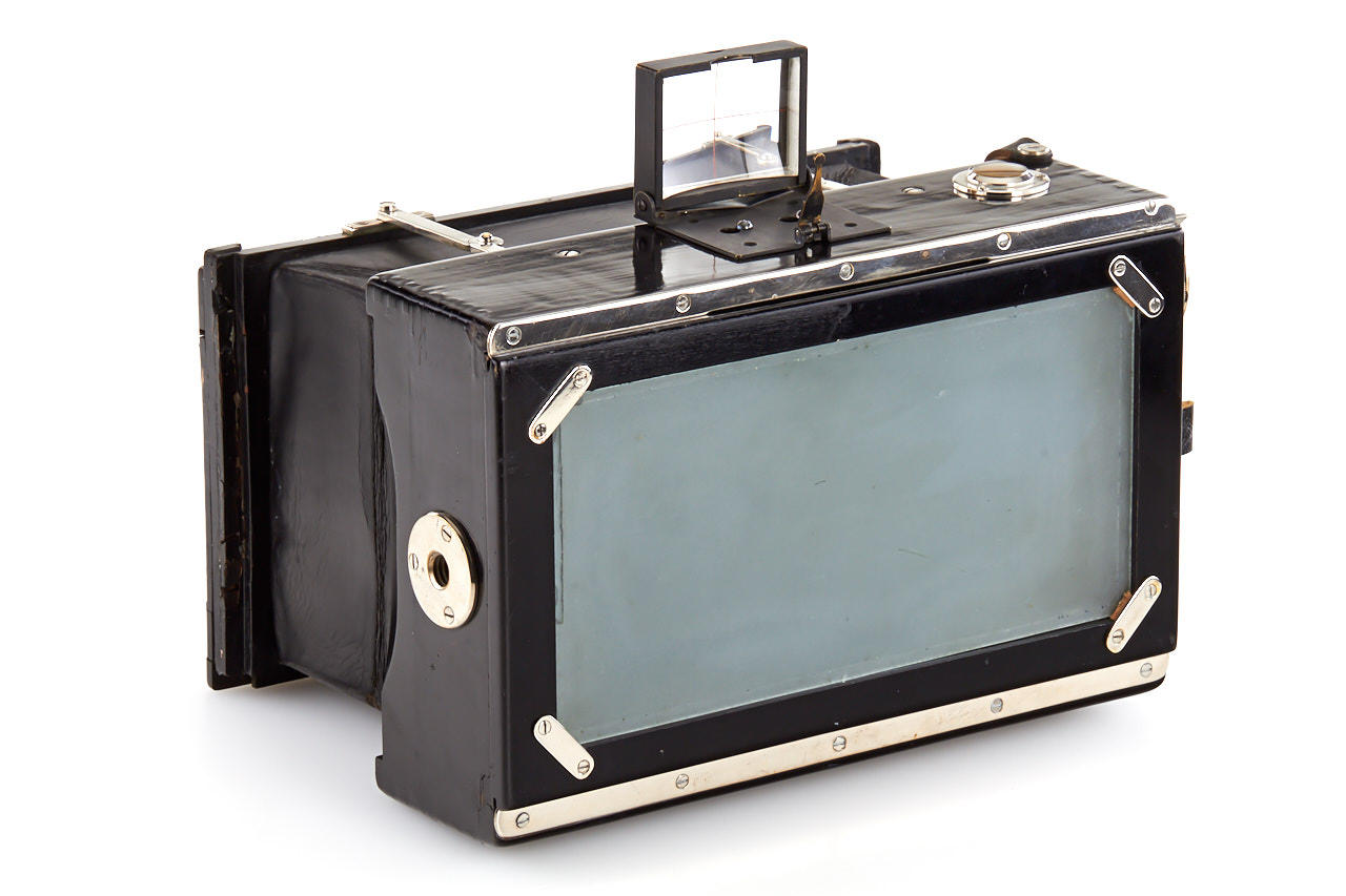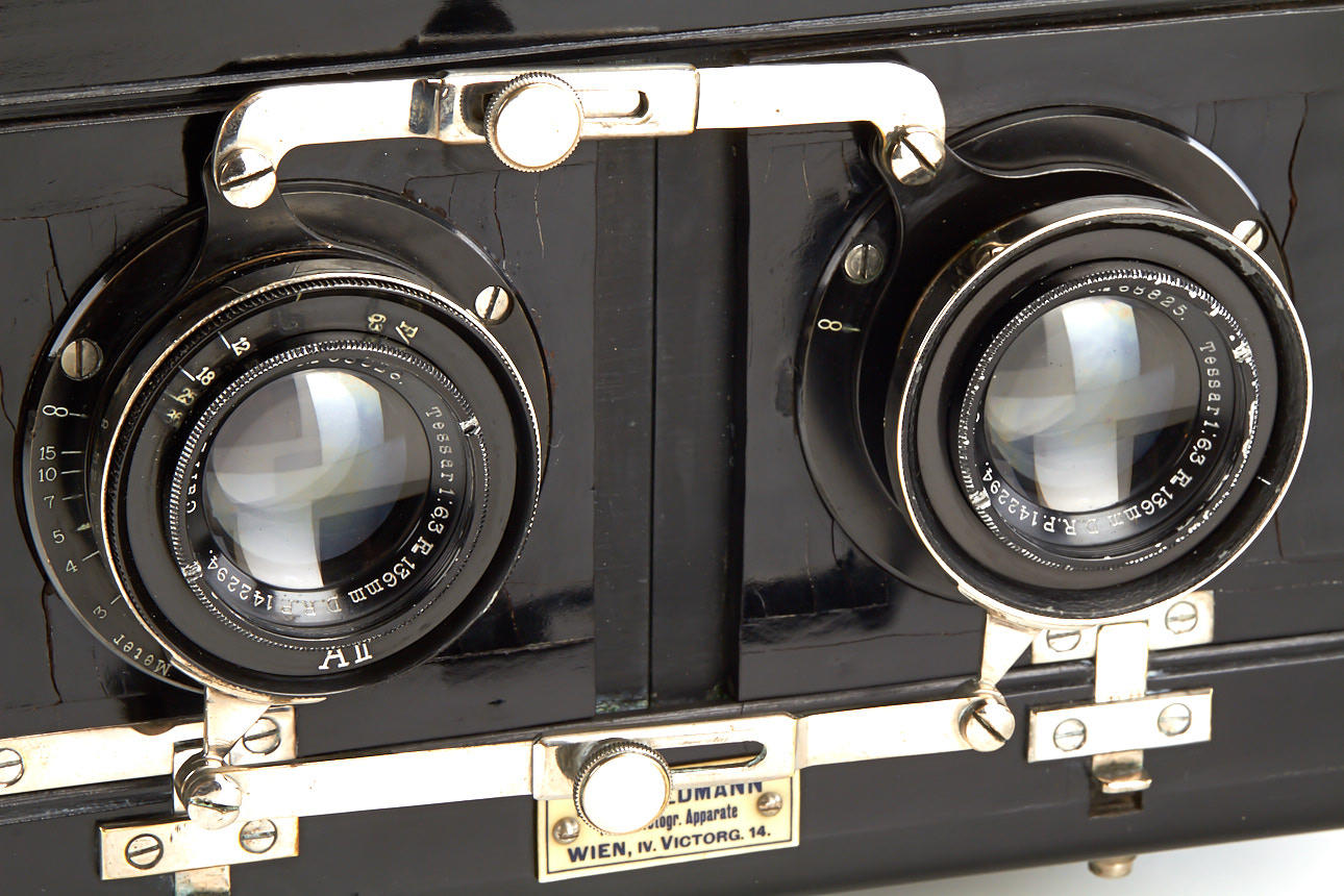 rare Austrian stereo camera for 13x18cm exposures, in very good condition, ebonized wooden body with nickel fittings (small cracks in wood), original bellows, with a pair of Tessar 6.3/136mm lenses nos.68826/ 68825