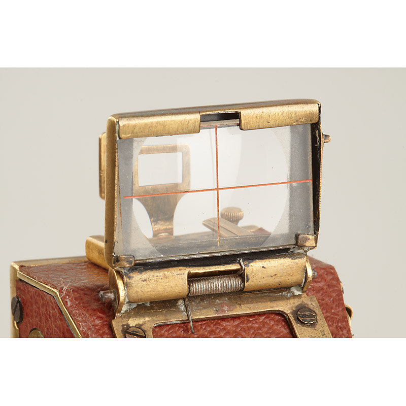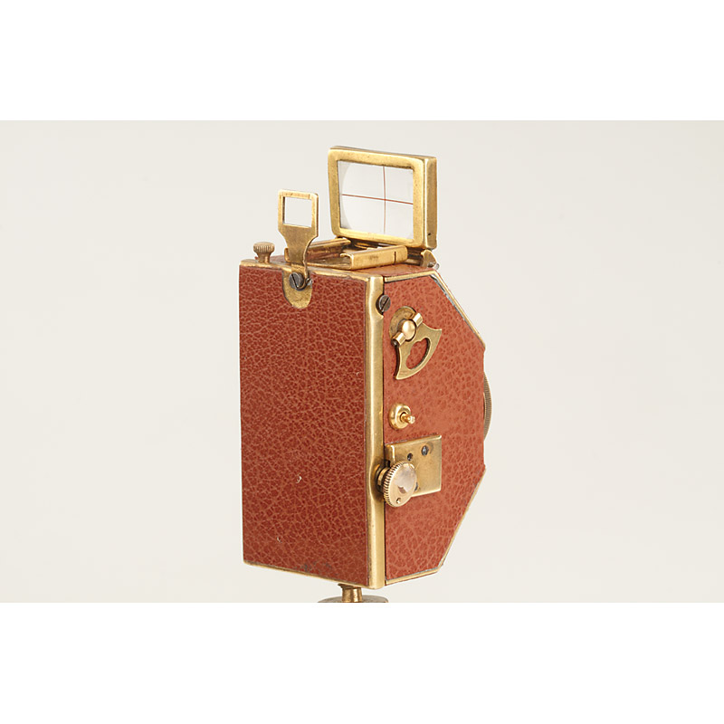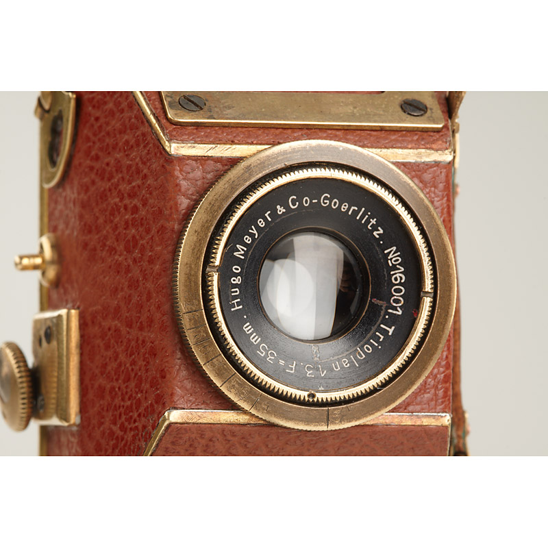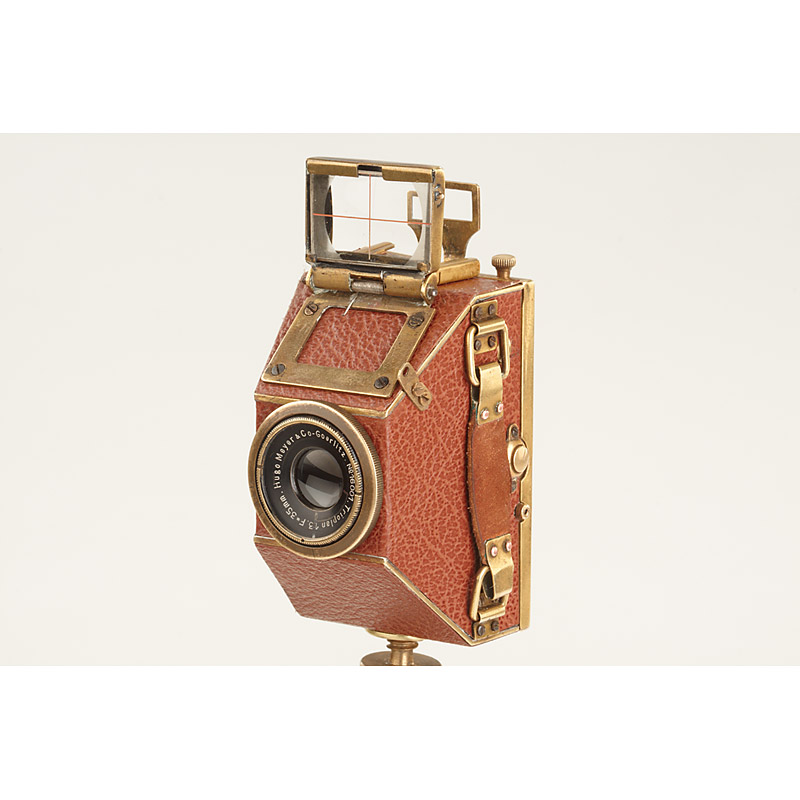 beautifully made German prototype of a very small 35mm camera for 18x24mm exposures, all-brass body covered with brown leather covering, for use with special cassette, foldable finder, focal plane shutter, very fine 'tropical' design with detachable back, with Trioplan 1:3/35mm no.16001, inside engraved 'Heinr. Müller', not listed in any literature