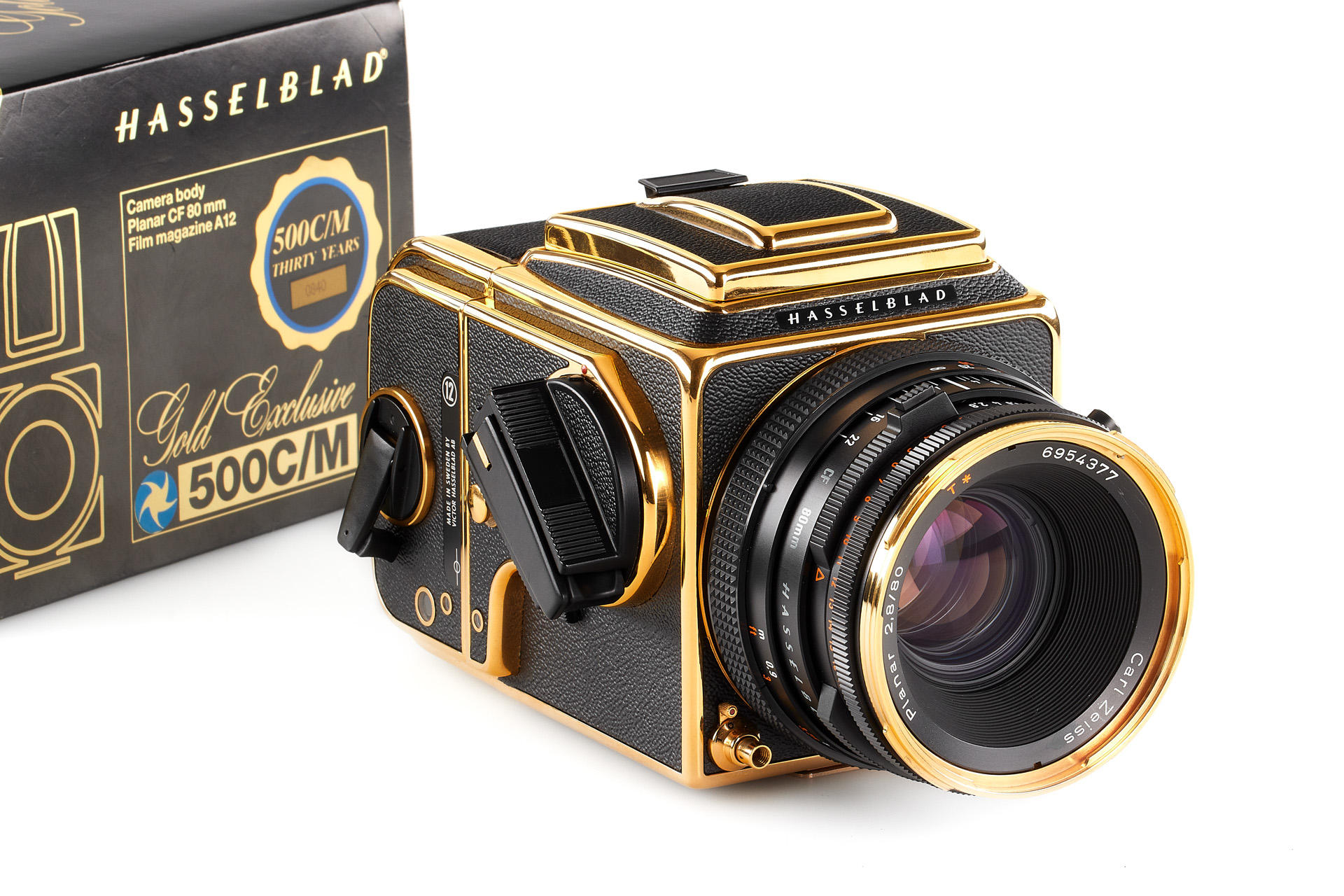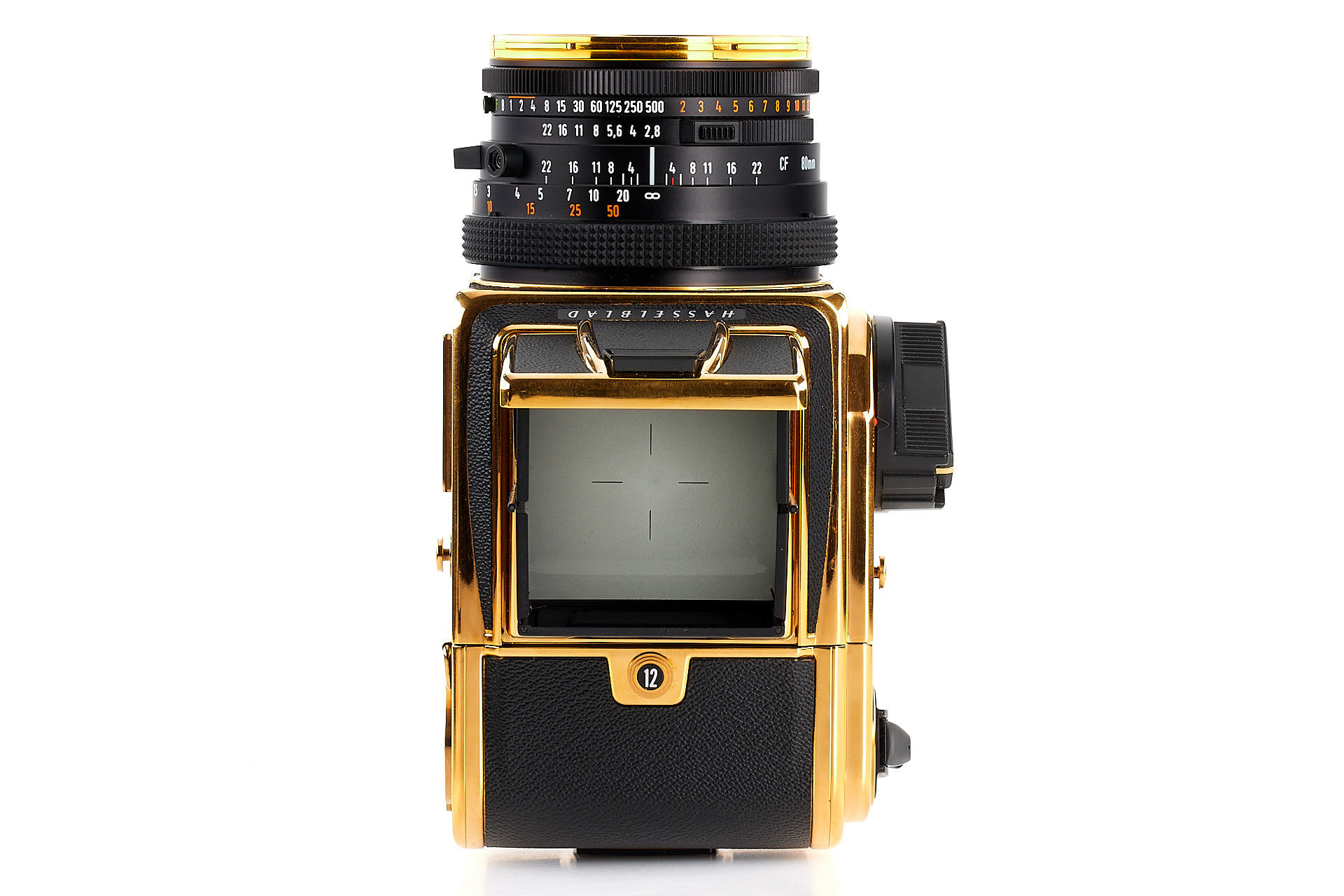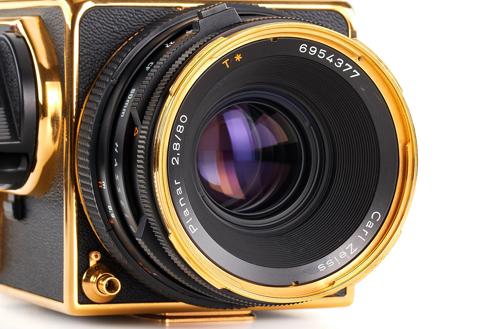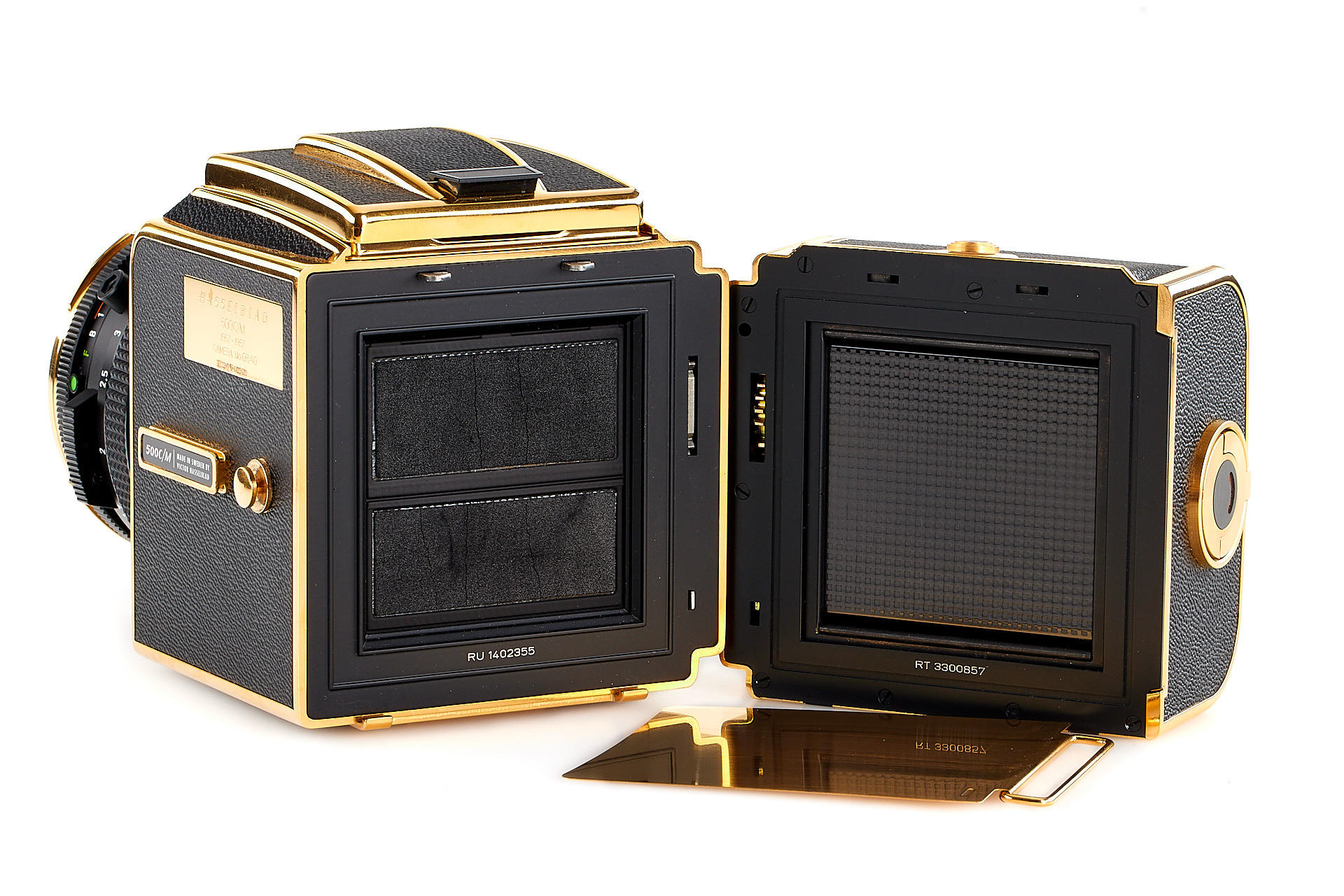 Very attractive gold plated edition released for the 30th anniversary of the 500C (special number 0840/1400), in mint condition, with gold plated CF Planar 2.8/80mm T* no.6954377, gold plated A12 magazine no.RT3300857, gold plated slider and strap, with maker's box