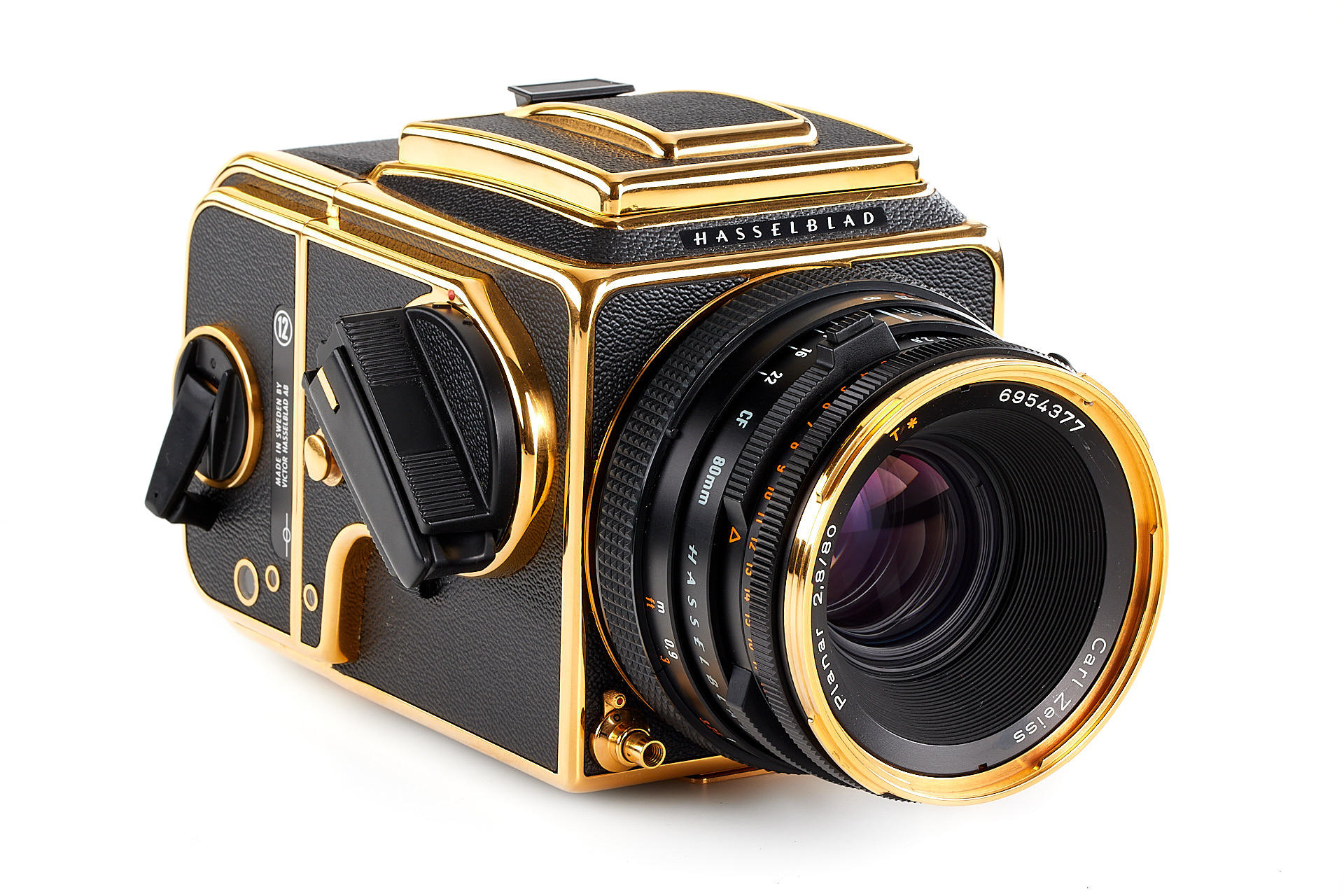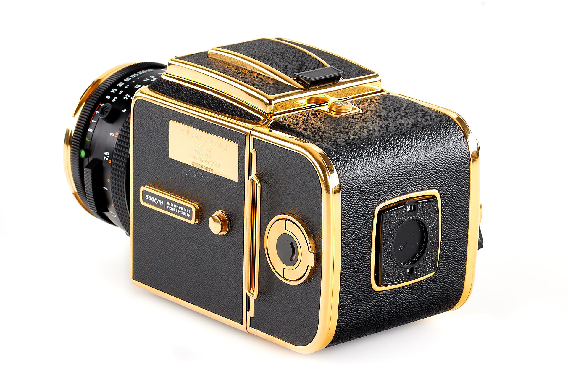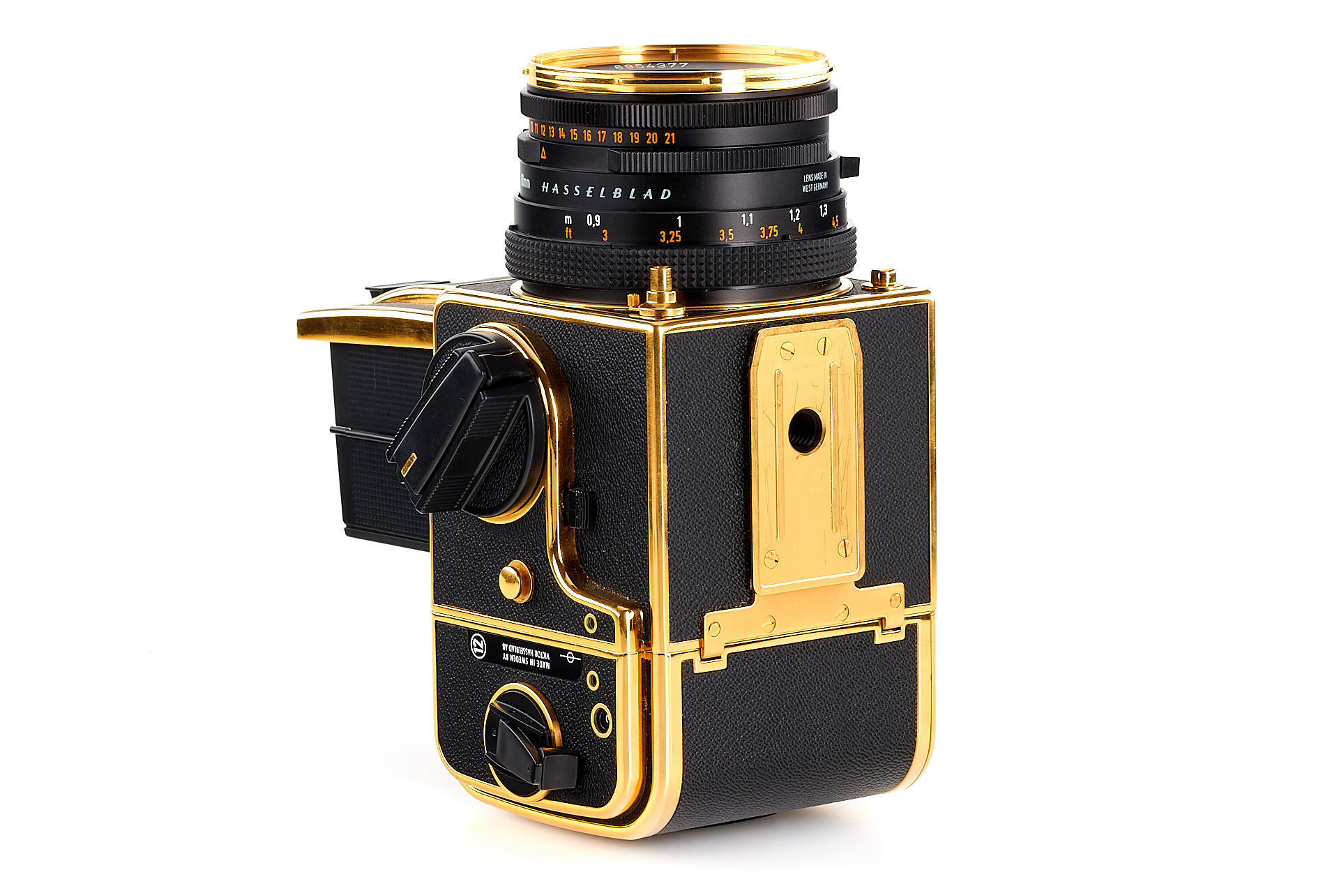 Very attractive gold plated edition released for the 30th anniversary of the 500C (special number 0840/1400), in mint condition, with gold plated CF Planar 2.8/80mm T* no.6954377, gold plated A12 magazine no.RT3300857, gold plated slider and strap, with maker's box