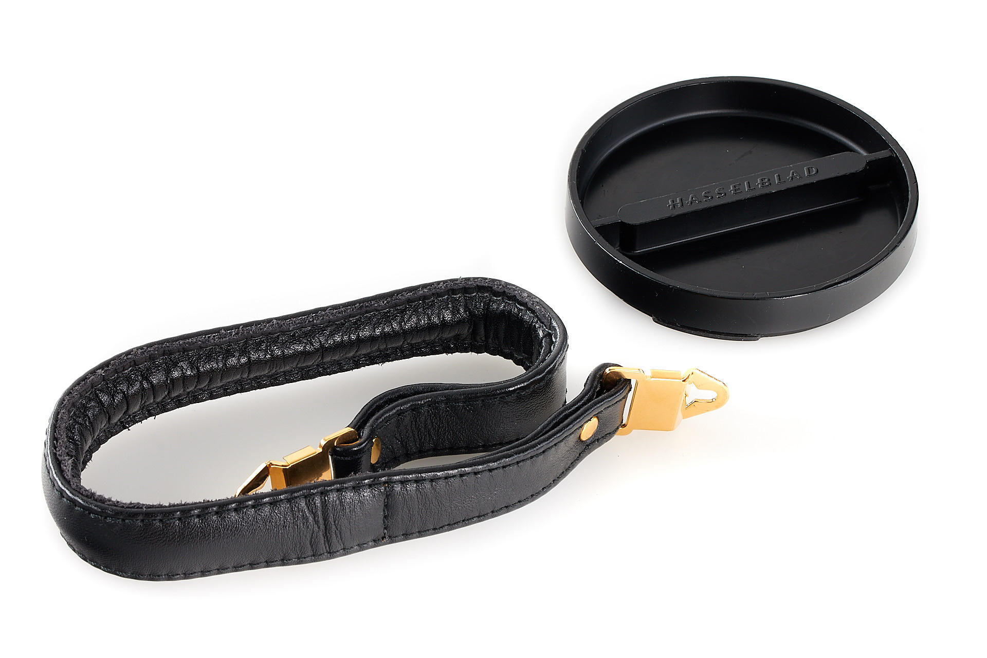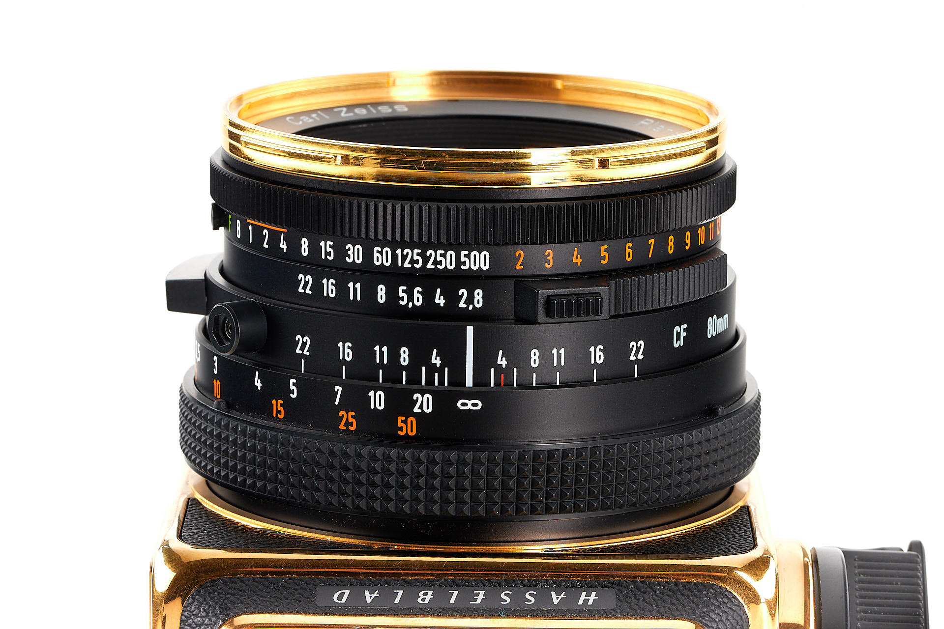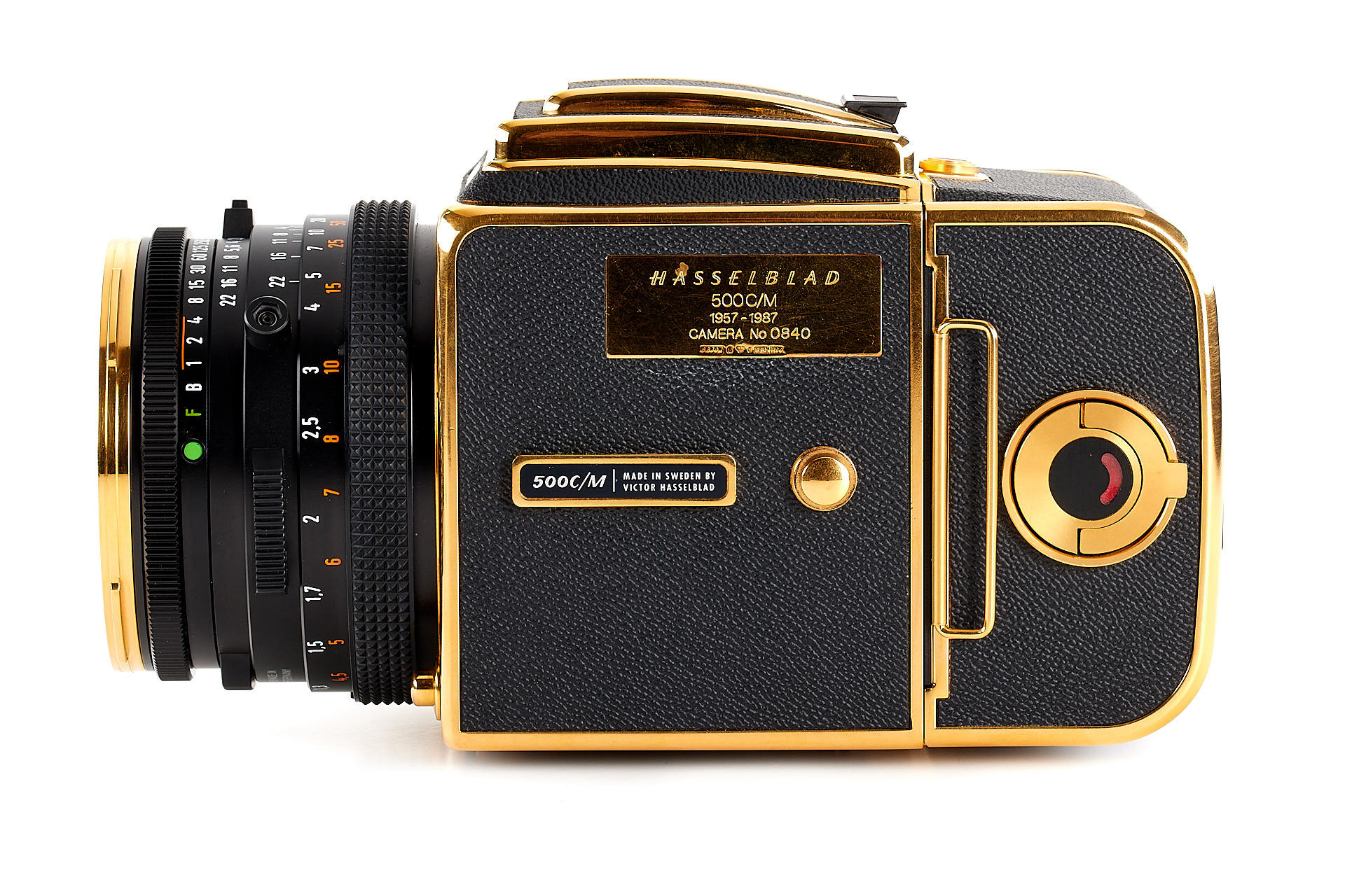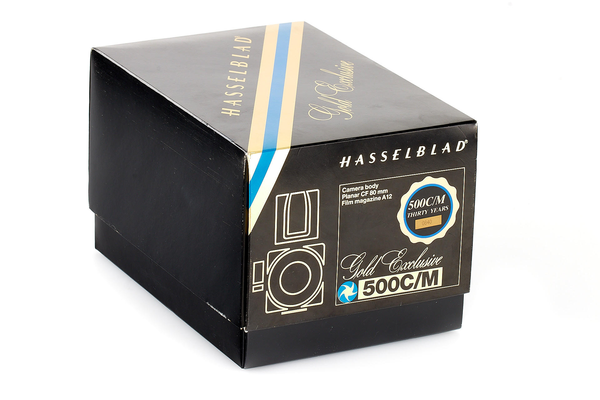 Very attractive gold plated edition released for the 30th anniversary of the 500C (special number 0840/1400), in mint condition, with gold plated CF Planar 2.8/80mm T* no.6954377, gold plated A12 magazine no.RT3300857, gold plated slider and strap, with maker's box