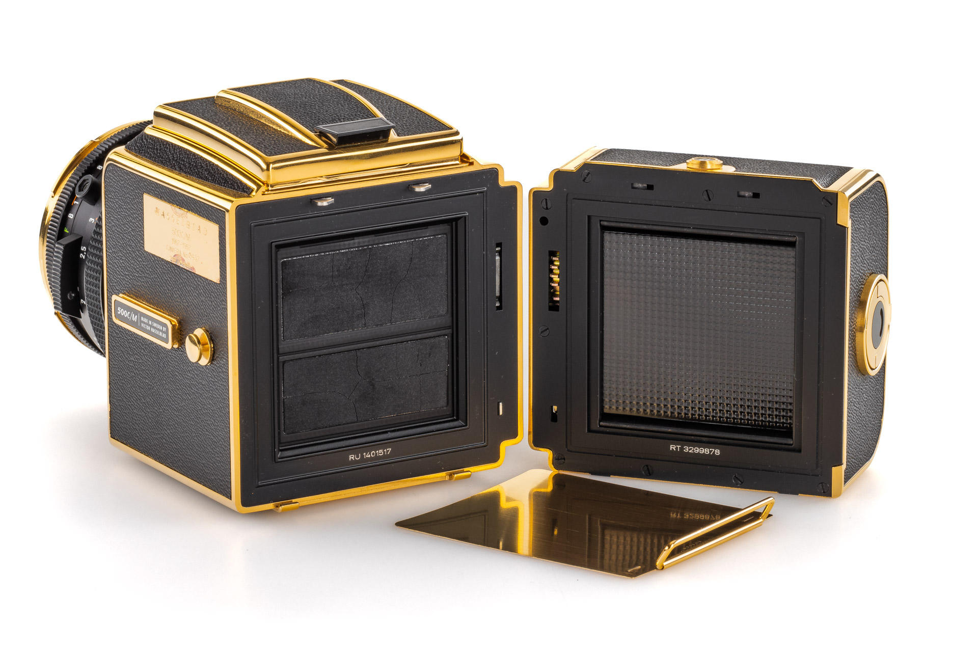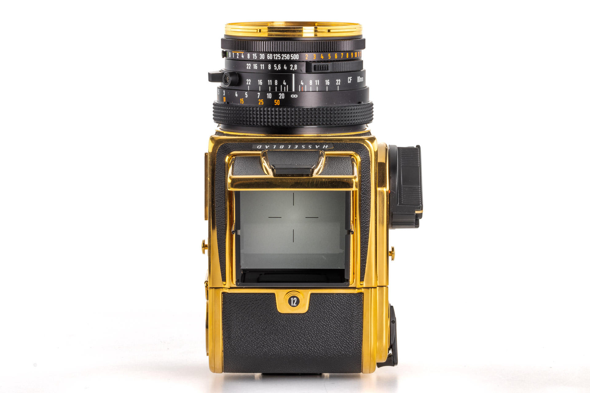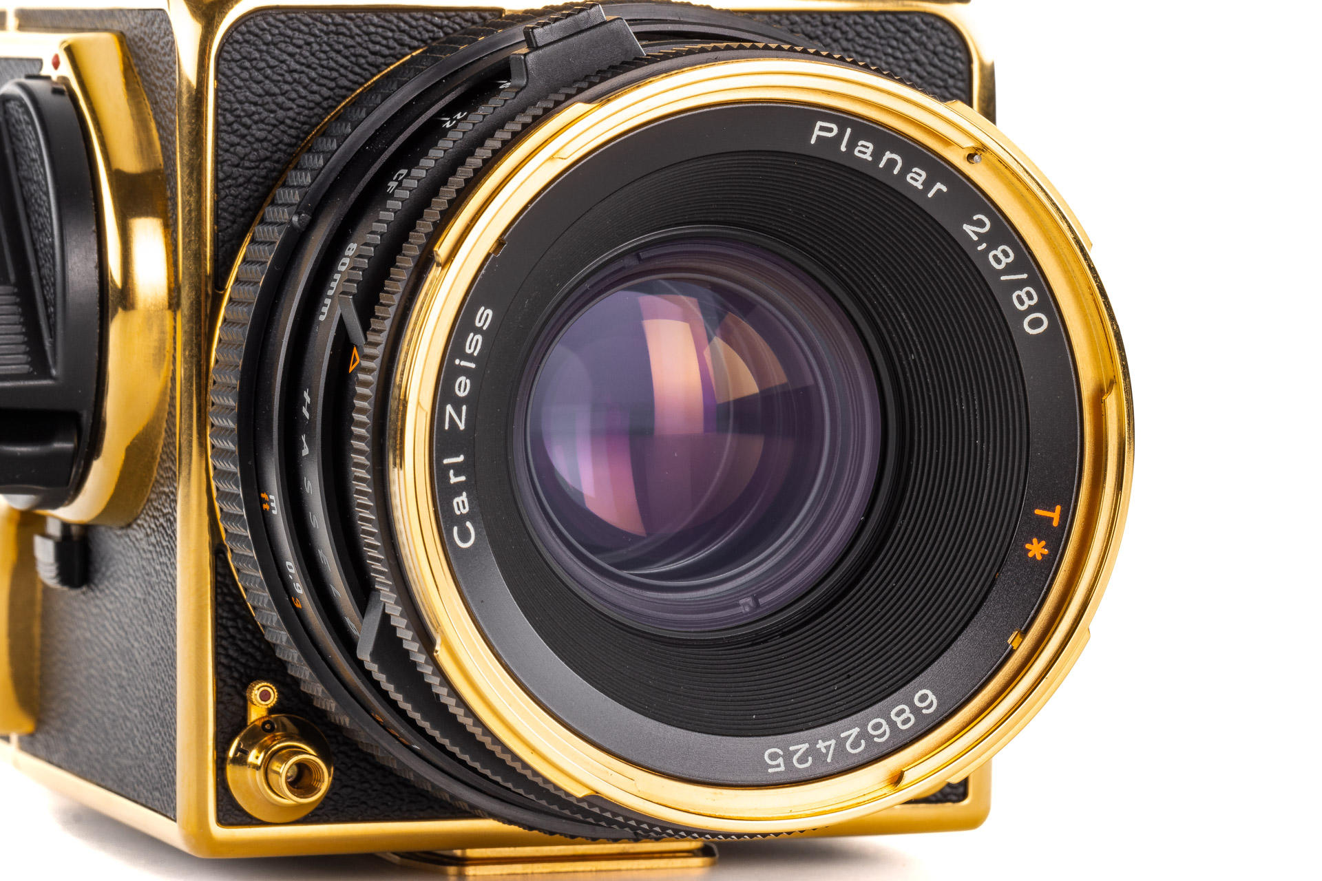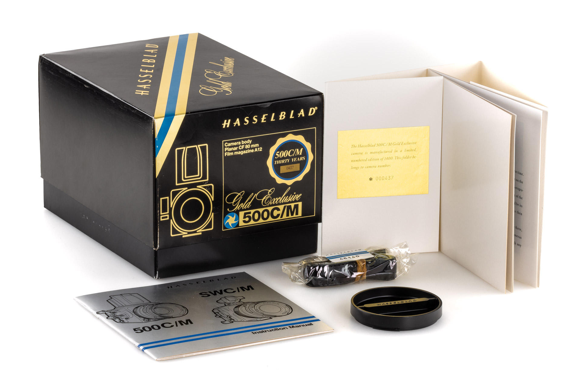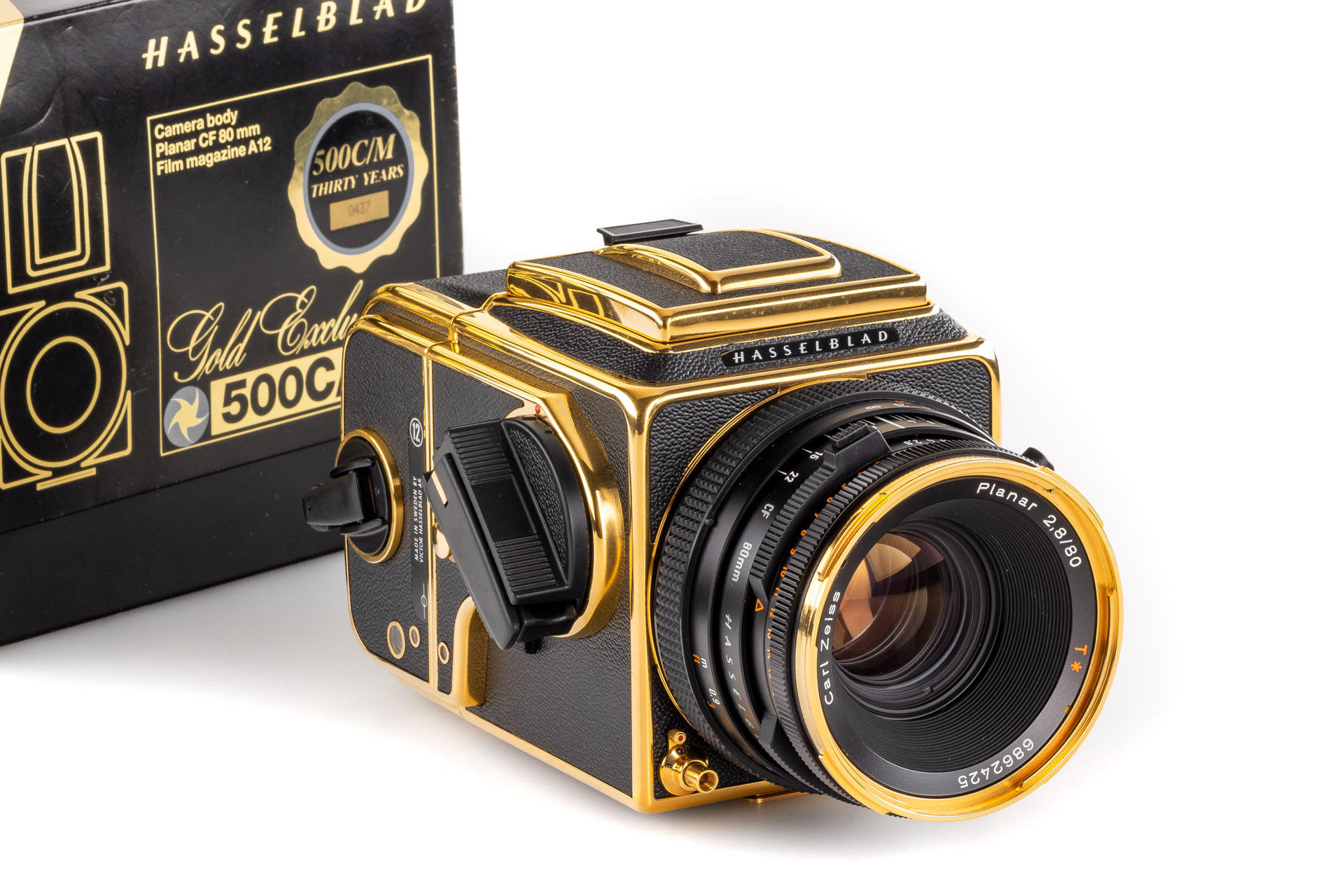 Very attractive gold-plated edition released for the 30th anniversary of the 500C (special number 0437/1400), in new condition, with gold plated CF Planar 2.8/80mm T* no.6862425, gold plated A12 magazine no.RT3299878, gold plated slider and strap, with instructions, certificate and maker's box