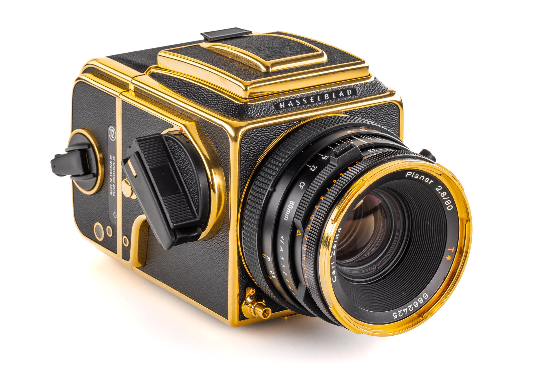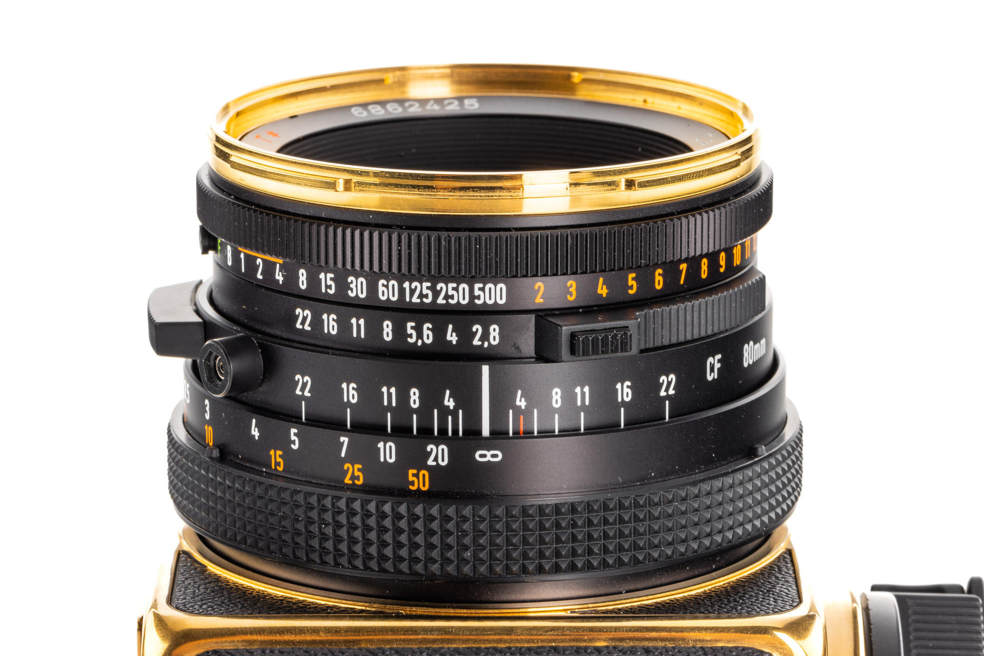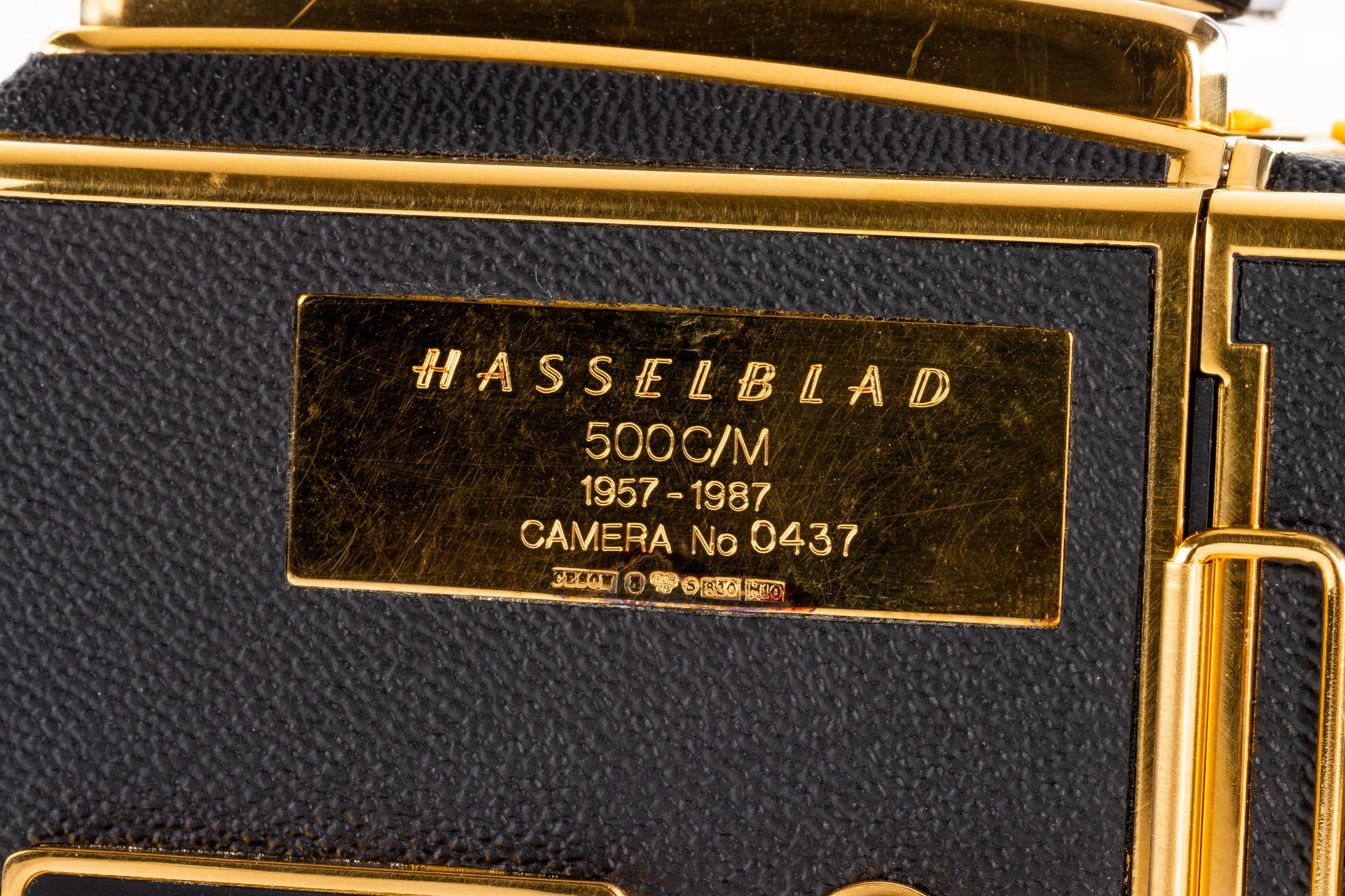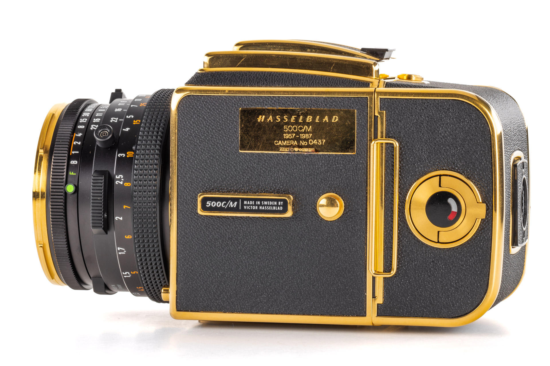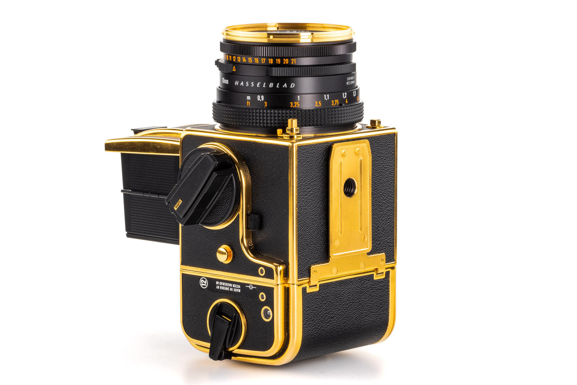 Very attractive gold-plated edition released for the 30th anniversary of the 500C (special number 0437/1400), in new condition, with gold plated CF Planar 2.8/80mm T* no.6862425, gold plated A12 magazine no.RT3299878, gold plated slider and strap, with instructions, certificate and maker's box