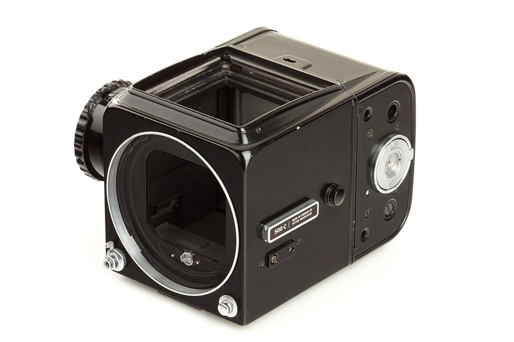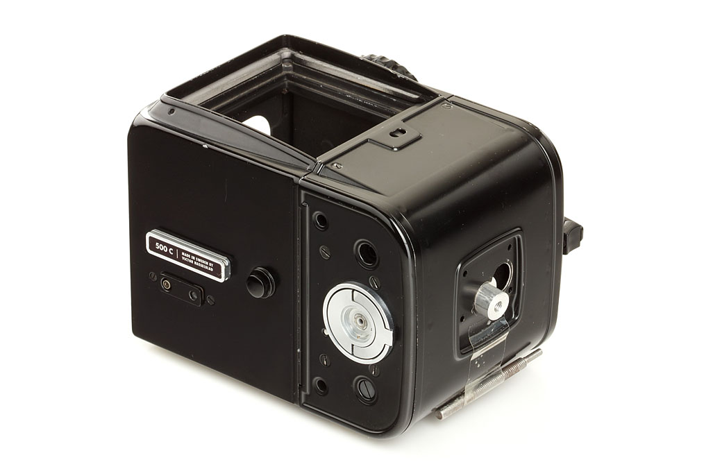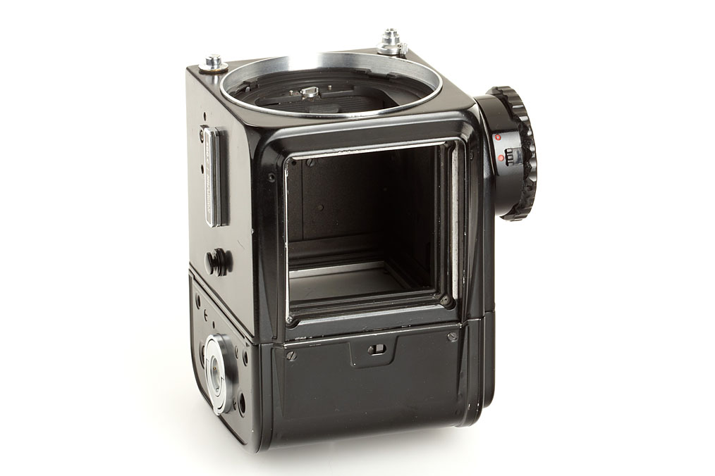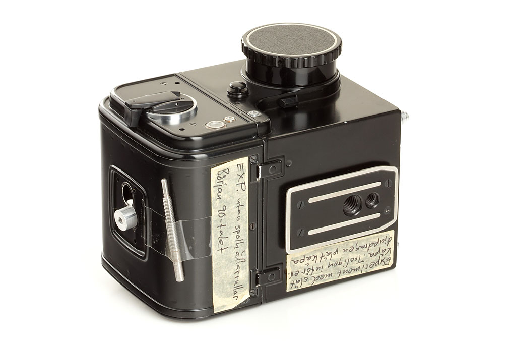 black painted body (like first NASA 500C) without shutter mechanism, on bottom a handwritten label: "Experiment med slät Käpa. Troligen införer. Diupdrasen plätkäpa", matching black painted magazine no.30EV26560, with handwritten label: "EXP. Utan spolkällarrullar Början 90-talet", both serial numbers are scratched out - a very rare and historic piece