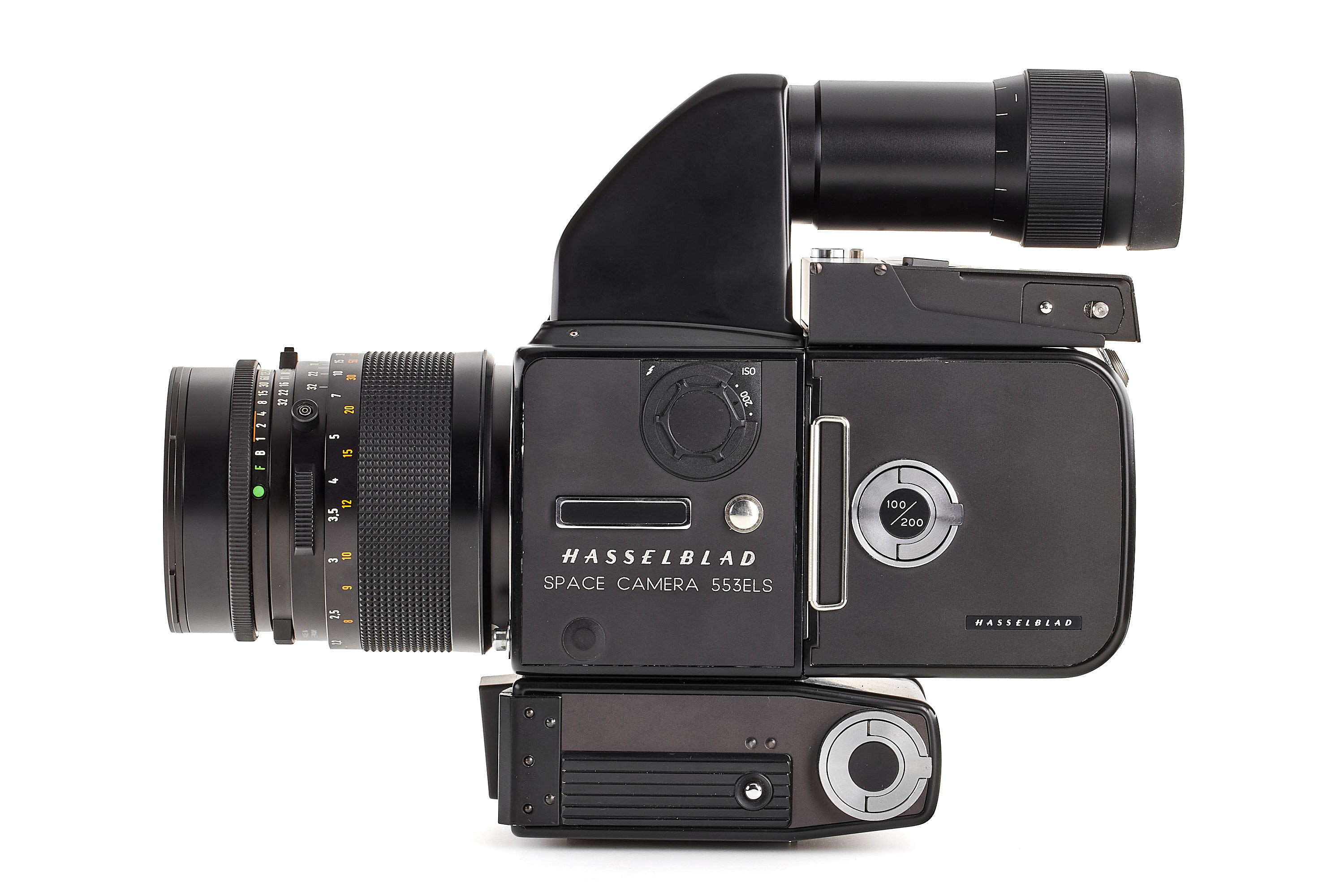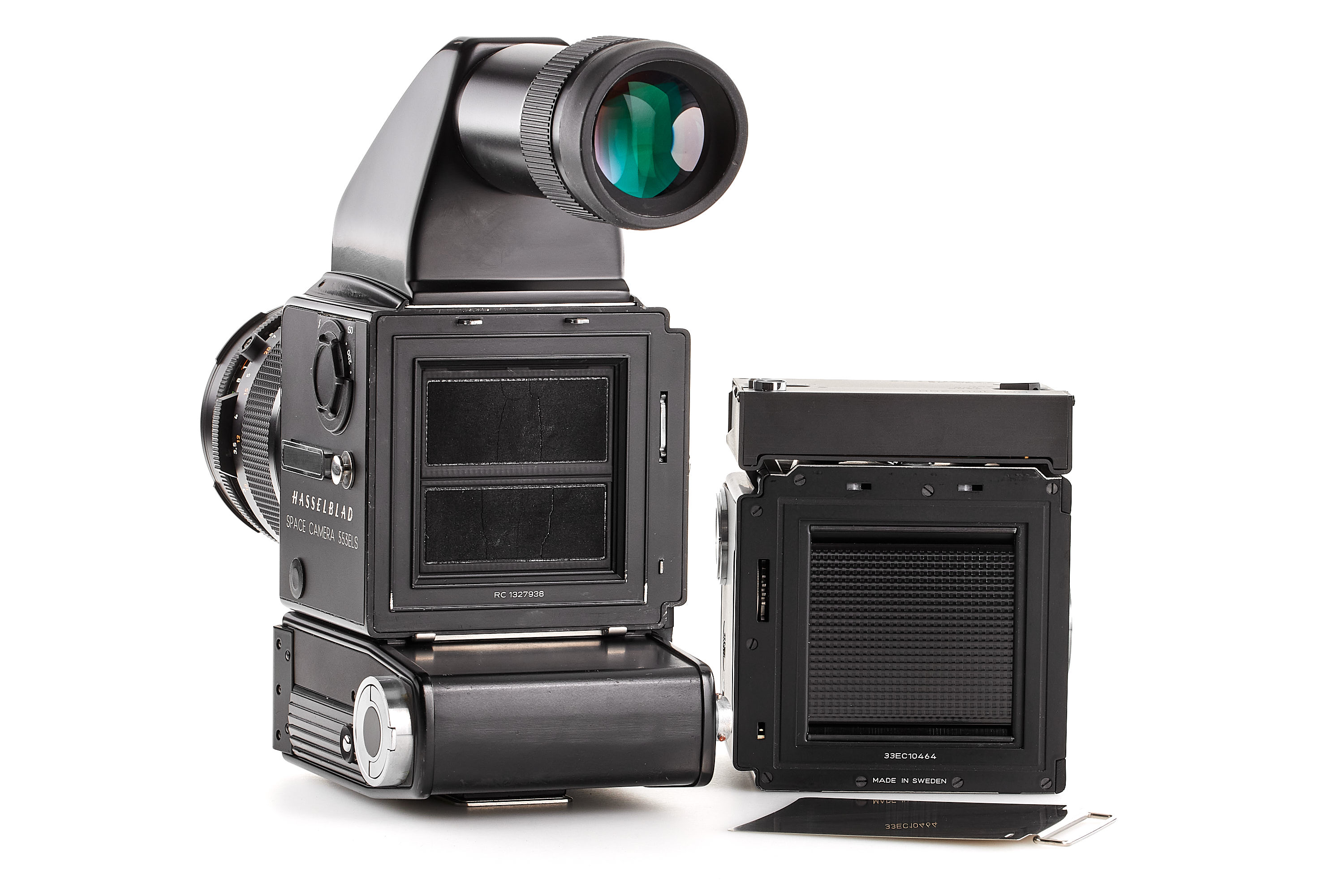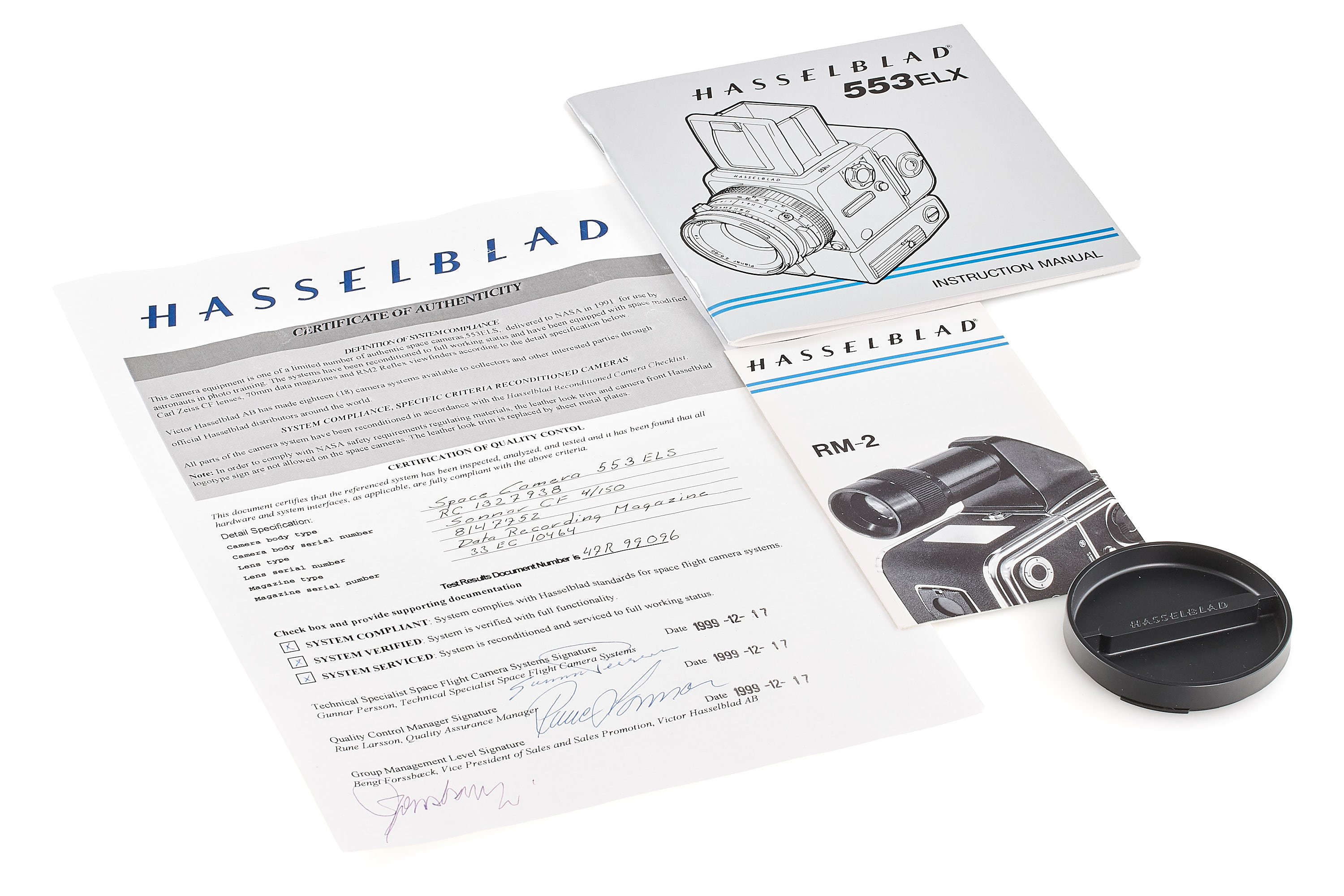 The ELS is a modified 553 ELX without flash control, the leather covering here is replaced by thin metal plates. This type camera was used in space shuttle missions at the beginning of the 90's. The film magazines are for perforated 70mm film and are provided with electronic dating - the picture number and time of each exposure are recorded. In 1991 a small number of the 553ELS were delivered to NASA. In 1999 Hasselblad company sold a series of only 18 cameras to collectors, the set on offer here is from this small series and consists of a Hasselblad Space Camera 553 ELS no.RC1327938, 70mm Data magazine no.33EC10464 with DE-32, Sonnar CF 4/150mm no.8147752 adapted for space conditions, RM-2 reflex viewfinder, cap, Hasselblad certificate of authenticity, instructions and special fitted case, all in almost mint condition and in working order.