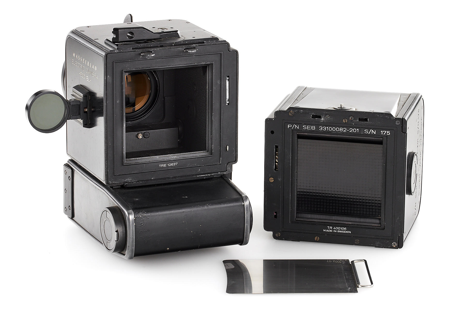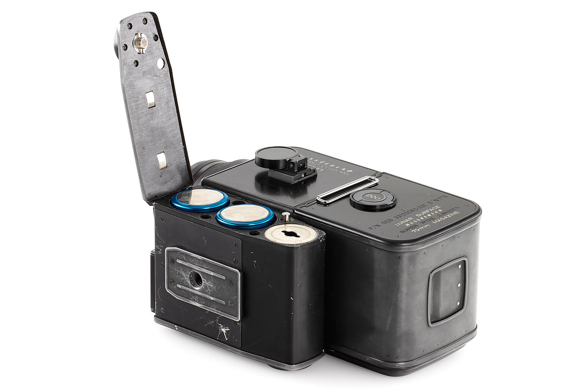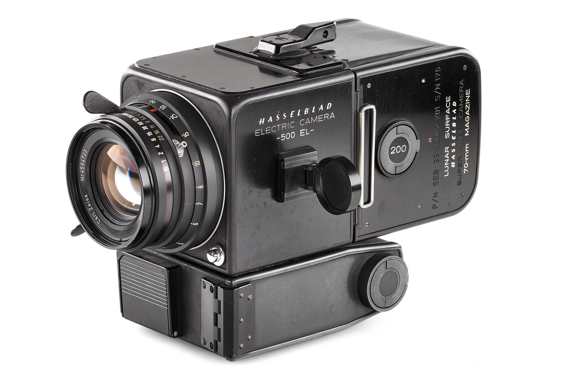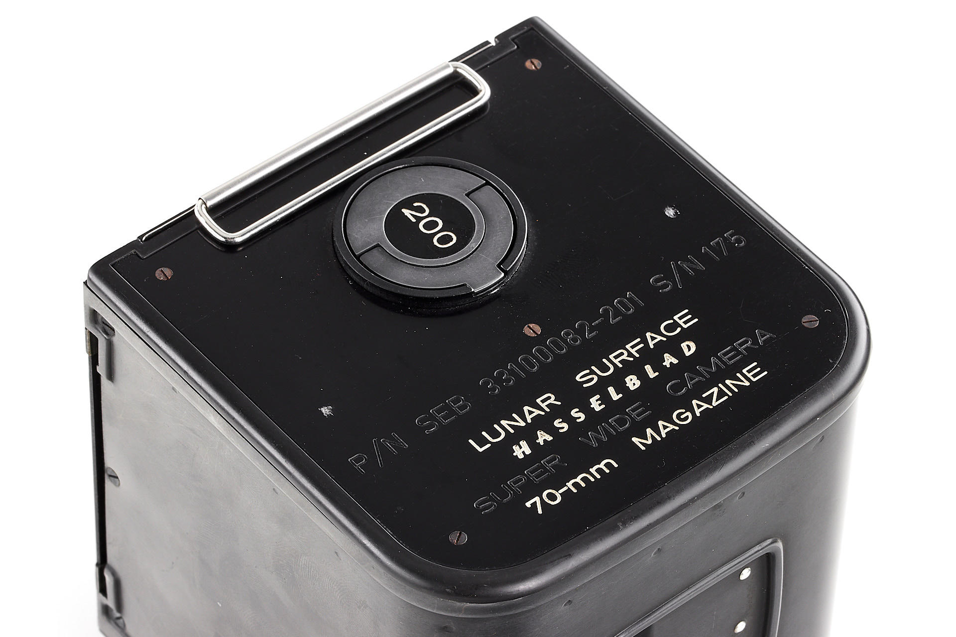 very rare, early authentic for NASA modified 500 EL/M with black anodised finish (original camera, not a replica), pre-runner of the later produced HEC (Hasselblad Electric Camera) for the Apollo Lunar missions. It is from the first generation NASA motor-driven cameras which were also taken on the manned voyage which passed close to the moon on December 21st to 27th,1968. During this voyage 10 orbits of the moon were made, the purpose being to survey future landing sites. Along with other modifications the camera mirror was removed to reduce weight. A special large locking mechanism was added in order to change film magazines with bulky space gloves on. Similarly a larger, sturdier shutter release plate was added to the camera. It comes with a special NASA Planar 2.8/80mm no.4594723 with matching black anodised finish with large control tabs, also designed for use with space gloves, a black 70mm magazine no.TR400106 S/N 175, engraved: P/N SEB 33100082-201 S/N 175 SUPER WIDE CAMERA