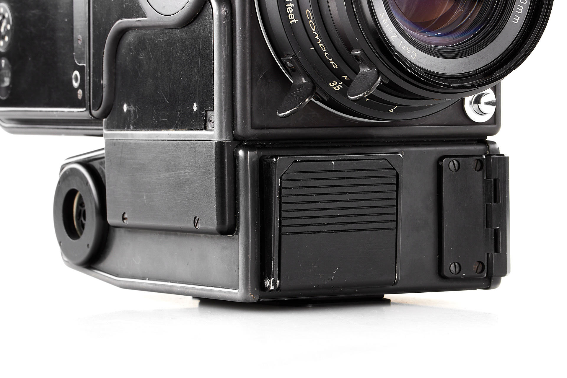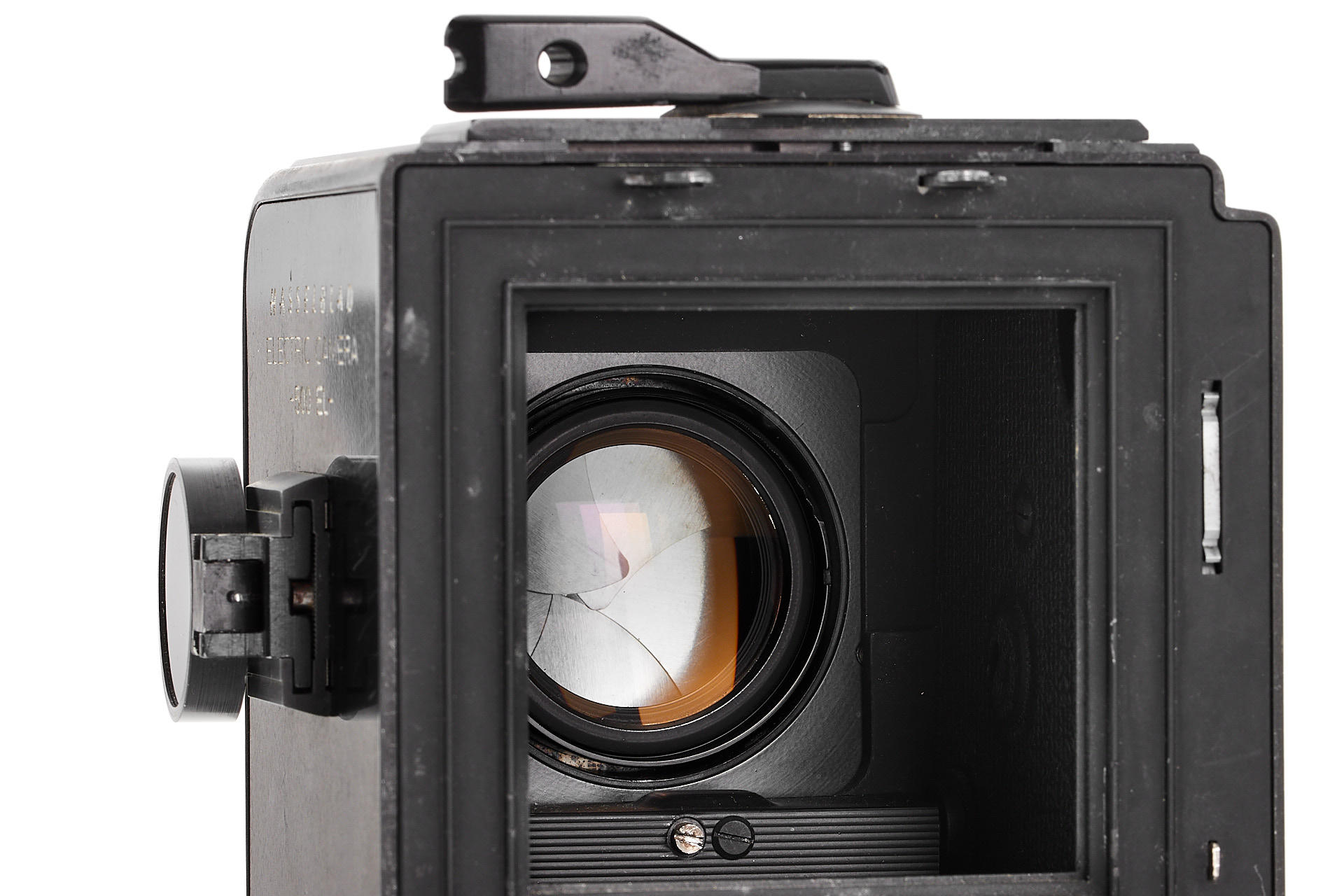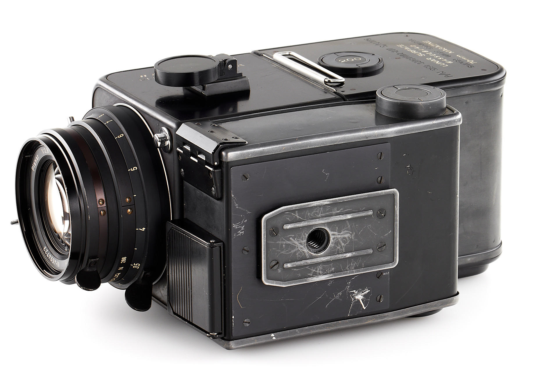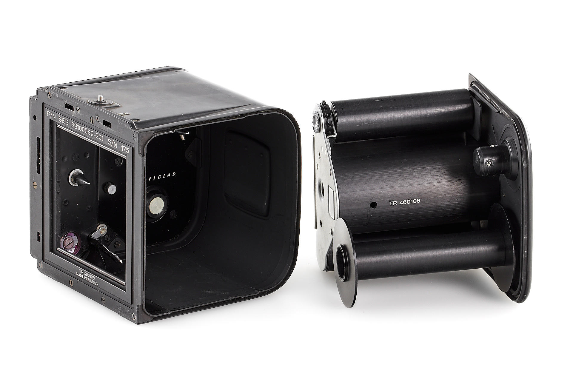 very rare, early authentic for NASA modified 500 EL/M with black anodised finish (original camera, not a replica), pre-runner of the later produced HEC (Hasselblad Electric Camera) for the Apollo Lunar missions. It is from the first generation NASA motor-driven cameras which were also taken on the manned voyage which passed close to the moon on December 21st to 27th,1968. During this voyage 10 orbits of the moon were made, the purpose being to survey future landing sites. Along with other modifications the camera mirror was removed to reduce weight. A special large locking mechanism was added in order to change film magazines with bulky space gloves on. Similarly a larger, sturdier shutter release plate was added to the camera. It comes with a special NASA Planar 2.8/80mm no.4594723 with matching black anodised finish with large control tabs, also designed for use with space gloves, a black 70mm magazine no.TR400106 S/N 175, engraved: P/N SEB 33100082-201 S/N 175 SUPER WIDE CAMERA