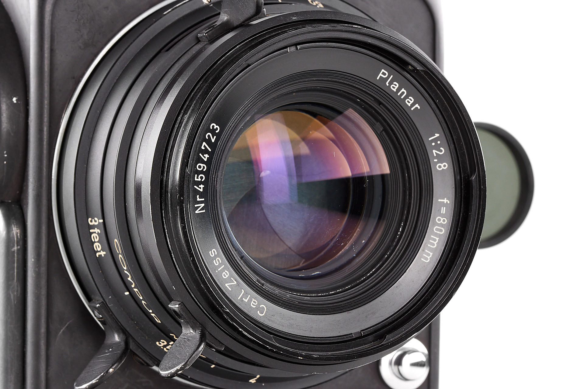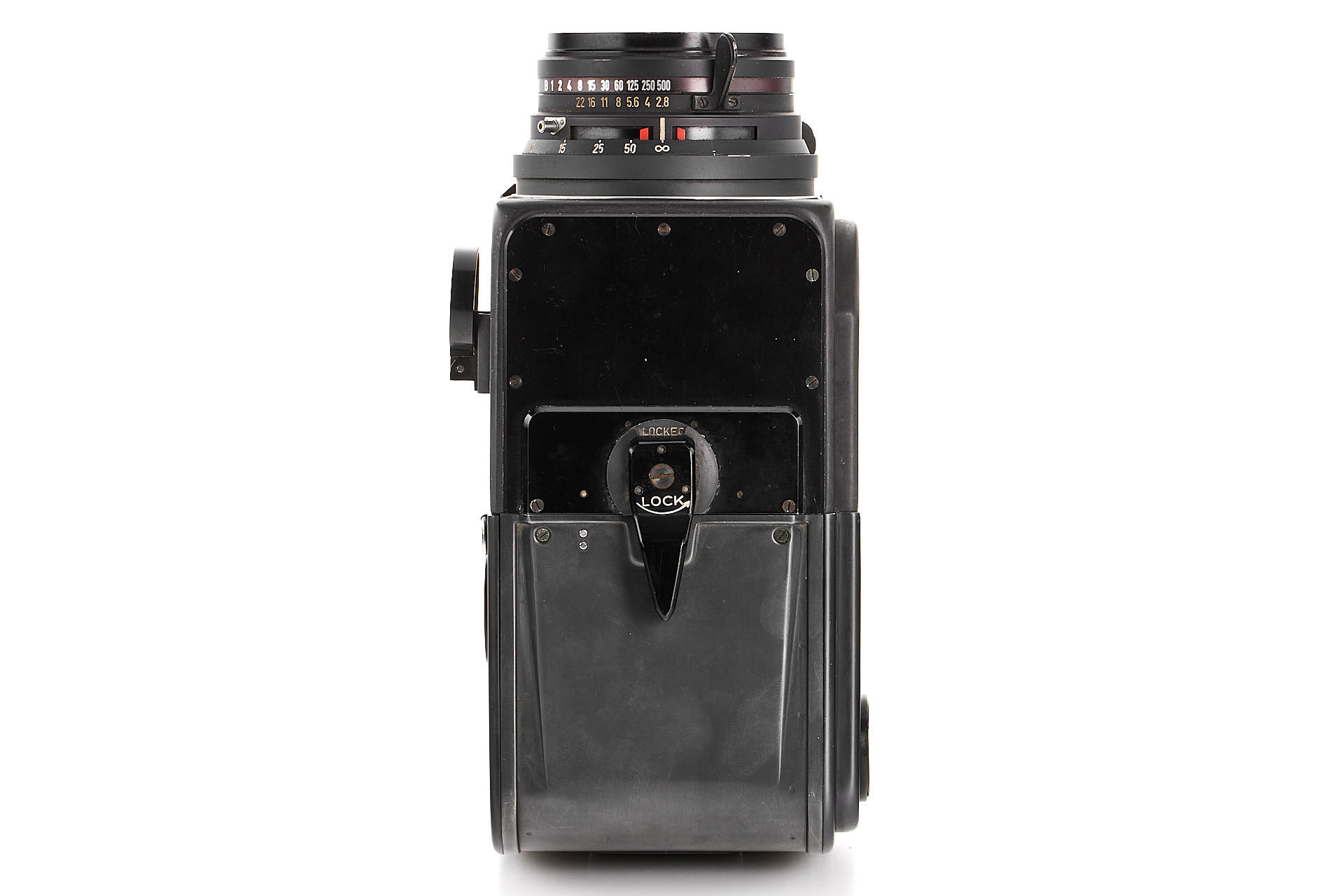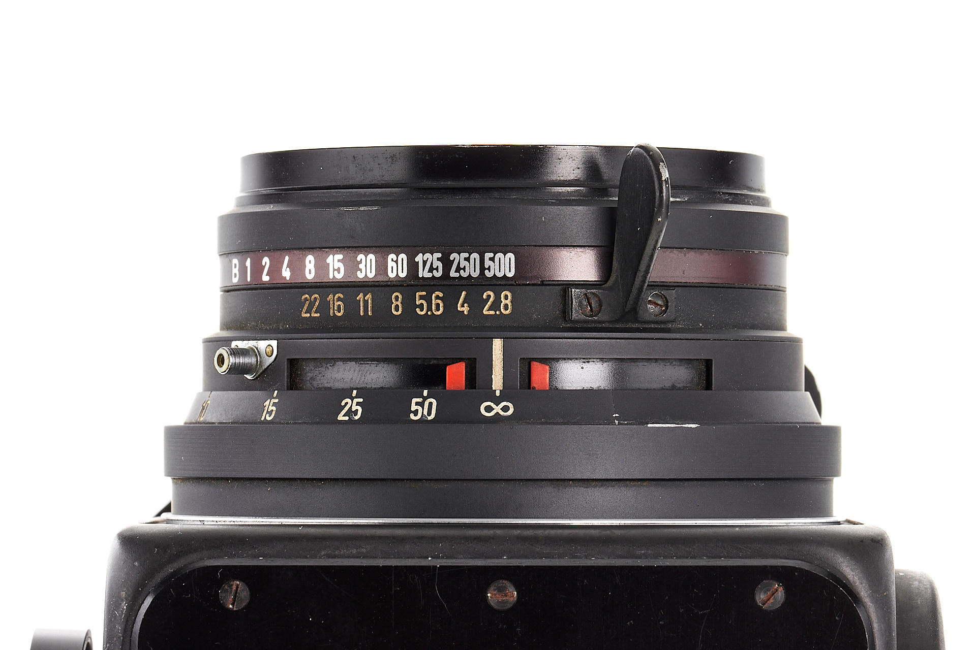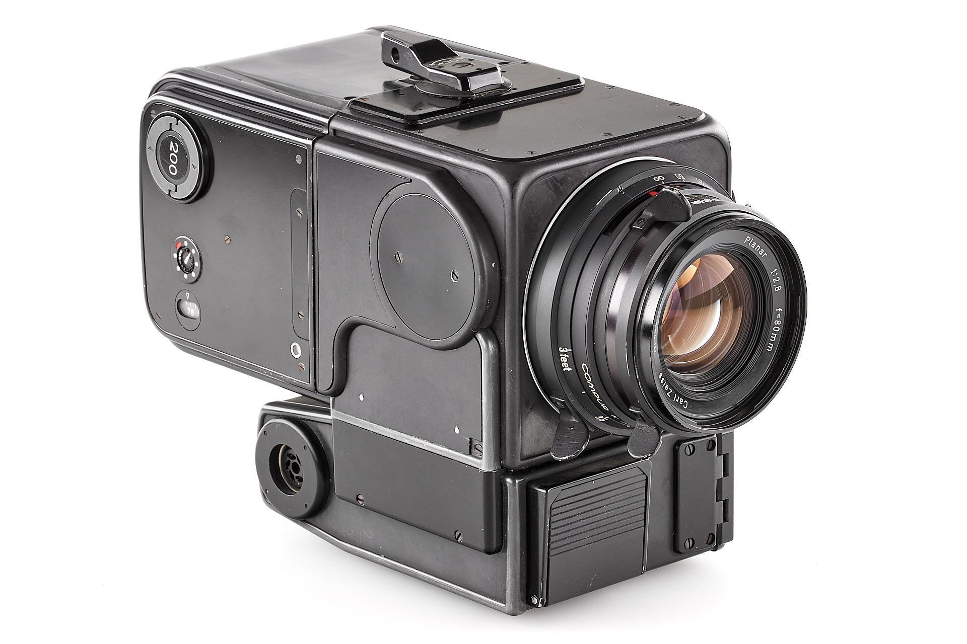 very rare, early authentic for NASA modified 500 EL/M with black anodised finish (original camera, not a replica), pre-runner of the later produced HEC (Hasselblad Electric Camera) for the Apollo Lunar missions. It is from the first generation NASA motor-driven cameras which were also taken on the manned voyage which passed close to the moon on December 21st to 27th,1968. During this voyage 10 orbits of the moon were made, the purpose being to survey future landing sites. Along with other modifications the camera mirror was removed to reduce weight. A special large locking mechanism was added in order to change film magazines with bulky space gloves on. Similarly a larger, sturdier shutter release plate was added to the camera. It comes with a special NASA Planar 2.8/80mm no.4594723 with matching black anodised finish with large control tabs, also designed for use with space gloves, a black 70mm magazine no.TR400106 S/N 175, engraved: P/N SEB 33100082-201 S/N 175 SUPER WIDE CAMERA