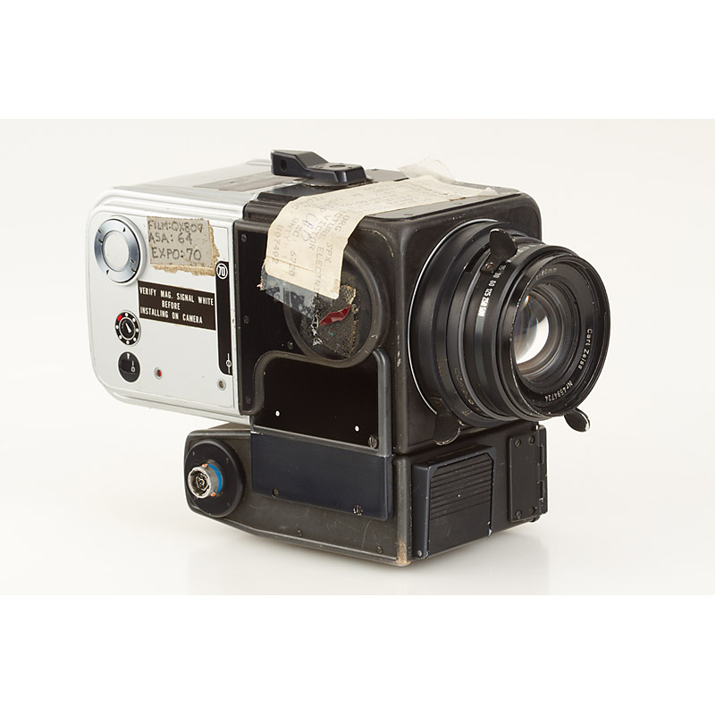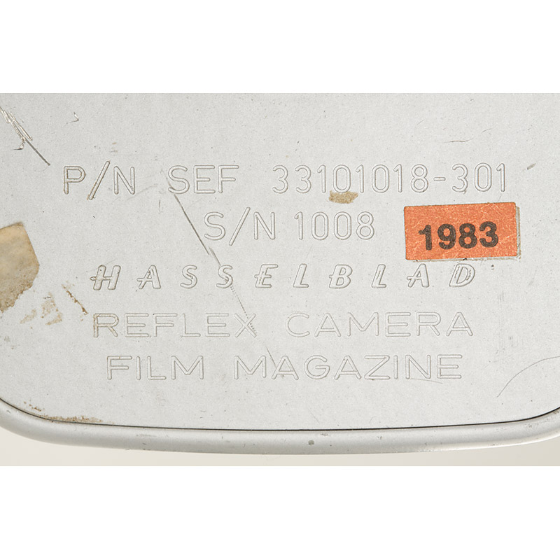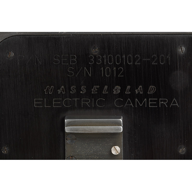 very rare, early authentic for NASA modified 500 EL/M with black anodised finish (original camera, not a replica), pre-runner of the later produced HEC (Hasselblad Electric Camera) for the Apollo Lunar missions. It is from the first generation NASA motor-driven cameras which were also taken on the manned voyage which passed close to the moon on December 21st to 27th,1968. During this voyage 10 orbits of the moon were made, the purpose being to survey future landing sites. Along with other modifications the camera mirror was removed to reduce weight. A special large locking mechanism was added in order to change film magazines with bulky space gloves on. Similarly a larger, sturdier shutter release plate was added to the camera. It comes with a special NASA Planar 2.8/80mm no.4594724 with matching black anodised finish with control tabs, also designed for use with space gloves, a silver 70mm magazine no.UI310744 S/N 1008, engraved: P/N SEF 33101018-301 S/N 1008 REFLEX CAMERA FILM MAGAZINE, several stickers and NASA inventory stickers, the body engraved: P/N SEB 33100102-201 S/N 1012 HASSELBLAD ELECTRIC CAMERA - also included the new book by Alain Lazzarini - Hasselblad and the Moon