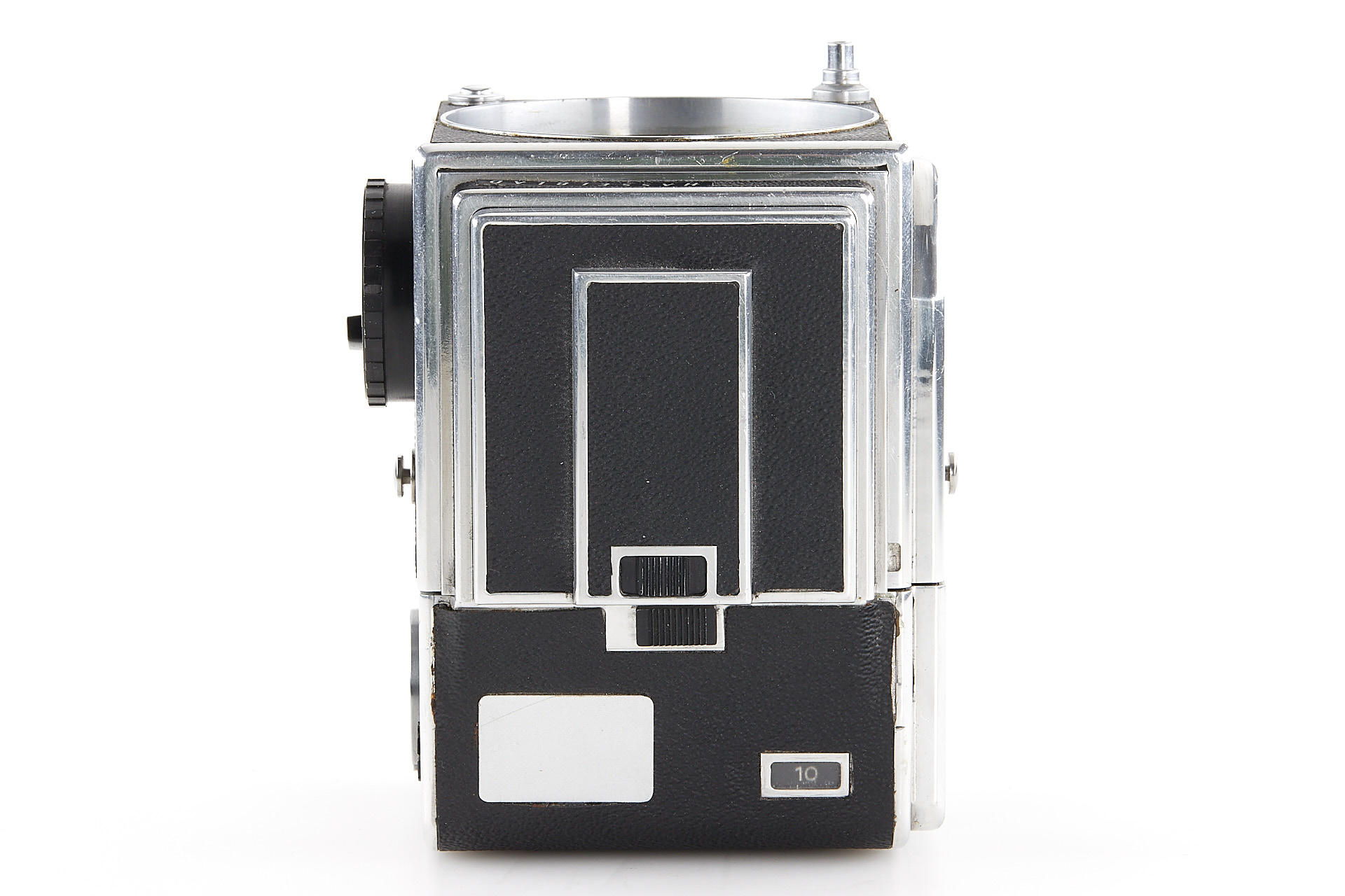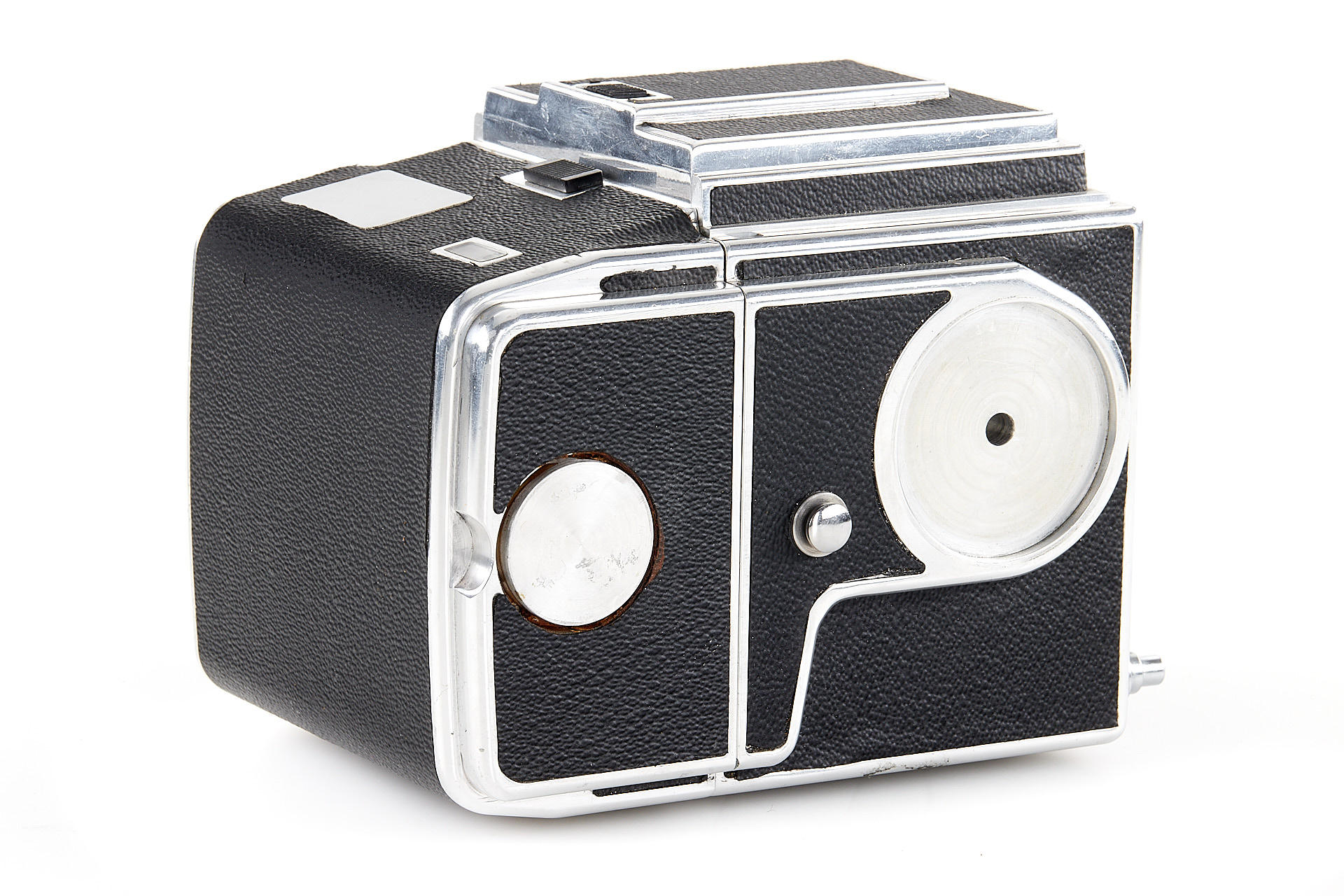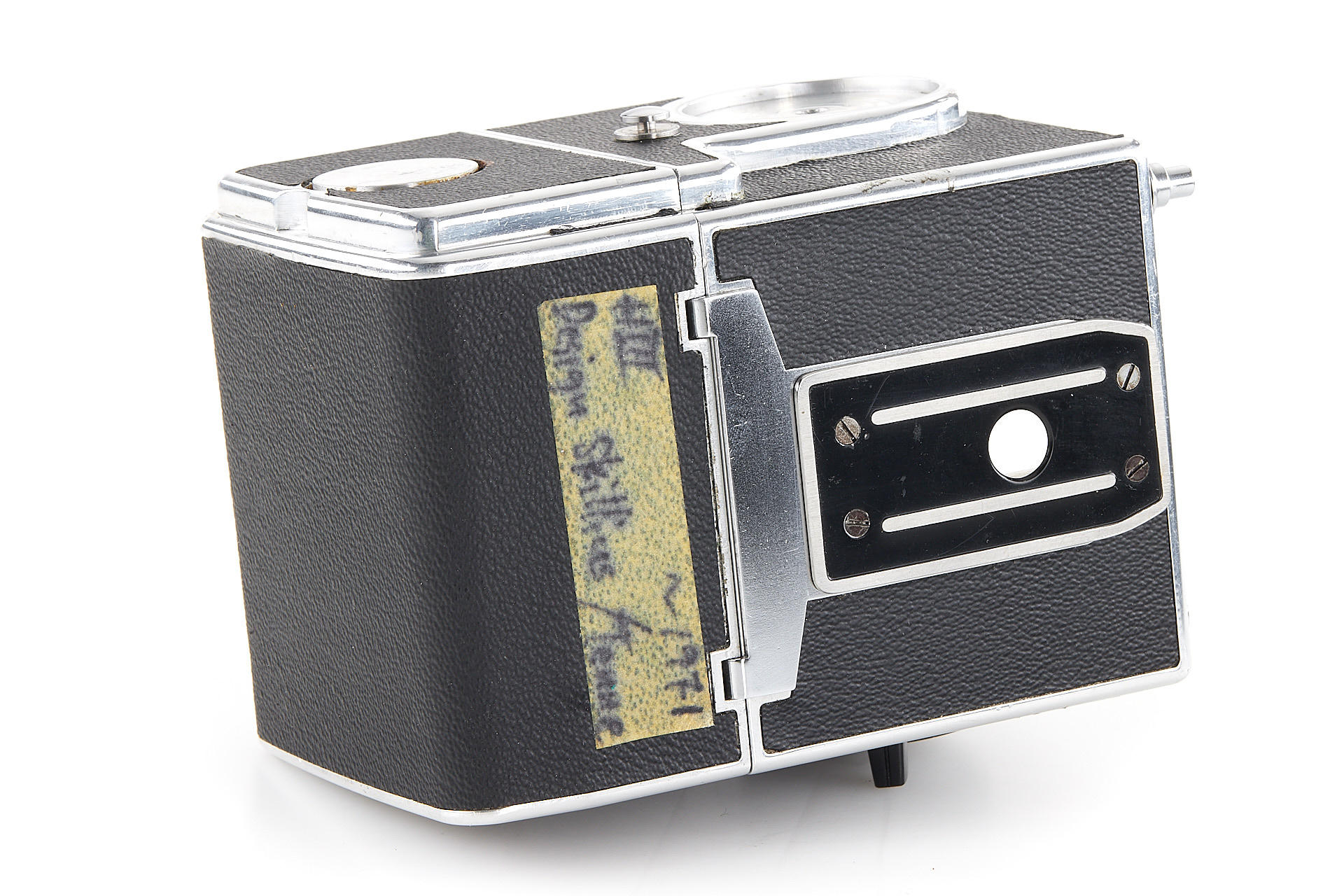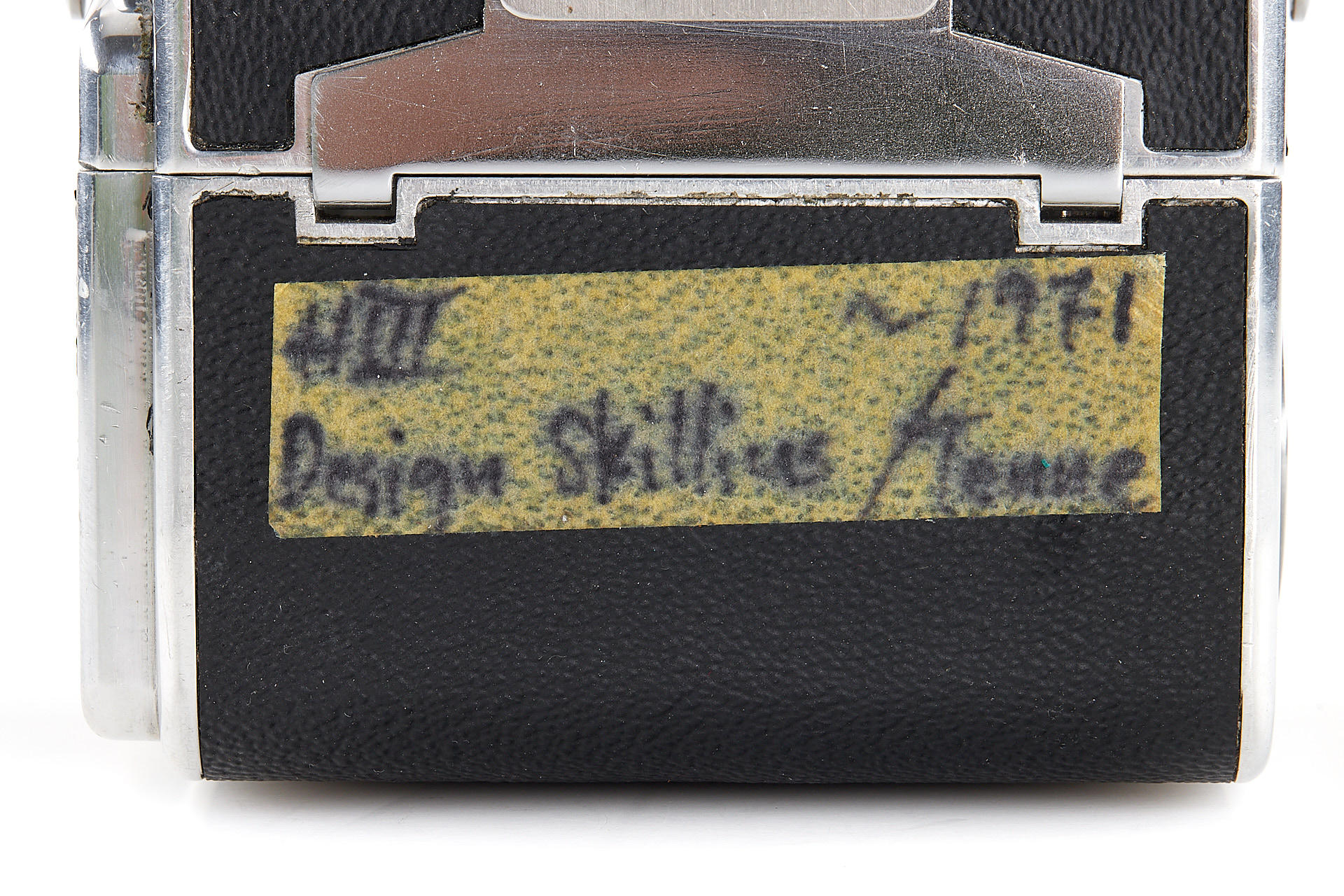 Very interesting Hasselblad prototype made of milled aluminium, in mint condition, note the unusual finder shape and winding crank on the left, sticker on the down side of the magazine with handwritten 'HIII ~1971 Design Skillius/Tenne'