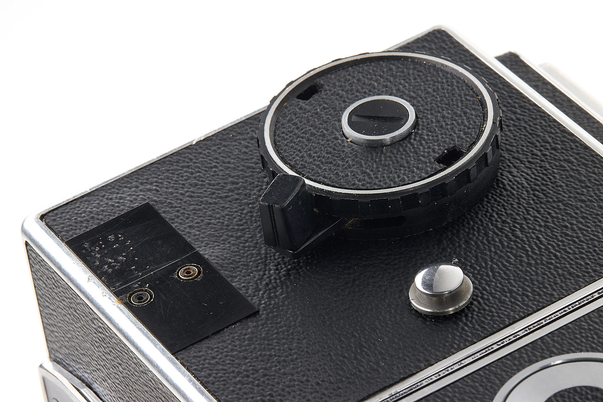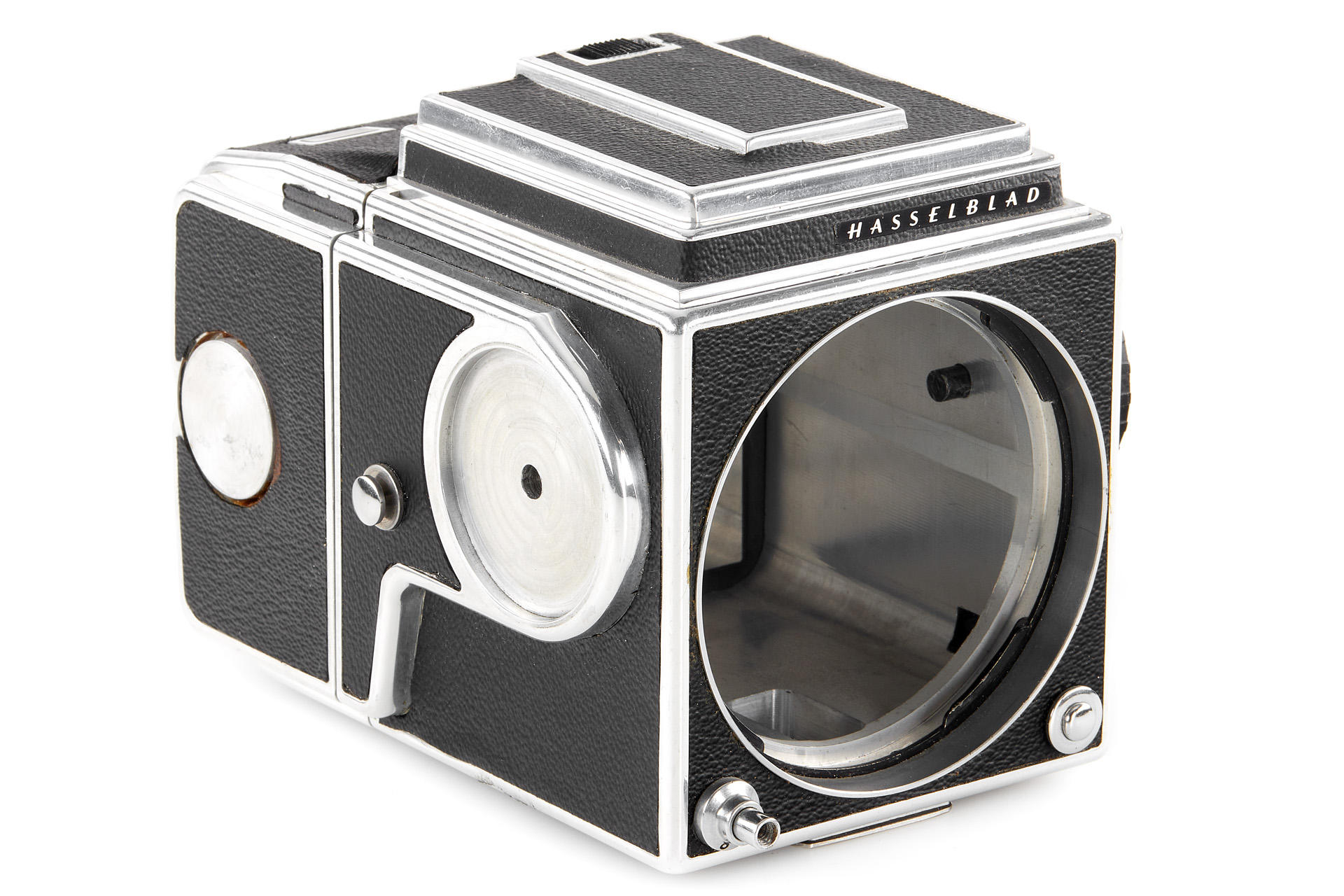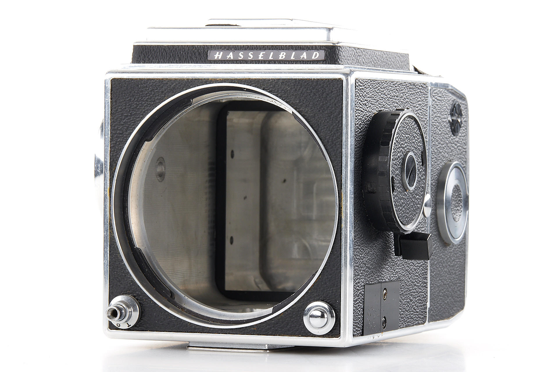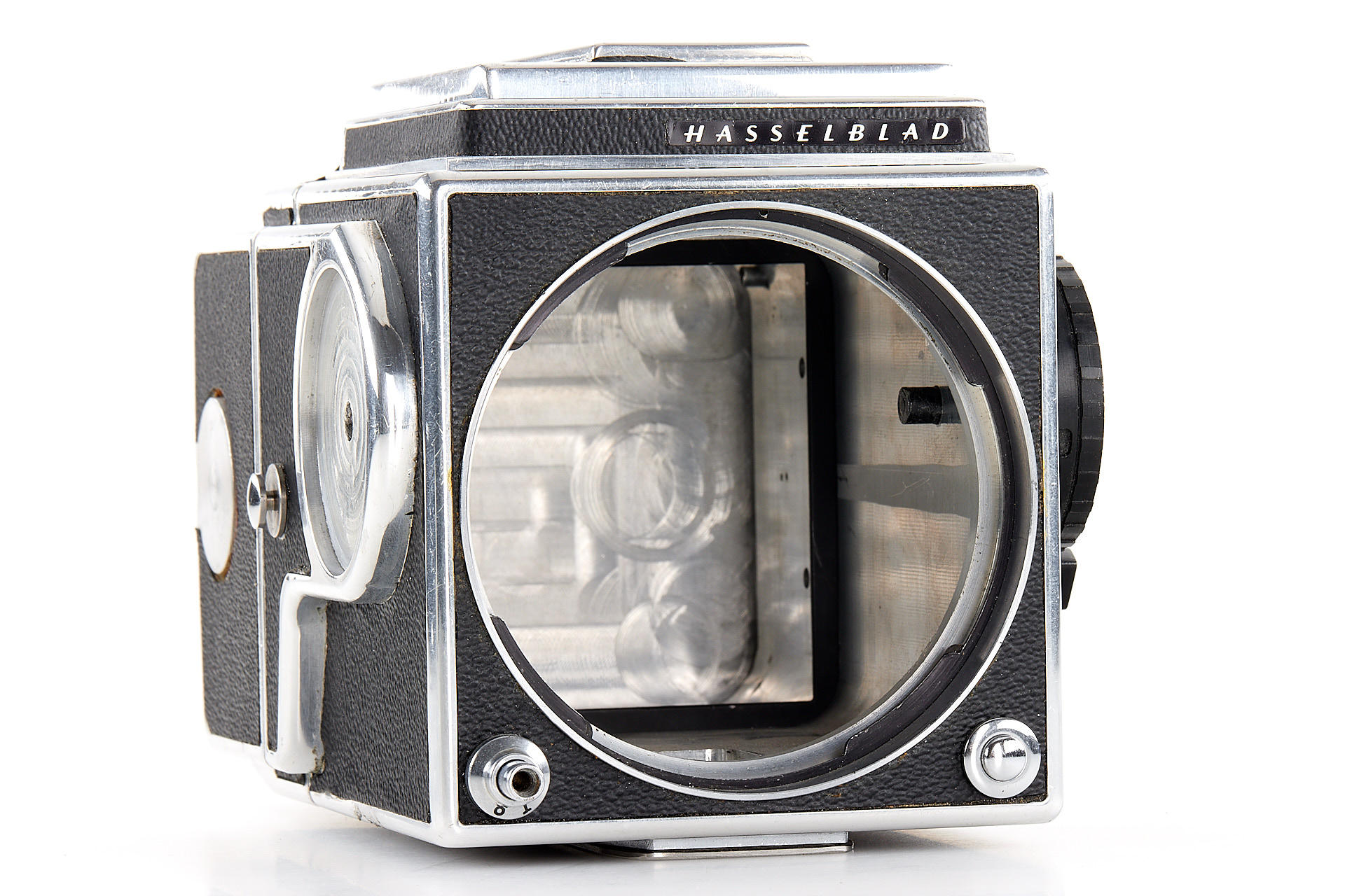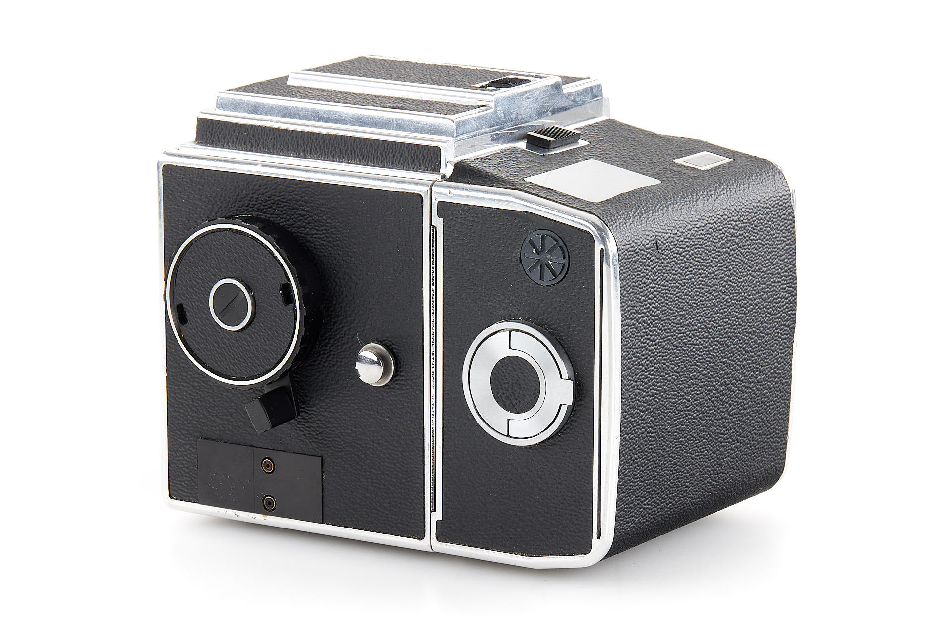 Very interesting Hasselblad prototype made of milled aluminium, in mint condition, note the unusual finder shape and winding crank on the left, sticker on the down side of the magazine with handwritten 'HIII ~1971 Design Skillius/Tenne'