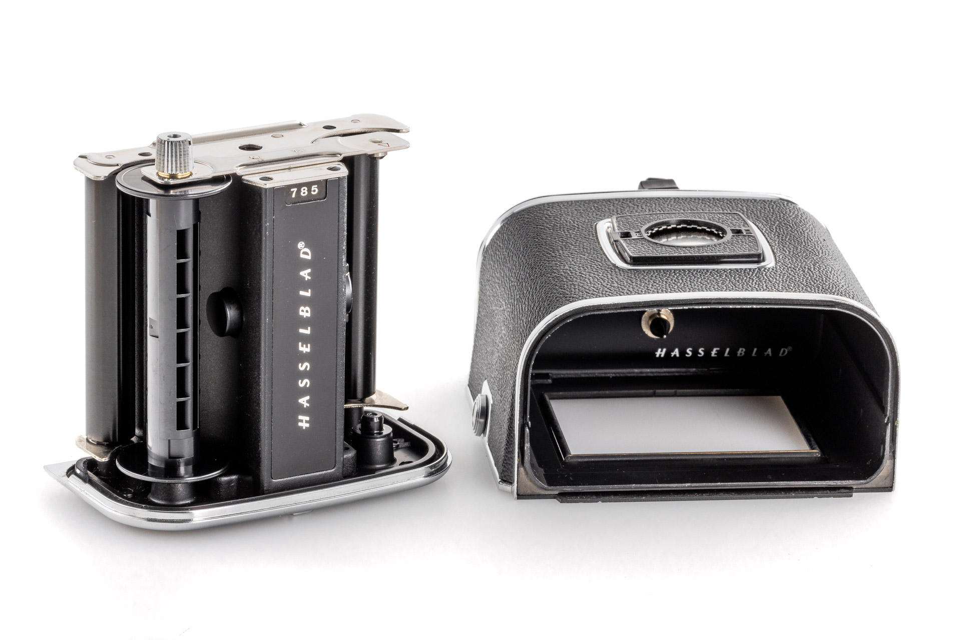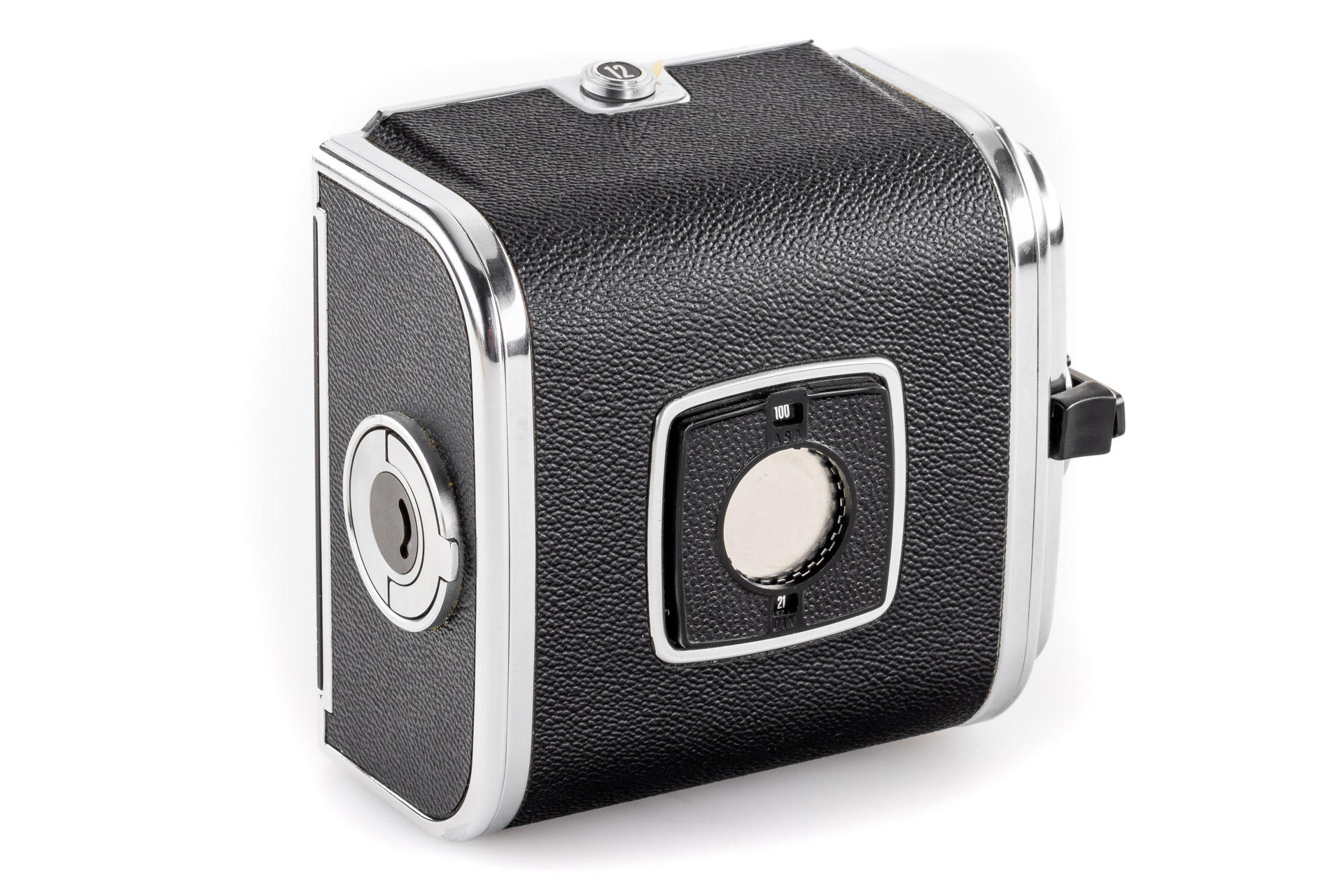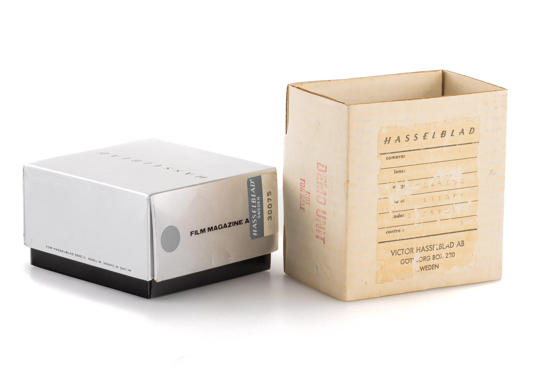 very rare film magazine for 12 vertical 4.5x6cm pictures on 120 rollfilm, in mint condition, with slider, matching insert, maker's box and an interesting outer box with "demo unit - not for sale" (different serial number)