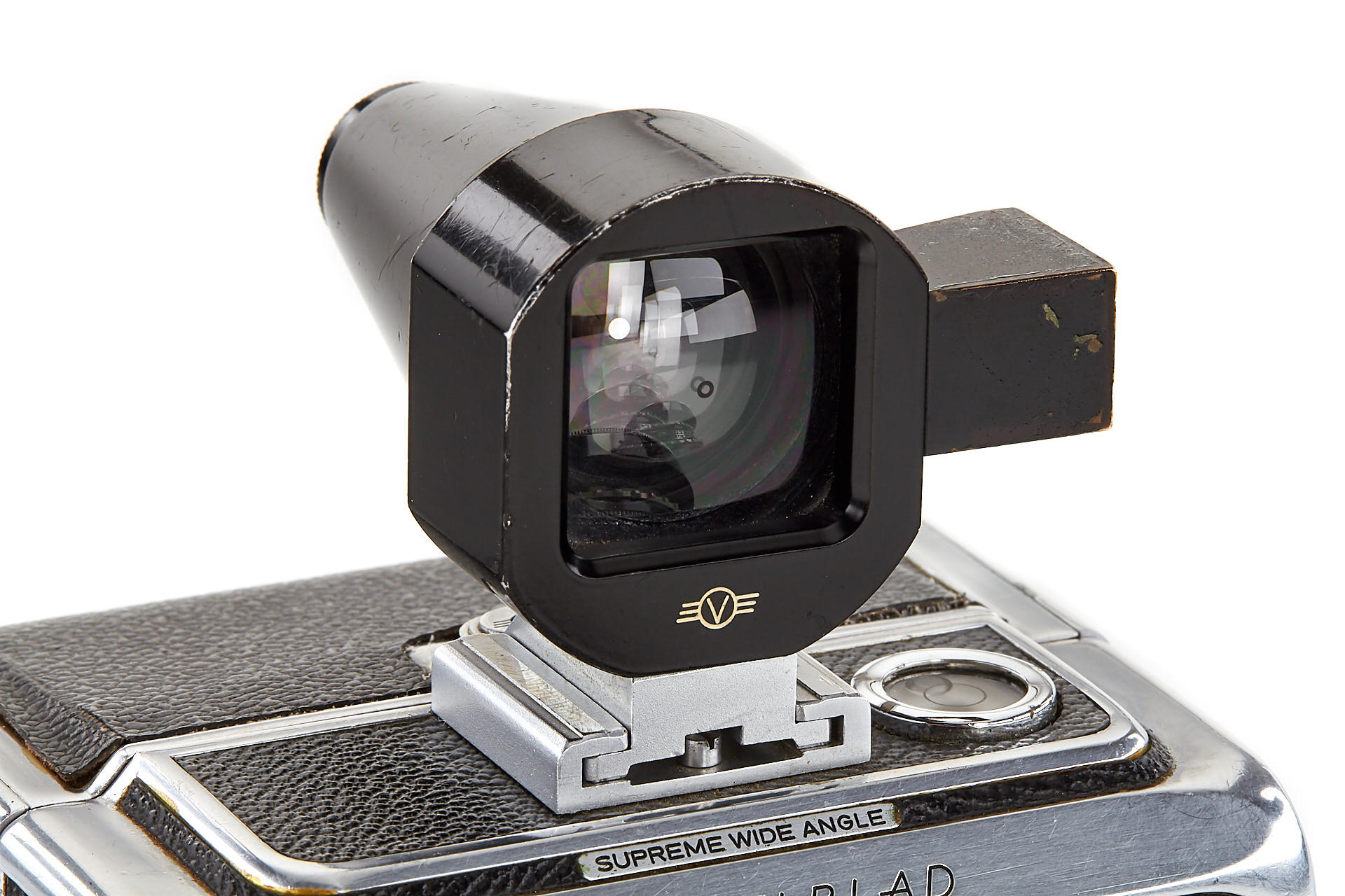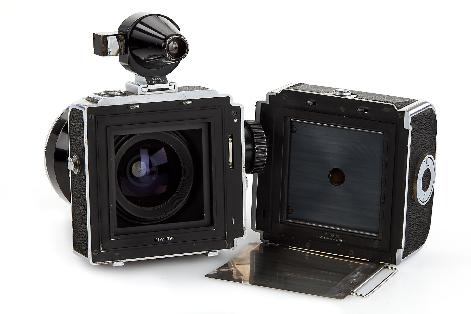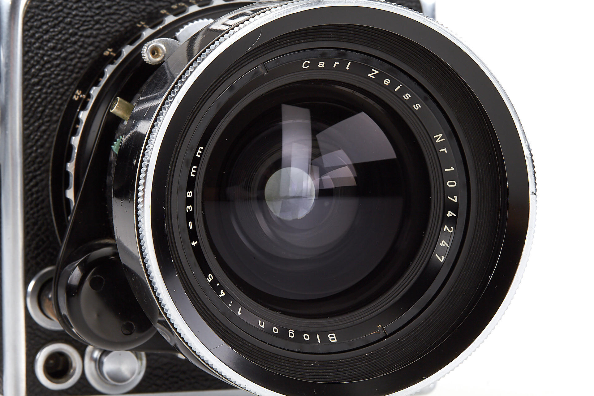 first version wide angle Hasselblad, with Biogon 4.5/38mm no.1074247 (good optics), original finder, in very good cosmetic condition and in perfect working order, incl. A12 magazine no.CP16505, filter adapter and lens cap