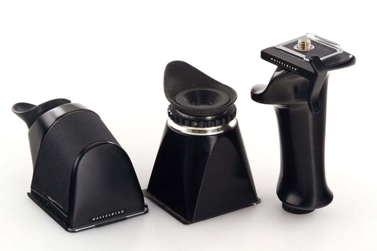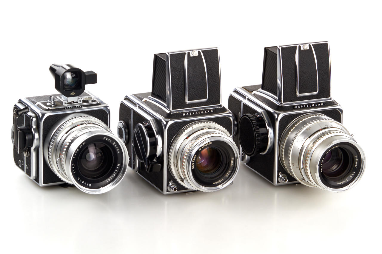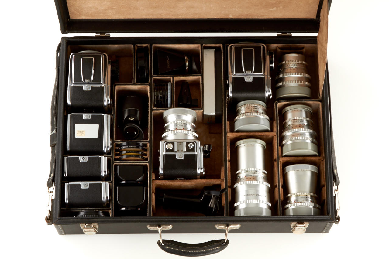 fantastic Hasselblad outfit with three cameras, five chrome lenses and accessories: Super Wide C no.TTW6847 (cond. A/B, with A12 magazine no.TC92328, matching finder, cap), early 500 C/M no.UP141069 (cond. B, with A24 magazine no.TE254683, body cap), 500 C no.TC63756 (A12 magazine, body cap), Distagon 4/50mm no.5300953 (caps), Planar 2.8/80mm no.4203550 (caps), S-Planar 5.6/120mm no.4166333 (caps), Sonnar 4/150mm no.3872562 (caps), Sonnar 5.6/250mm no.2586514 (caps), A70 magazine no.TR304127, A12 magazine no.TT95257, A24 magazine no.RR3536920, rare hood for Super Wide C, hoods for 80mm and 150mm, prism finder, magnifying finder, 9 filters, vertical grip, flash holder, two straps and instructions - all in fine condition stored in rare fitted large original Hasselblad outfit case