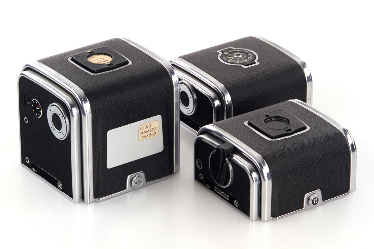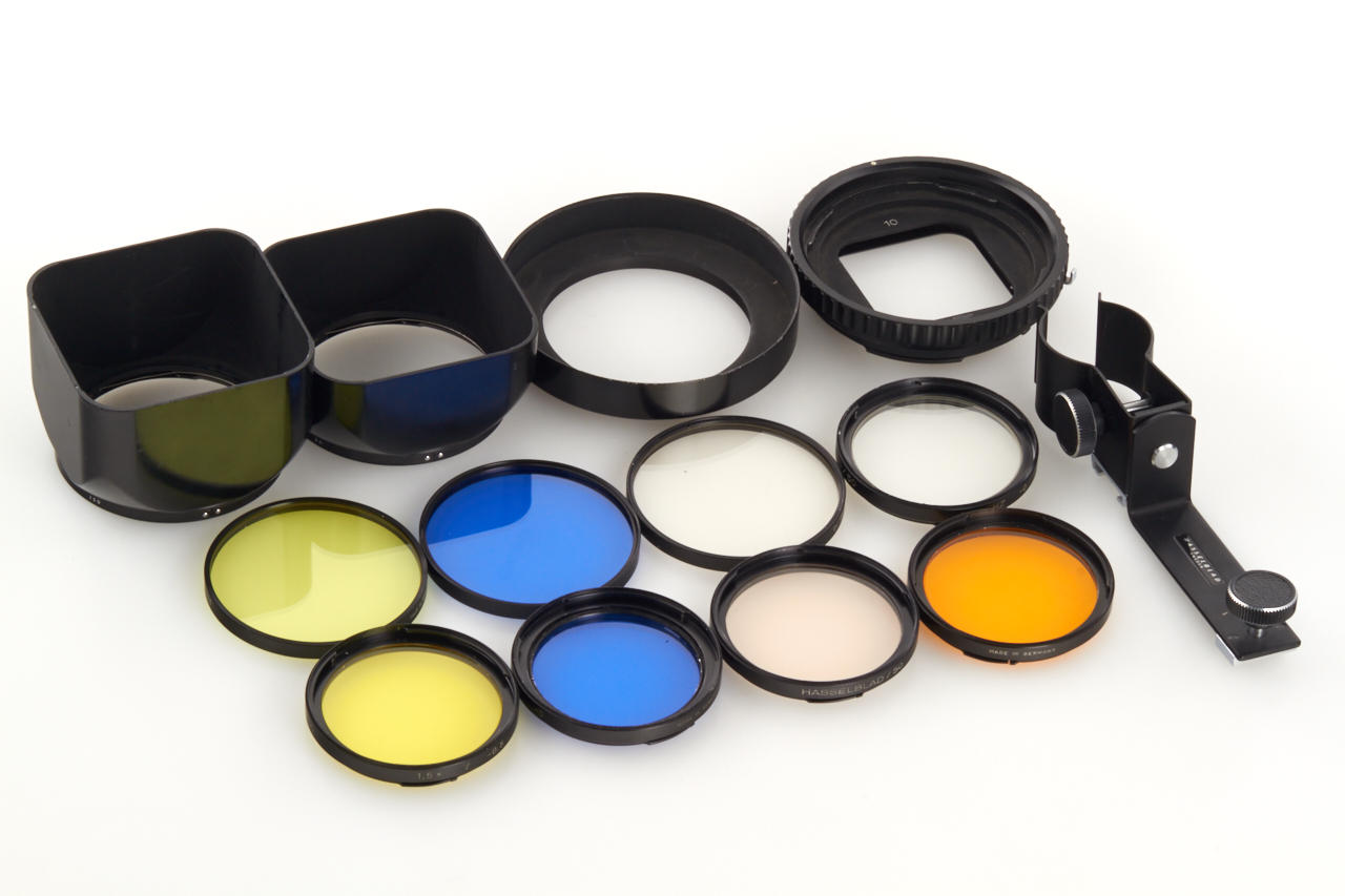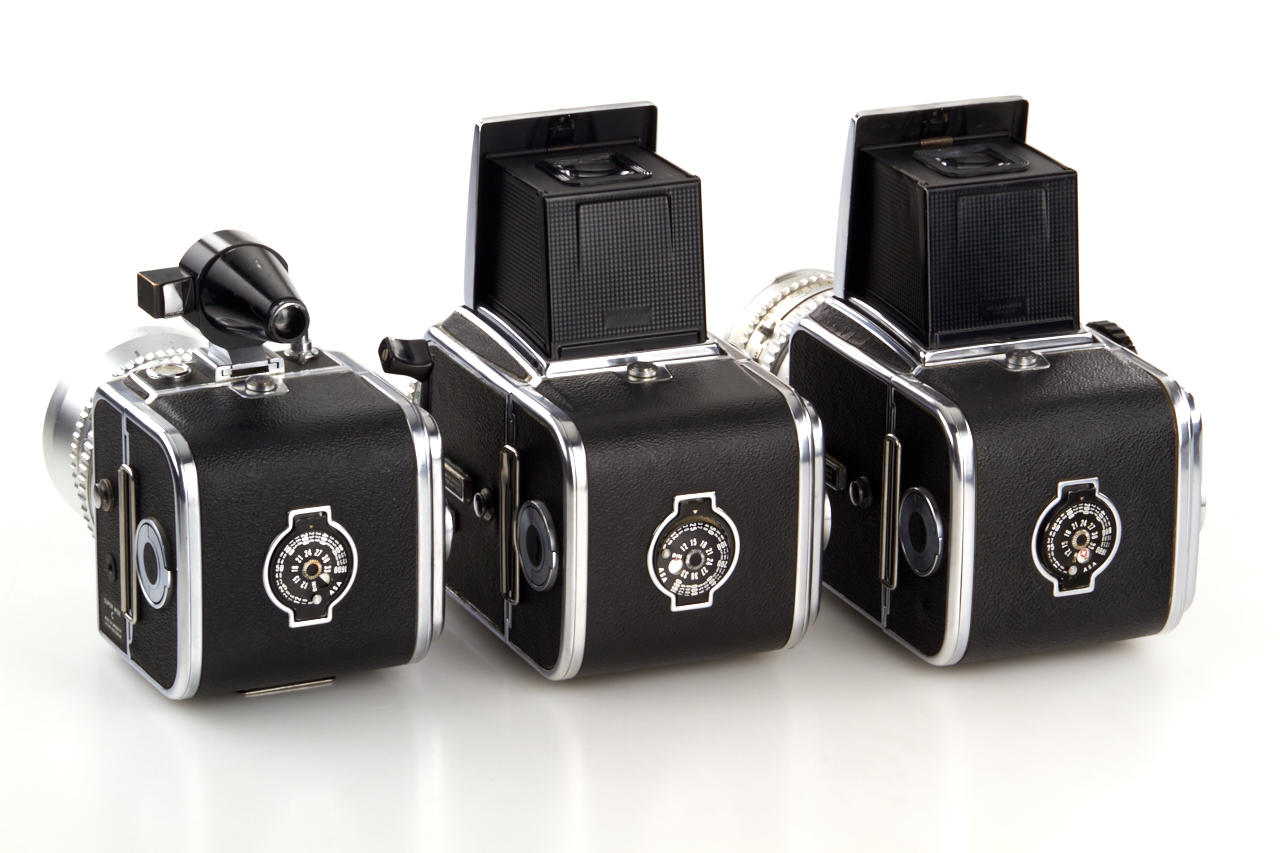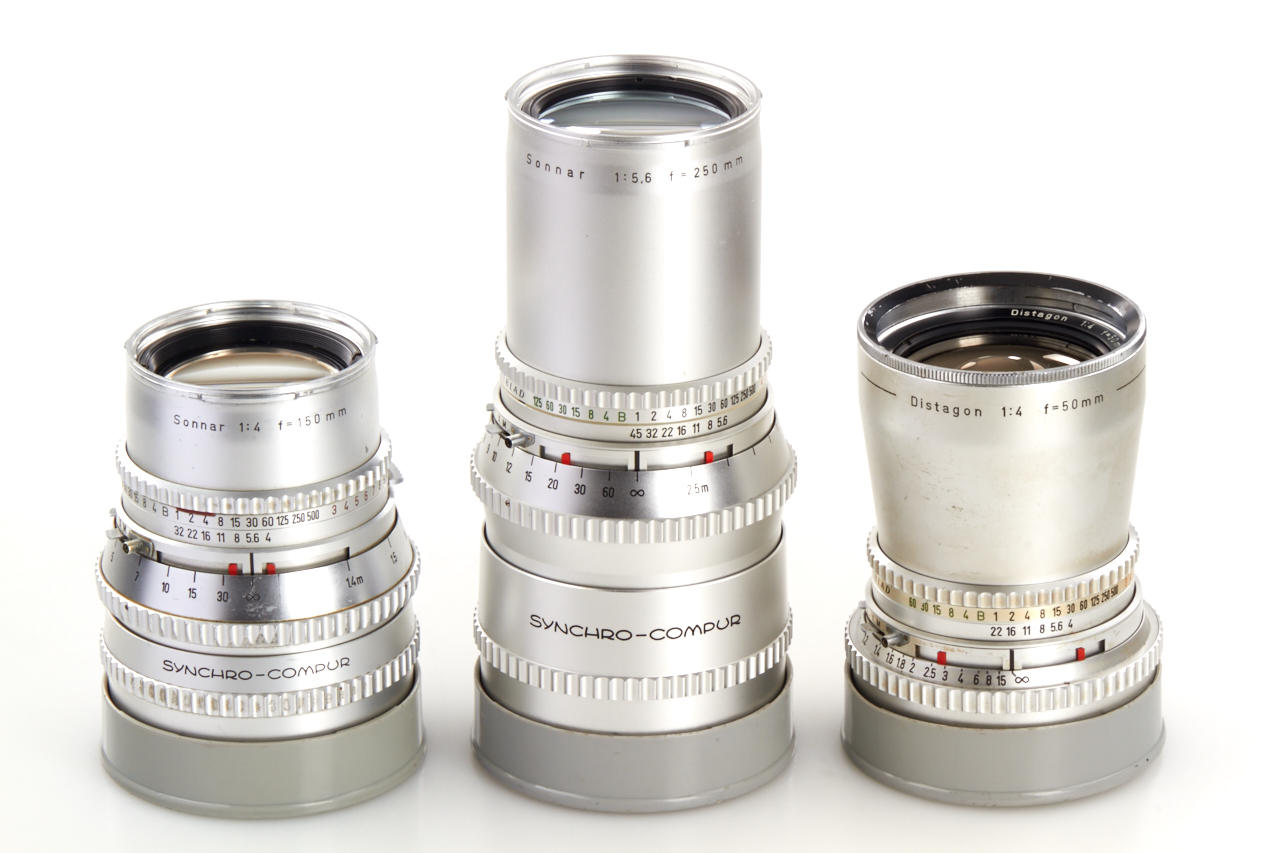 fantastic Hasselblad outfit with three cameras, five chrome lenses and accessories: Super Wide C no.TTW6847 (cond. A/B, with A12 magazine no.TC92328, matching finder, cap), early 500 C/M no.UP141069 (cond. B, with A24 magazine no.TE254683, body cap), 500 C no.TC63756 (A12 magazine, body cap), Distagon 4/50mm no.5300953 (caps), Planar 2.8/80mm no.4203550 (caps), S-Planar 5.6/120mm no.4166333 (caps), Sonnar 4/150mm no.3872562 (caps), Sonnar 5.6/250mm no.2586514 (caps), A70 magazine no.TR304127, A12 magazine no.TT95257, A24 magazine no.RR3536920, rare hood for Super Wide C, hoods for 80mm and 150mm, prism finder, magnifying finder, 9 filters, vertical grip, flash holder, two straps and instructions - all in fine condition stored in rare fitted large original Hasselblad outfit case