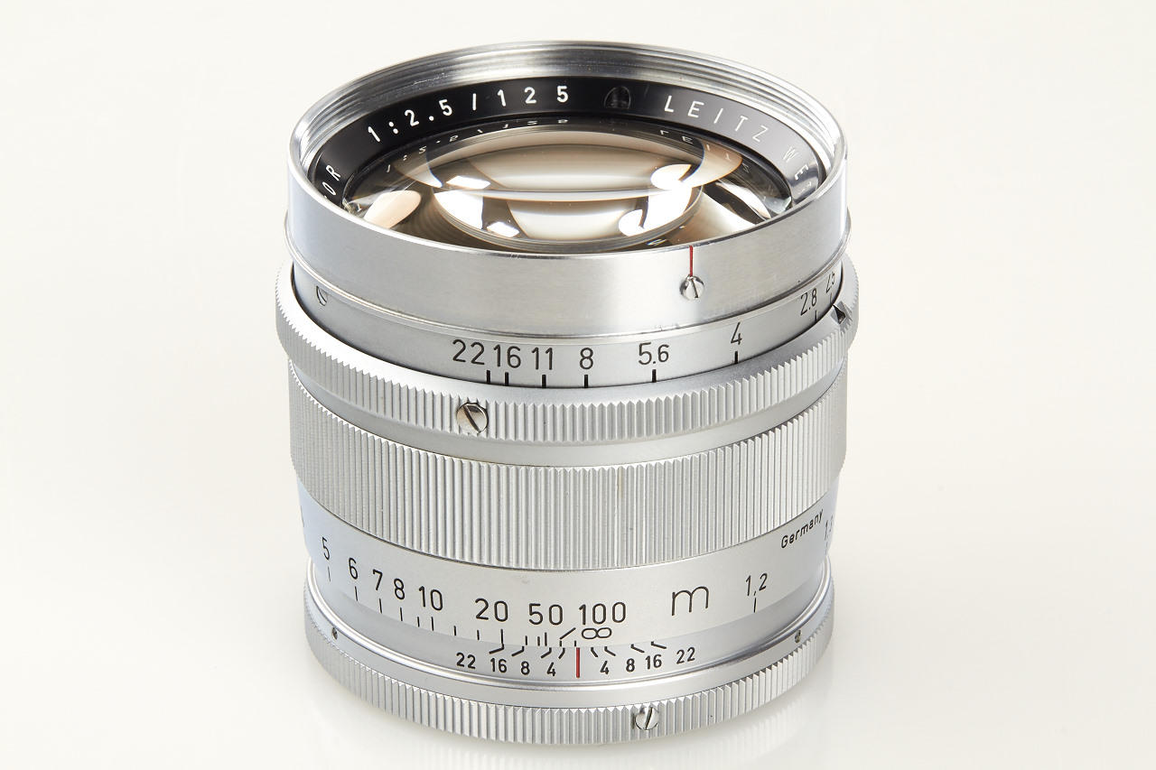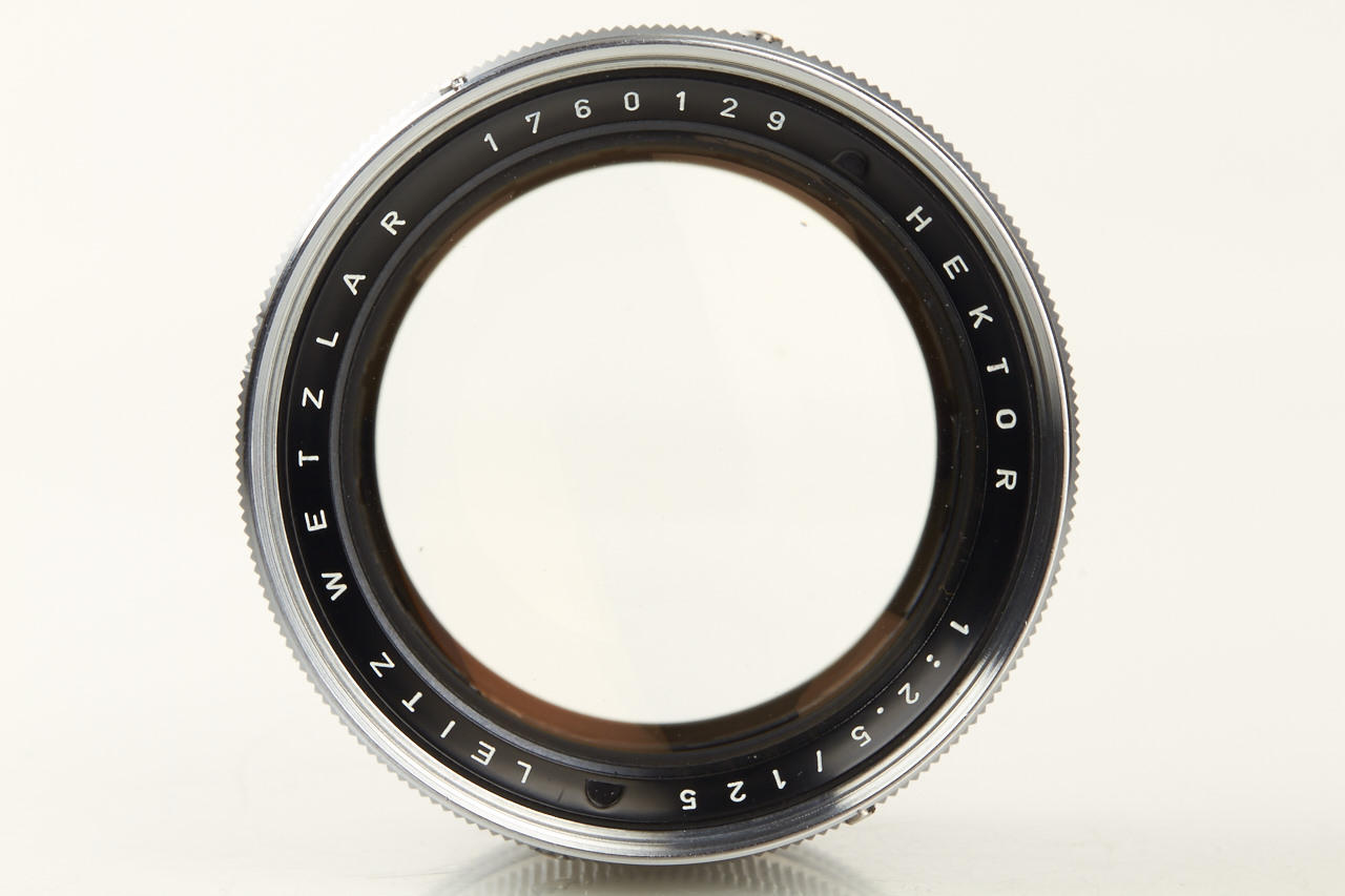 very late version (125mm) Wetzlar Hektor in very fine condition, clean lenses, cap, HIKOO hood (engraved 'ERNST LEITZ WETZLAR GERMANY HIKOO 1:2.5/125), red maker's box