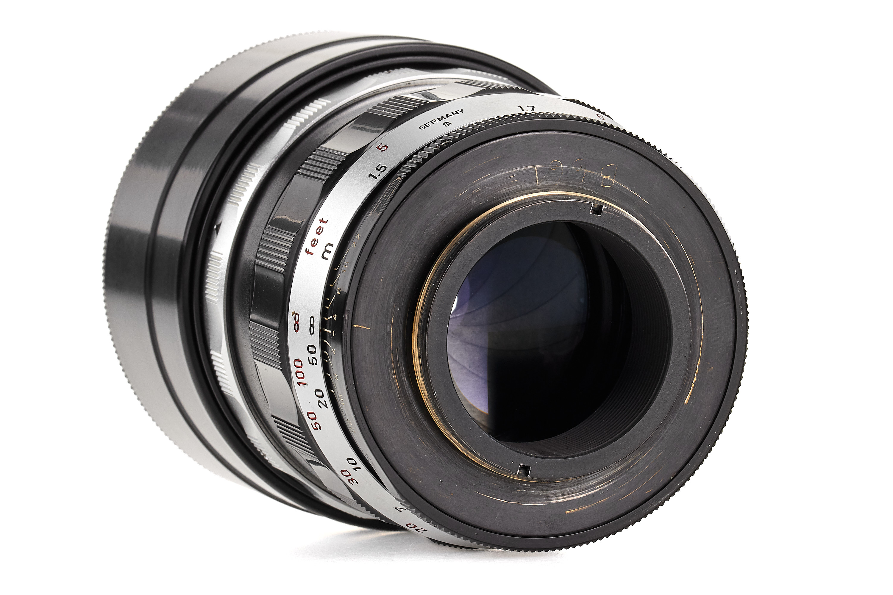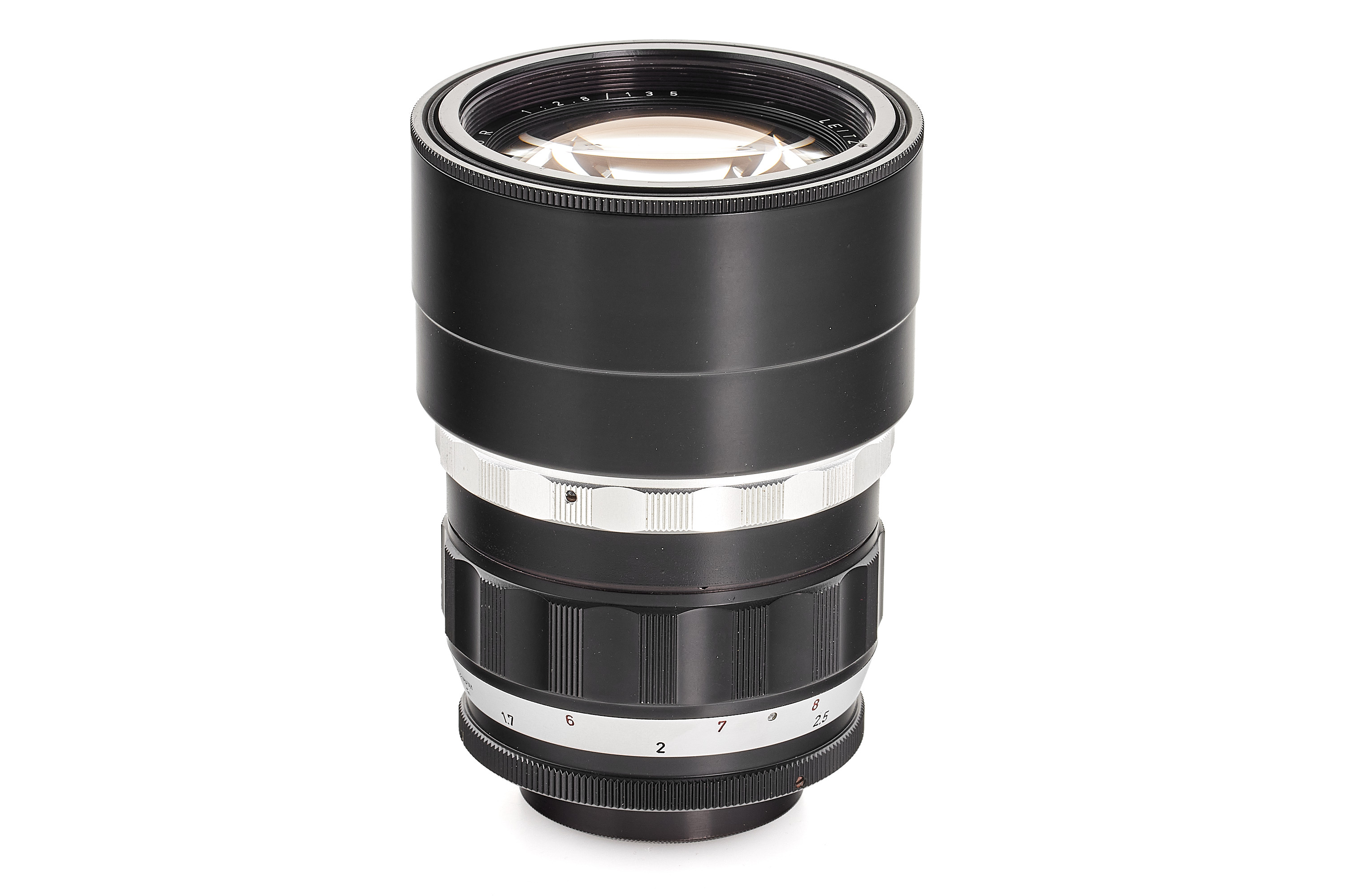 One of four known prototypes (No. 0000313-316) of the 135mm Hektor, produced in 1959. It features an M39 screw mount for use with the VISOFLEX II and is finished partly in black paint. The lens is in very good condition and is engraved internally with the optical formula B661. See Wilhelm Albert, Geburtstage der Leitz-Foto-Konstruktionen ab 1927, page 212, for a similar lens. Despite its outward similarity to the Telyt 4/200mm, the construction of this lens is entirely different!