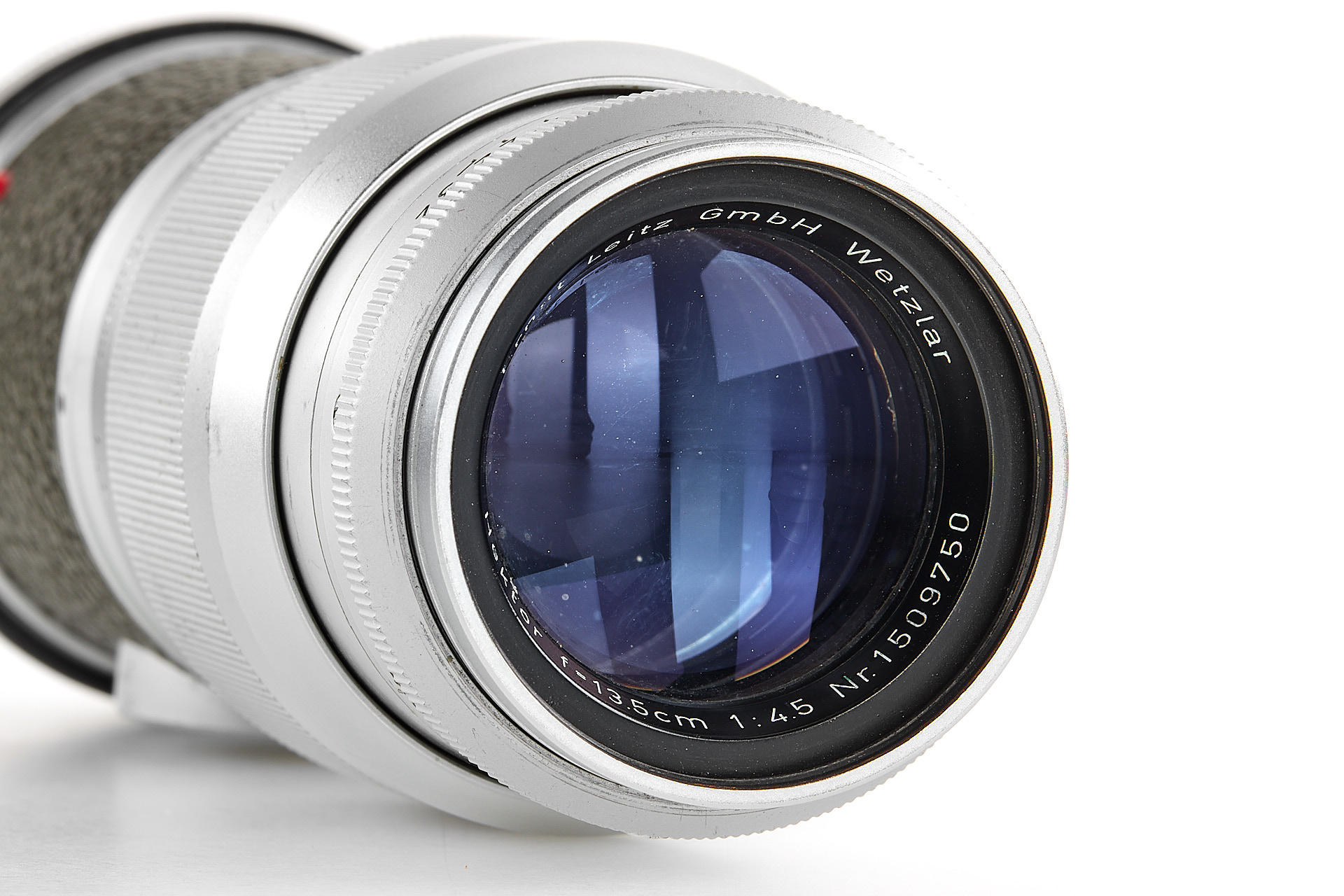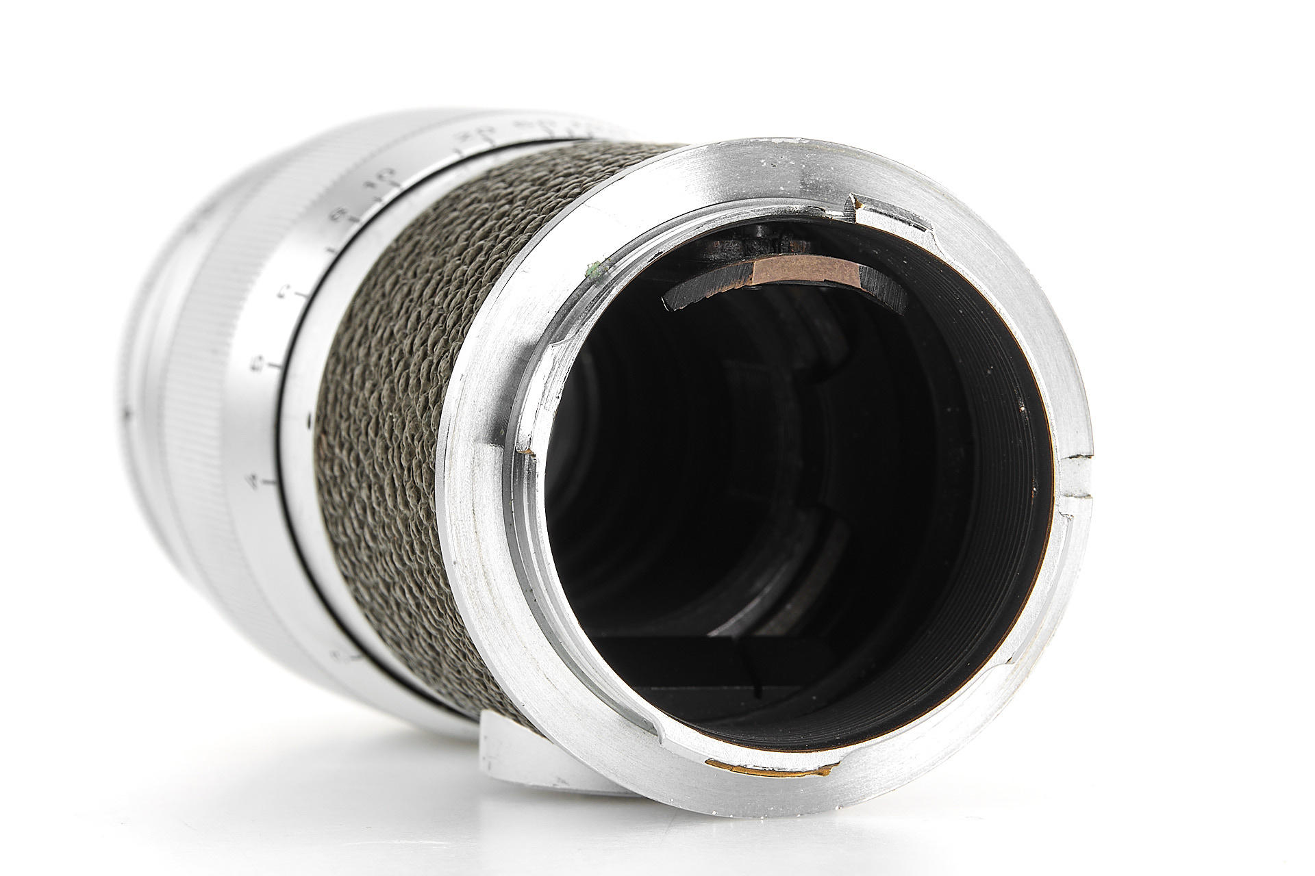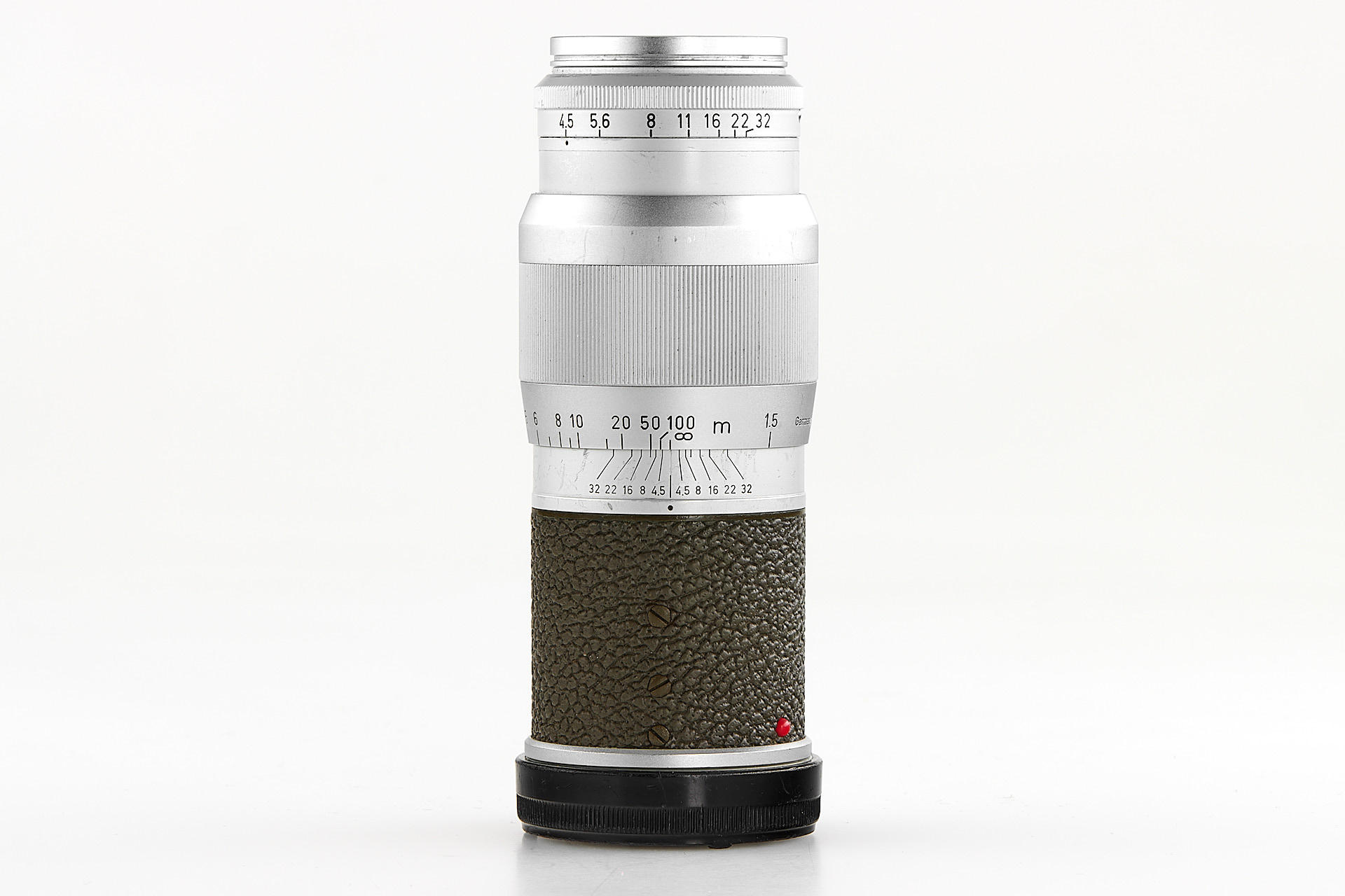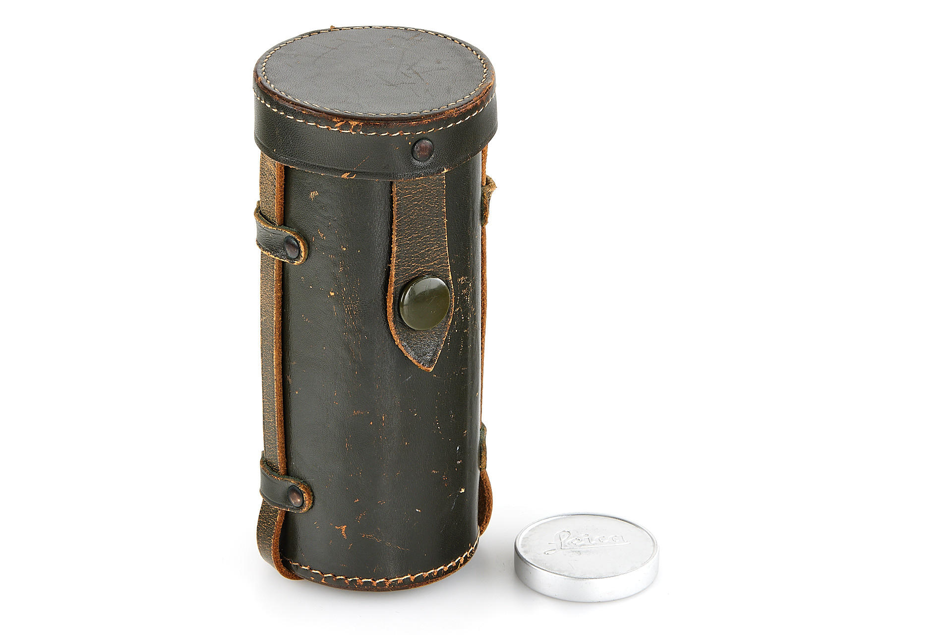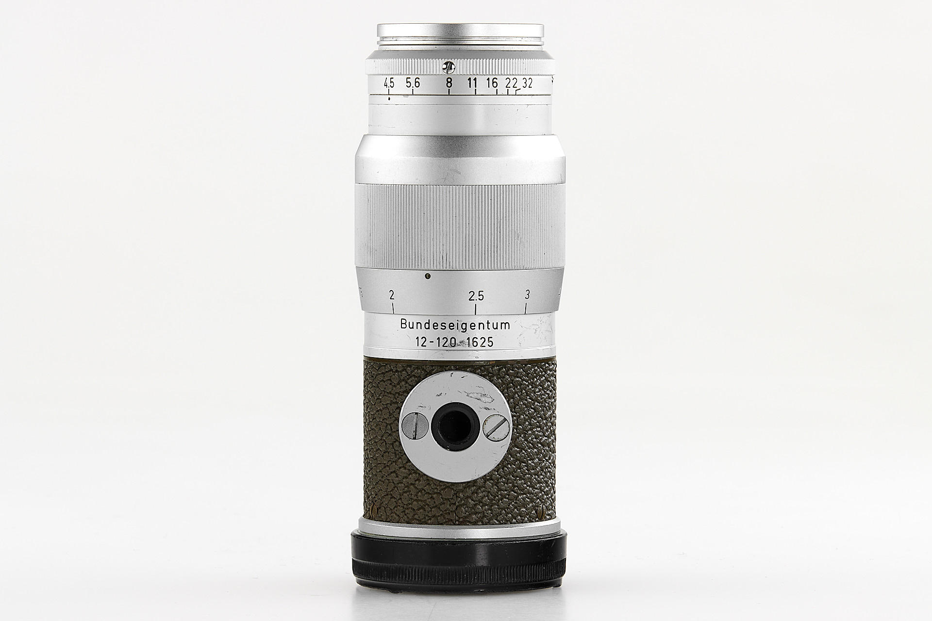 Very rare, orginal German military Hektor, engraved on the barrel with 'Bundeseigentum' and inventory number '12-120-1625', covered with green Vulkanite in coarse pattern (typical for this lens and early olive M1 cameras), with both caps and matching green keeper, very good condition