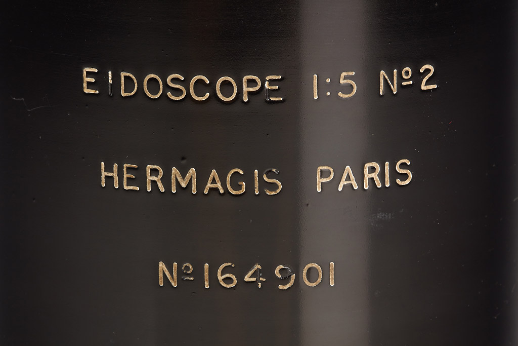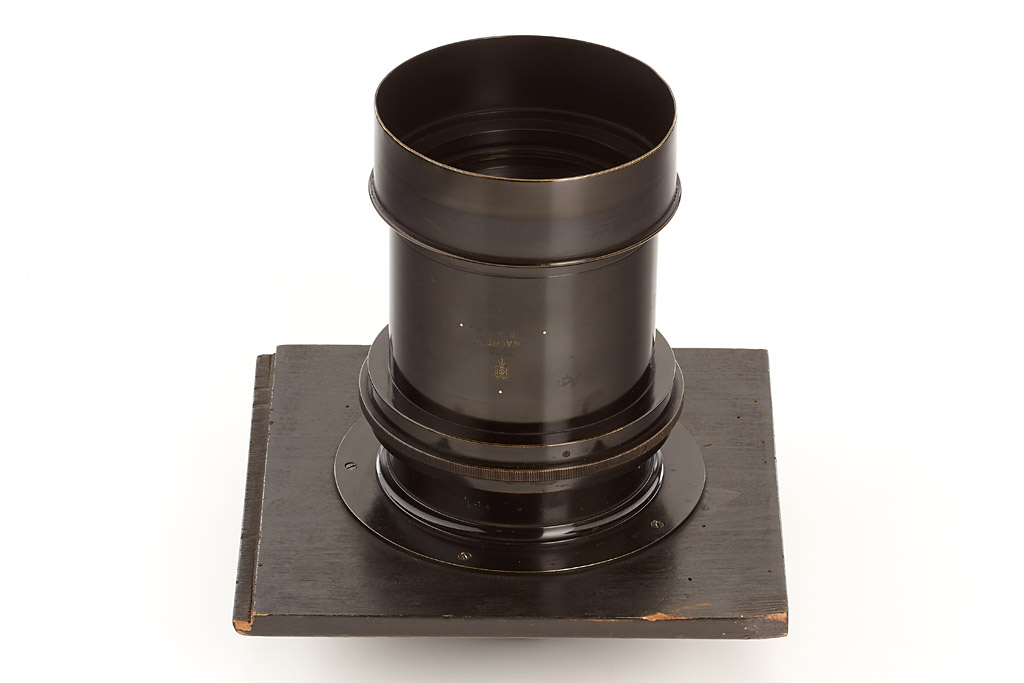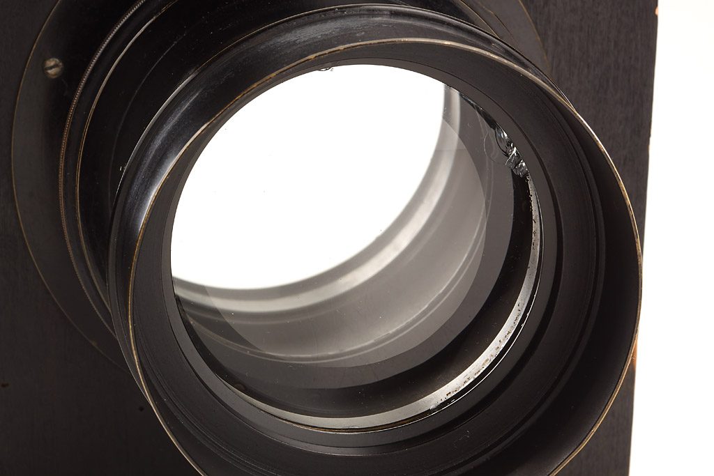 190mm, black painted barrel, front lens with very small chips inside, clean iris diaphragm, with hood (caps), mounting ring on wooden lens board (18.2x17.9cm)