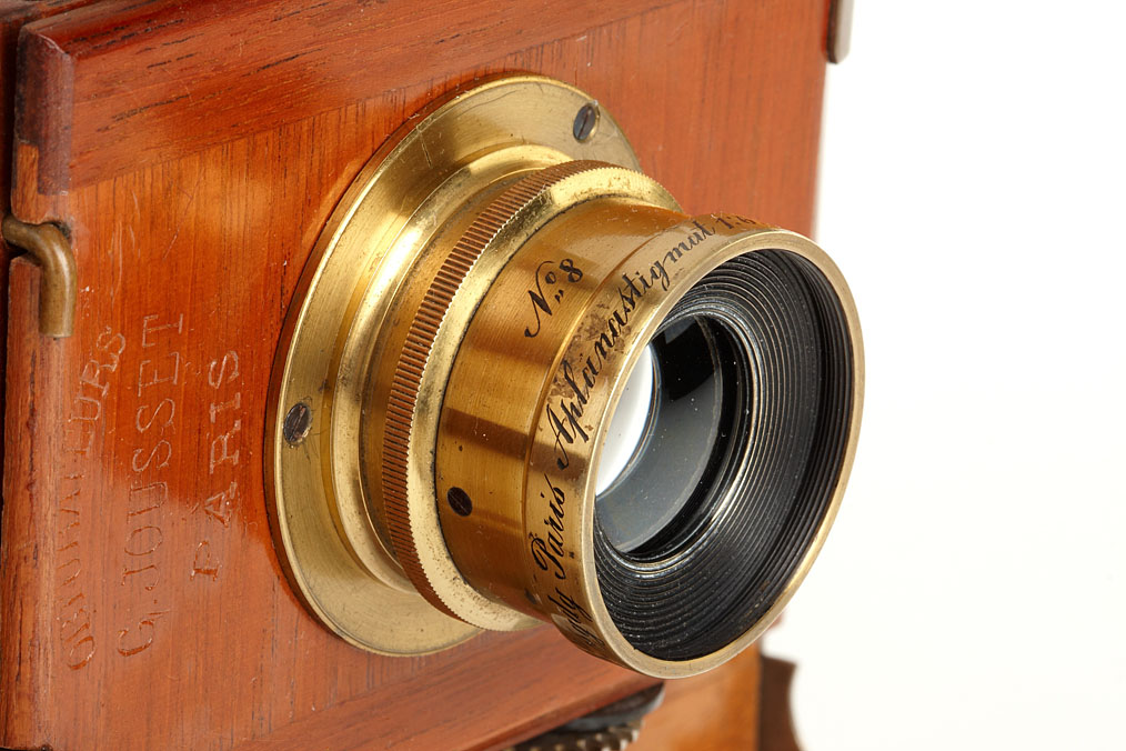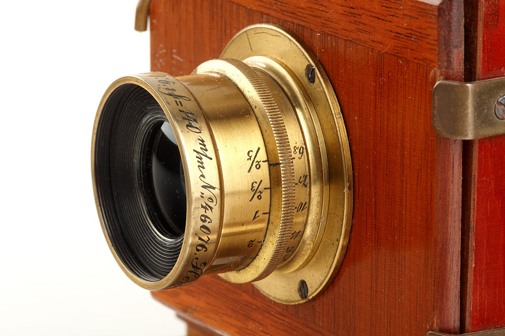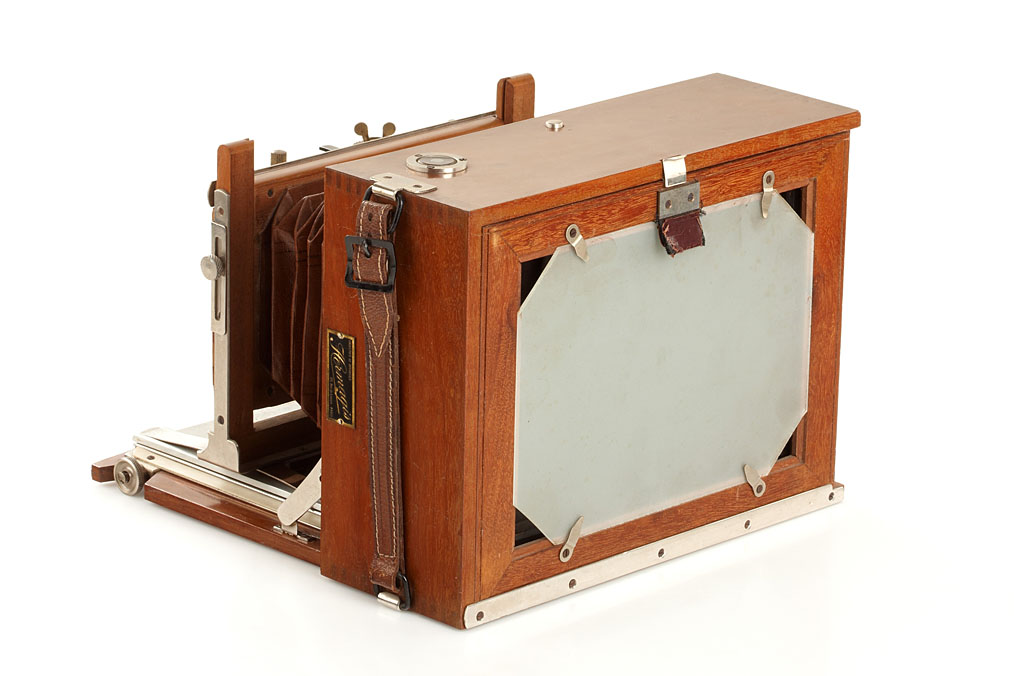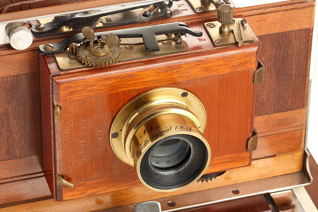 13x18cm, polished mahogany body with tan bellows, Hermagis Aplanastigmat No.8 6.8/140mm no.46076 in Gousset roller-blind shutter, original focusing screen adapter, one double film-holder
