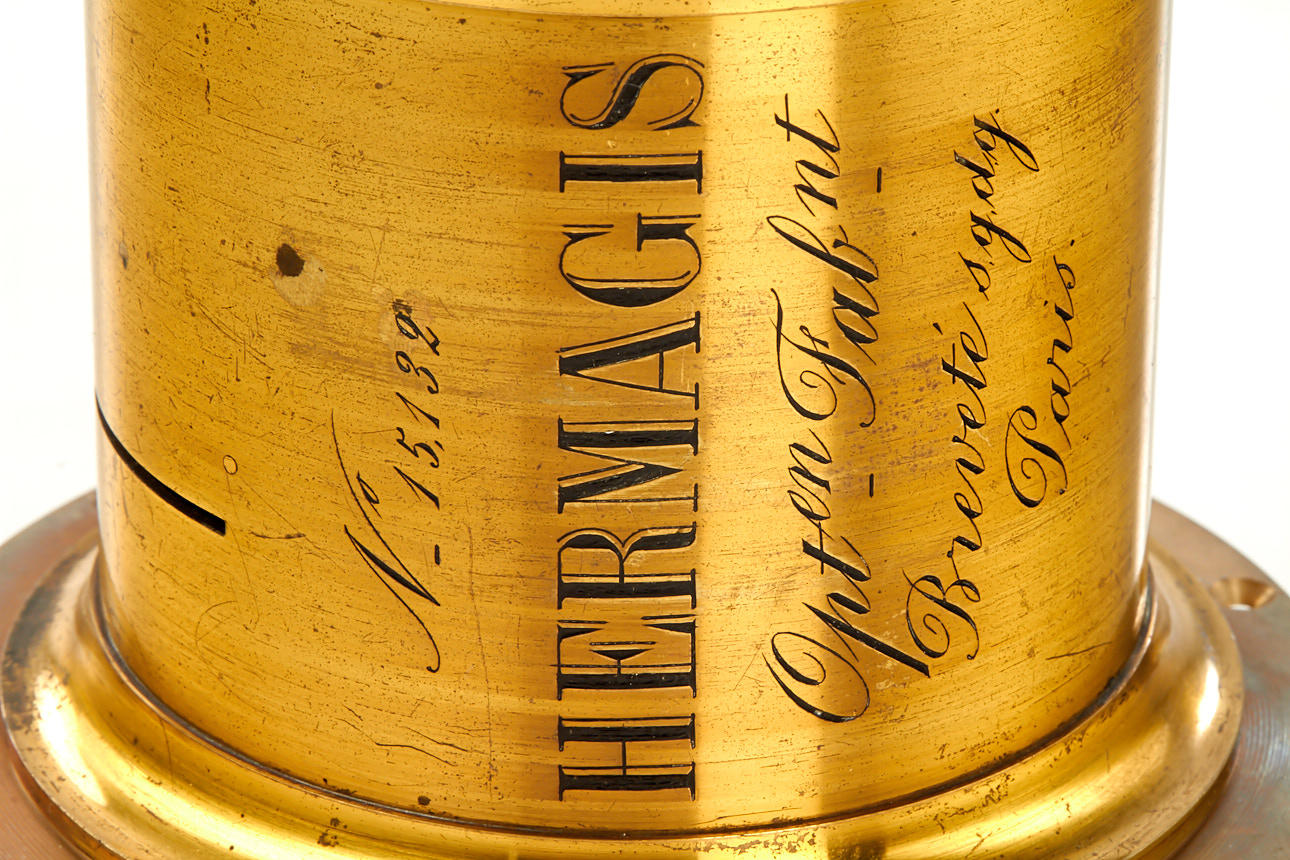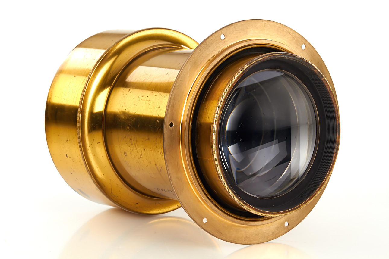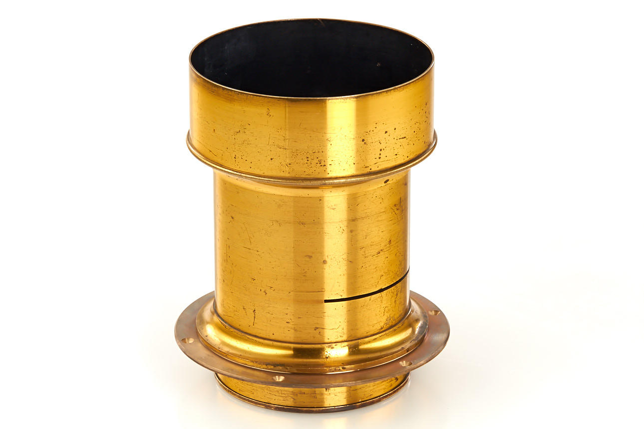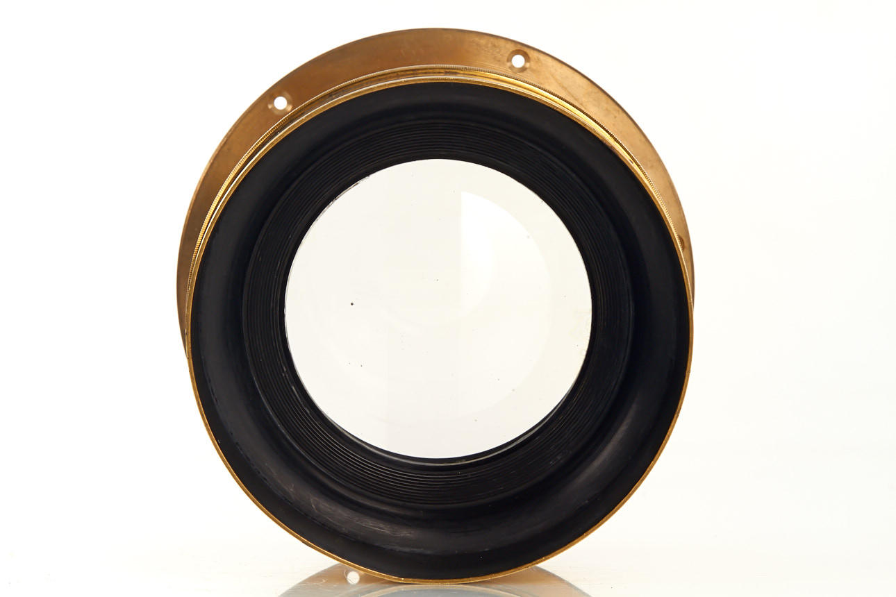 brass Petzval lens in very fine condition, focal length c.24cm, front and rear element diameter 7.5cm, clean optics with only tiny separation in front element, total height 16.5cm, with mounting ring