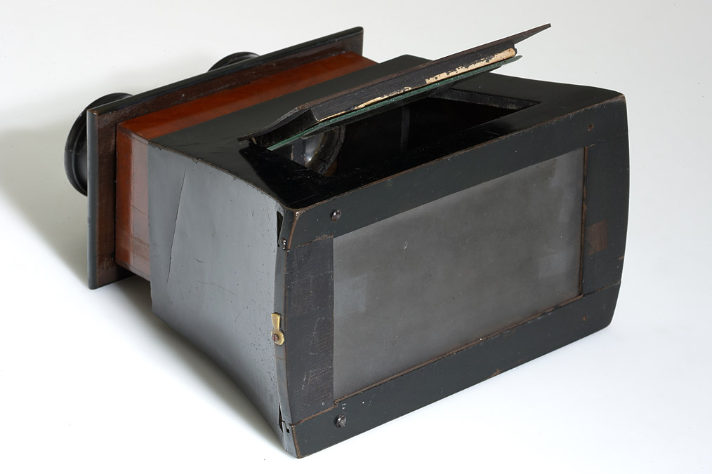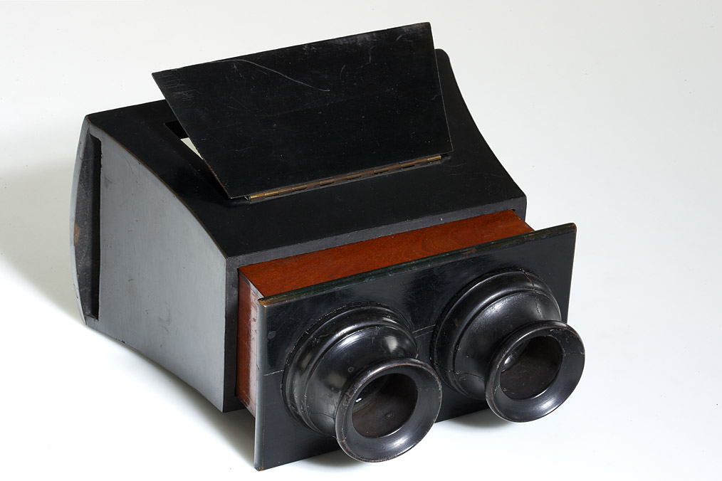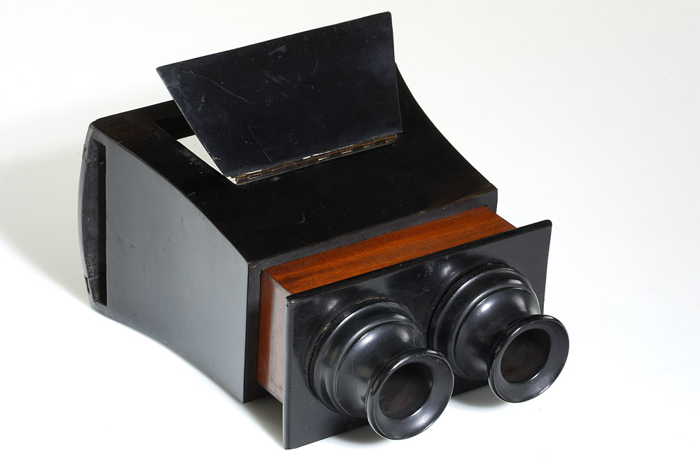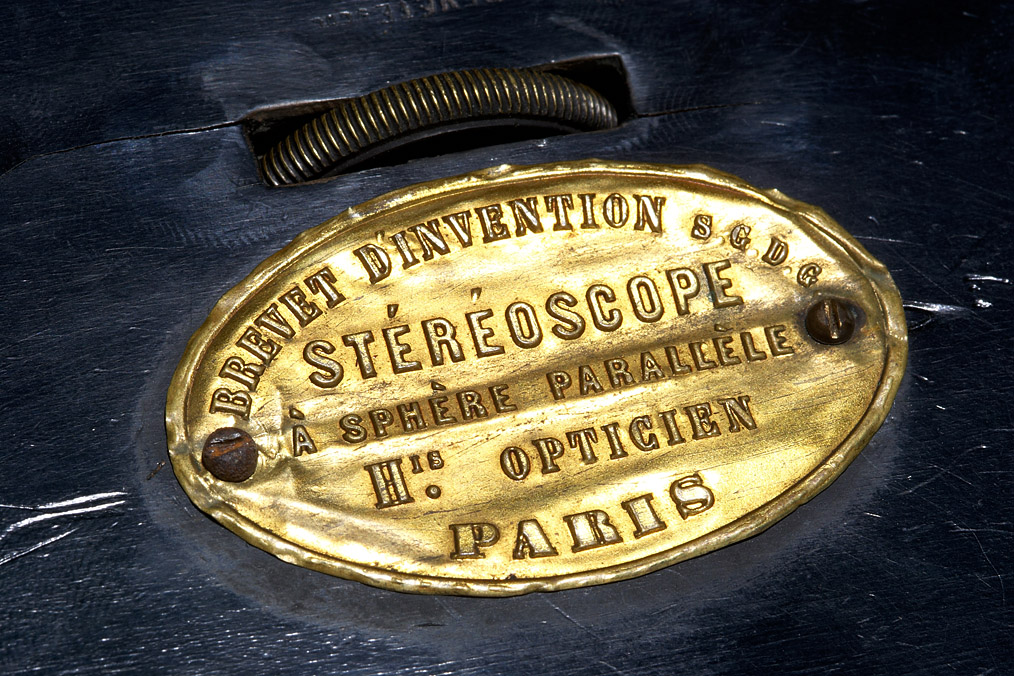 medium sized and large version of the Brewster type stereoscopes produced by the well known Parisian optician Hermagis, both with black lacquer finish, rack and pinion focus operated with a hand wheel and the brass makers label mounted on one side, both viewers show signs of wearing, the wooden eye pieces have cracks caused by tension, the rack and pinion focussing is working, but the mechanism is somehow weak. Even if their condition is not perfect, this rare Hermagis stereoscopes are still highly collectable and interesting viewers. (2)