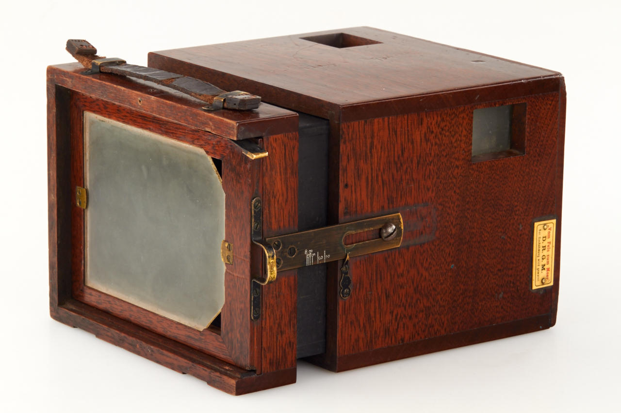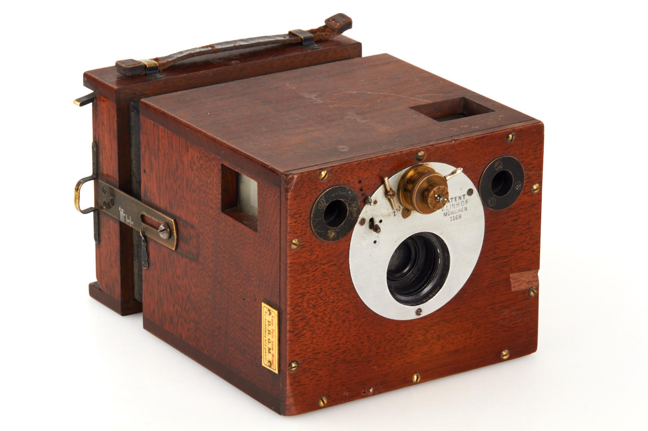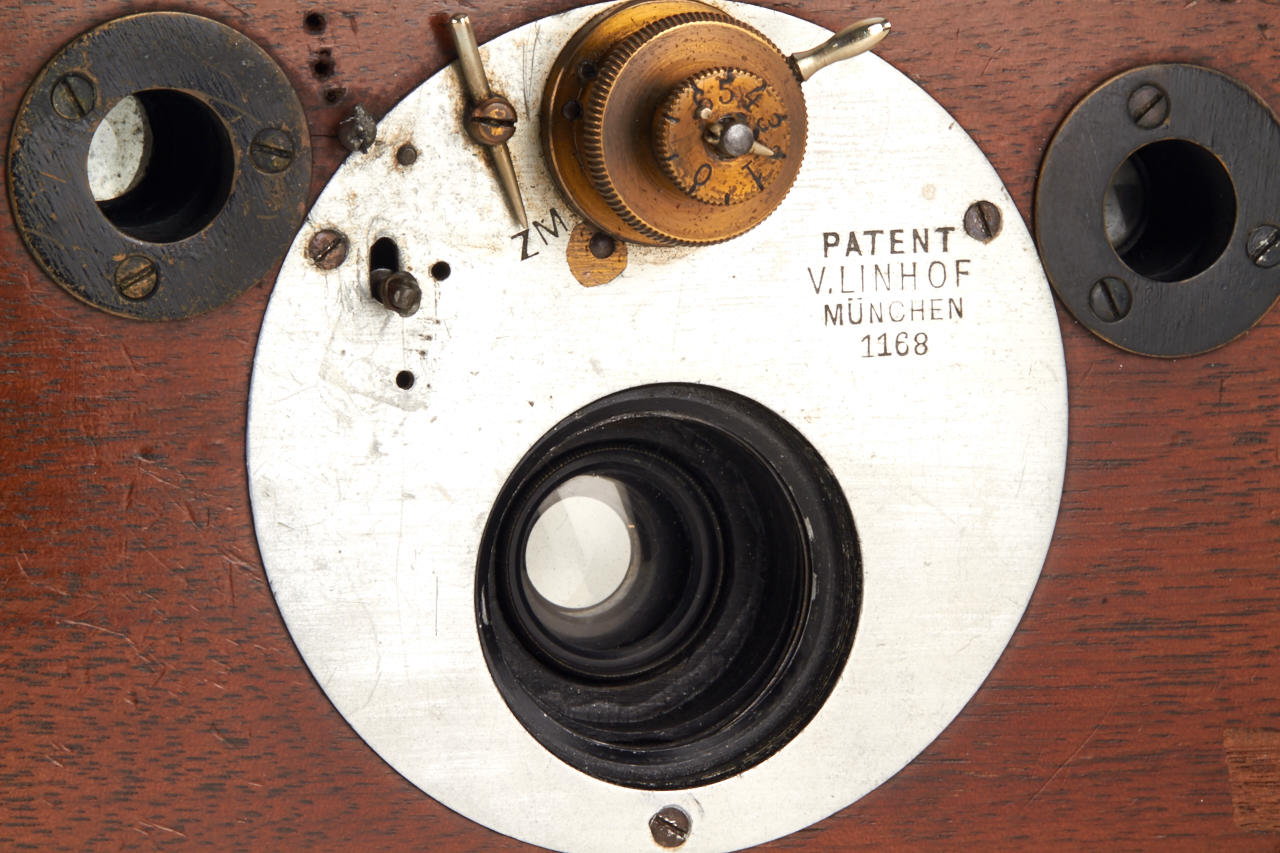 very rare German detective sliding box camera made by Hoerth, Daeschner & Co, Karlsruhe, for 9x12cm exposures on 6 double plate film holders, two reflex finders, original ground glass, Linhof Patent shutter engraved 'PATENT V.LINHOF MÜNCHEN 1168', in fine original condition, leather case