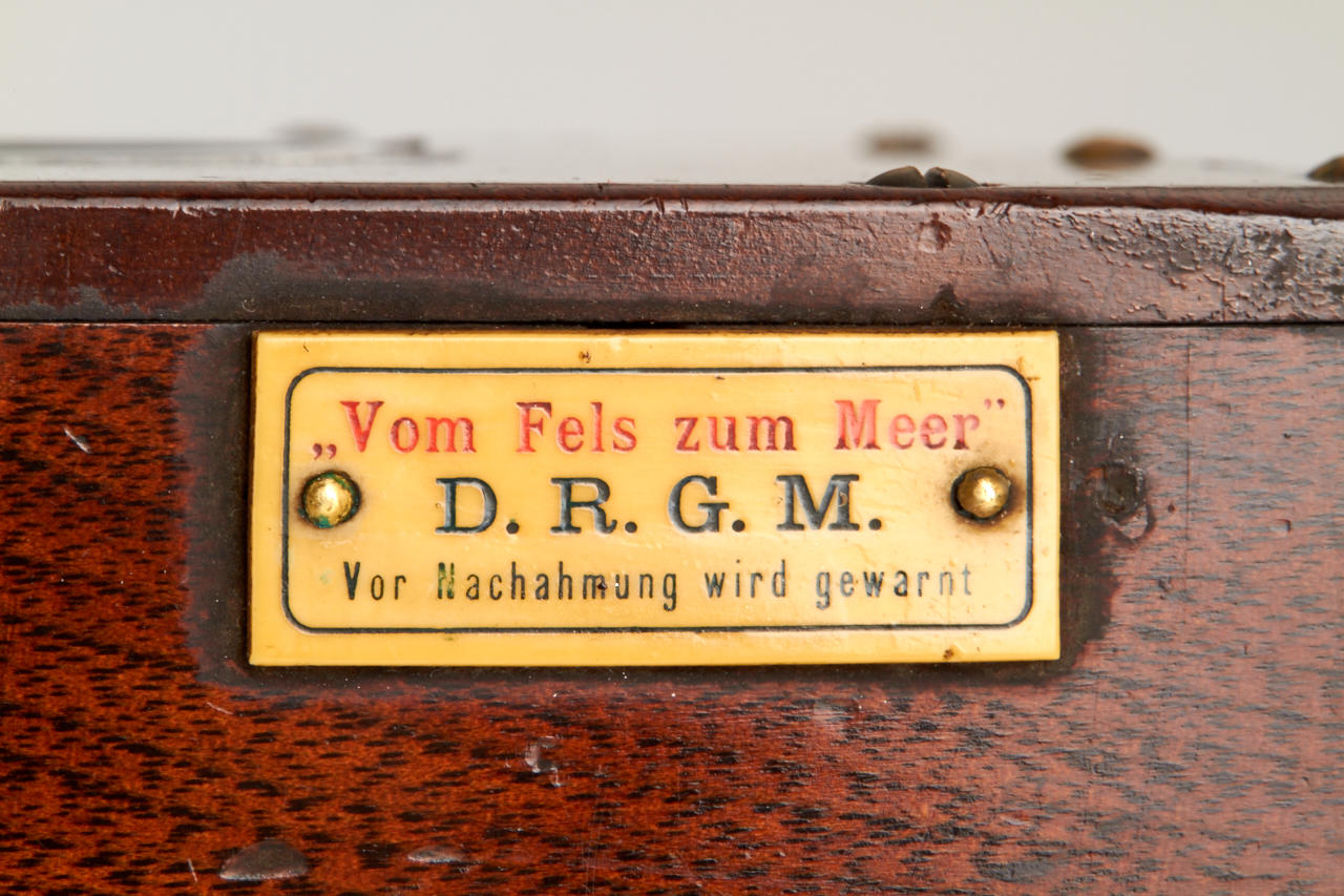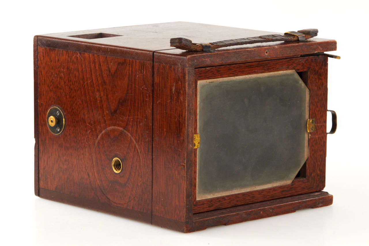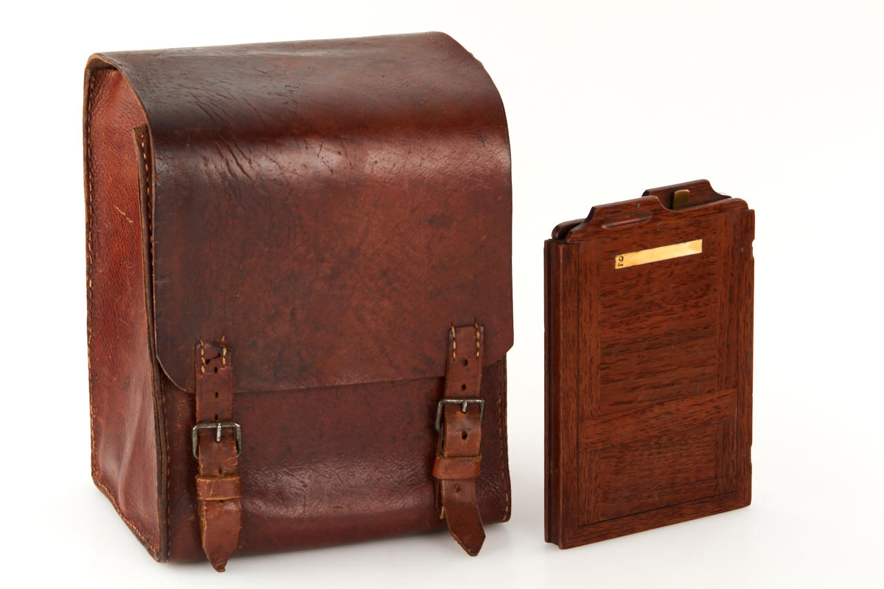very rare German detective sliding box camera made by Hoerth, Daeschner & Co, Karlsruhe, for 9x12cm exposures on 6 double plate film holders, two reflex finders, original ground glass, Linhof Patent shutter engraved 'PATENT V.LINHOF MÜNCHEN 1168', in fine original condition, leather case