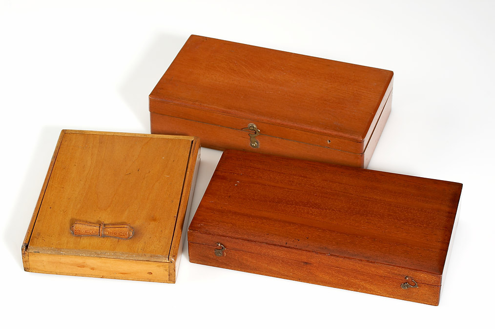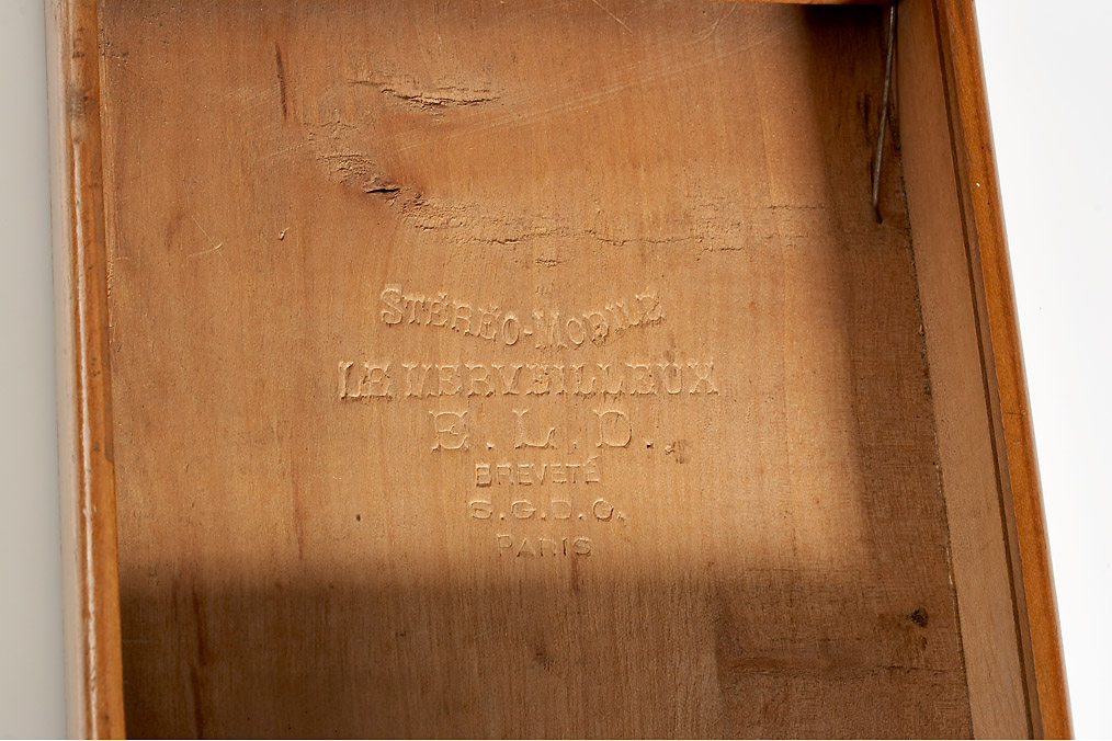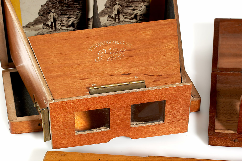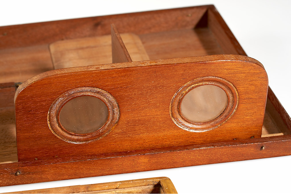 three collapsible viewers made of fruit wood, each folds into to a handy box, (1) stamped 'Le Merveilleux Stereo-Mobile', when closed 11.5x15.5x2.5cm, (2) with ingenious folding mechanism, stamped 'H.E. Marque de Fabrique', when closed 10.5x18.5x4cm, (3) without makers label but probably also French, when closed 10,5x19x3,5cm, wood and lenses in very nice condition.