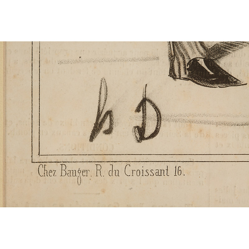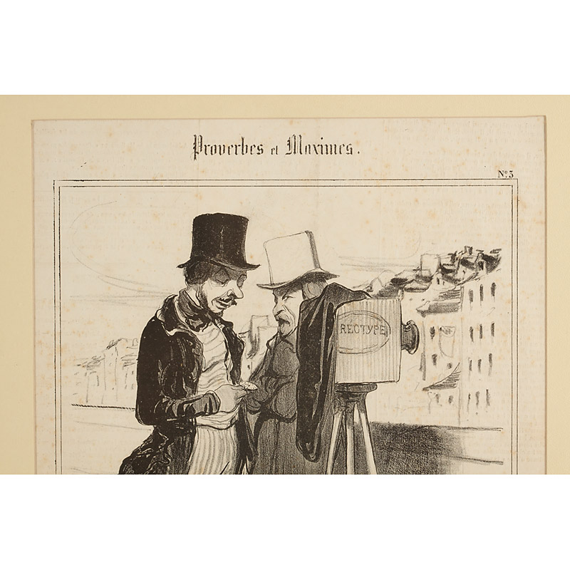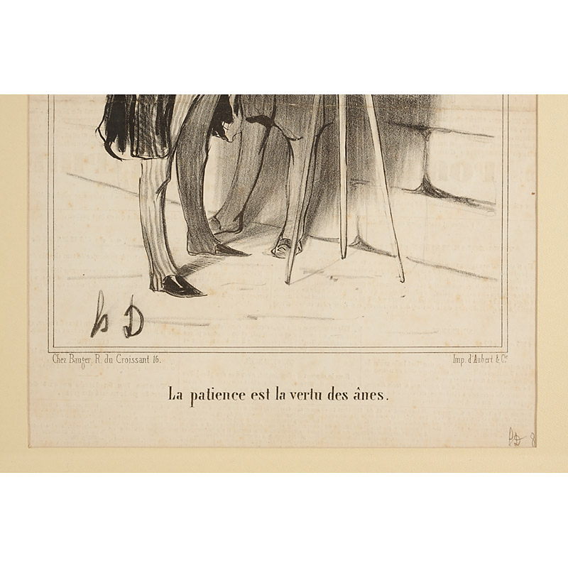21x30cm, famous advertising from a French newspaper, Proverbes et Maximes 'La patience est la vertu des ânes', mounted in golden wooden 30x40cm frame