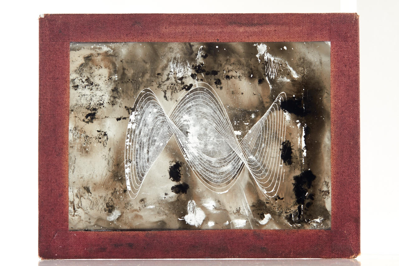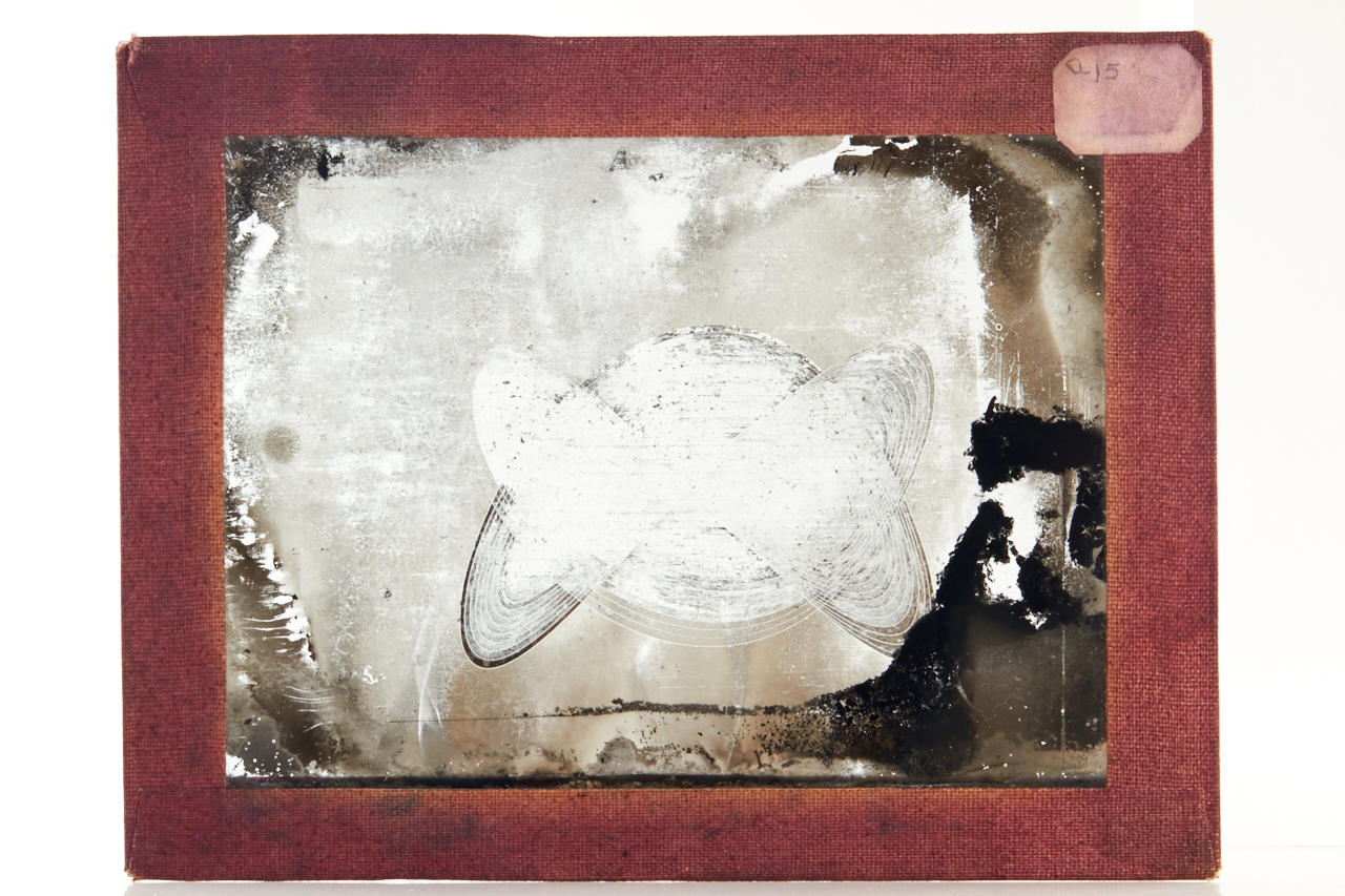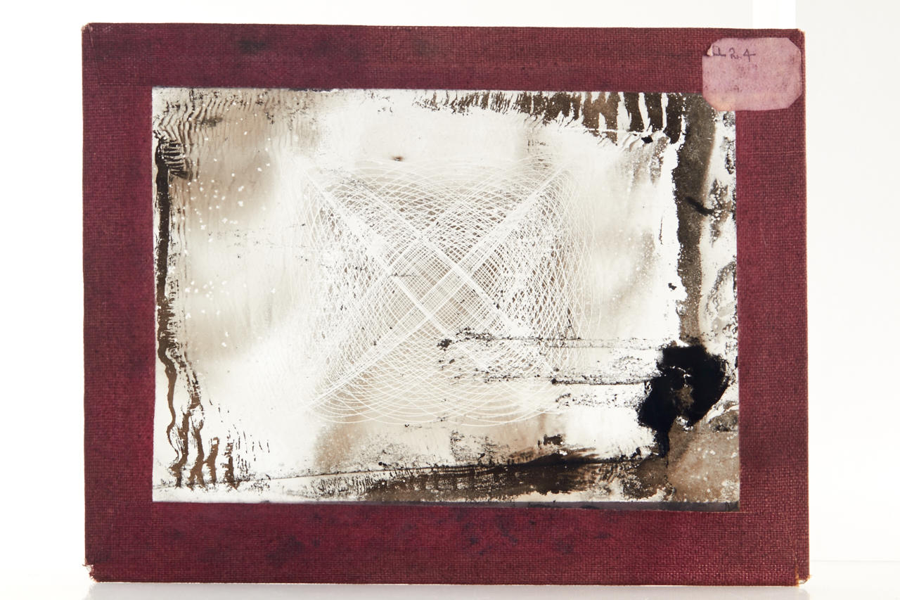 boxed set of 23 half plate (4.5x5.5") slides with very fine Harmonograph curves. The patterns are scribed on glass plates coated with a layer of soot. In order to protect the vulnerable surface each slide is covered with a cover slip and bordered with a linen strip. Due their ephemeral quality, all the slides show a certain degree of disintegration. Some are completely faded, at least 4 slides show clear Harmonograph patterns. Embossed makers label on the inner side of the wooden lid: 'Manufactured by Samuel Peck & Co'. Samuel H. Peck of New Haven, Connecticut, produced Daguerreian images, cases, and wet-plate cameras between 1850-1860. In the mid 1900’s the Harmonograph was a very popular philosophical toy which was used to demonstrate the correspondence between mathematical curves and musical harmony, the technique to record motion on a turning soot coated glass cylinder was also common between 1850 and 1900 mostly in the field of Physiology - for example Etienne-Jules Marey used it for his work on animal movement. The purpose and the origin of the offered slides is not completely clear, but it seems that they were produced for scientific demonstration rather than for amusement.