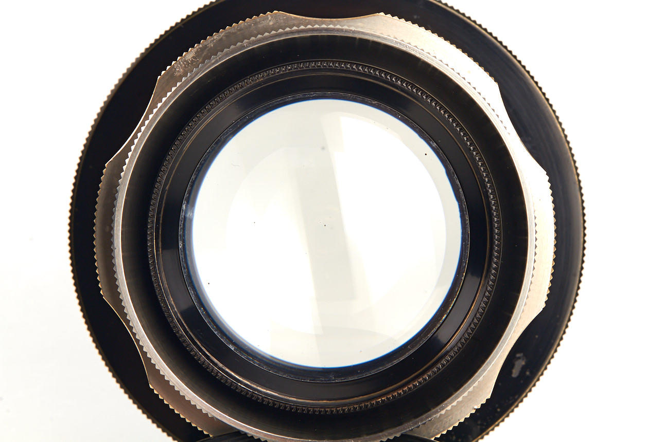 extremely rare and beautiful early version finished in nickel and black paint, covering medium format, in Primarflex screw focusing mount, original brass black paint hood, clean optics