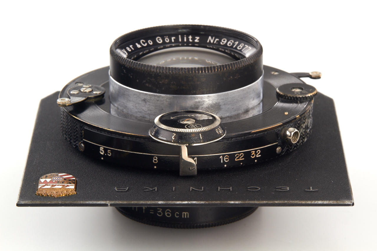 probably unique Meyer Doppel Plasmat lens in this focal length/ aperture combination, in excellent condition with clean optics, in working Compur shutter no.736582, on Linhof Technika lens board, with Meyer front cap, provenance of this lens shows connections to a Linhof engineer