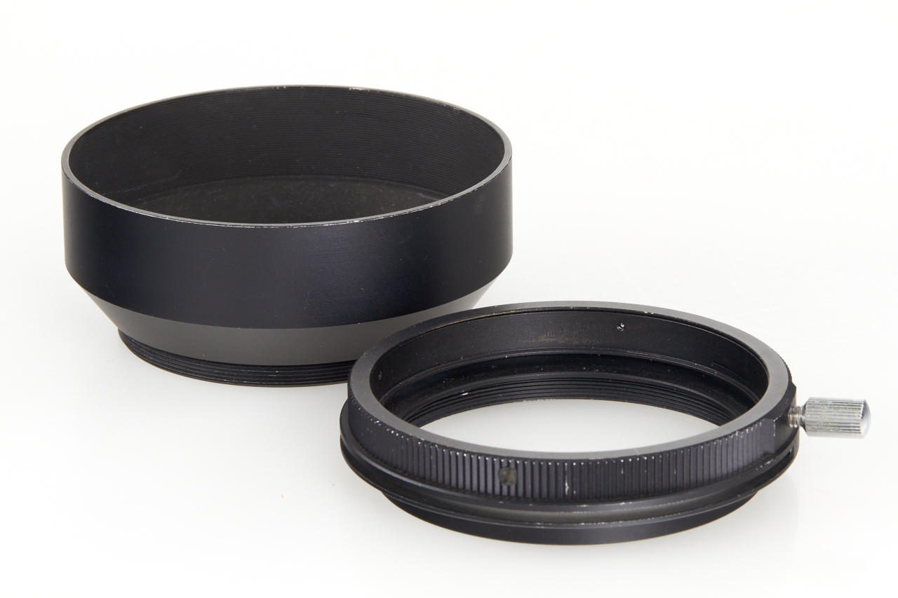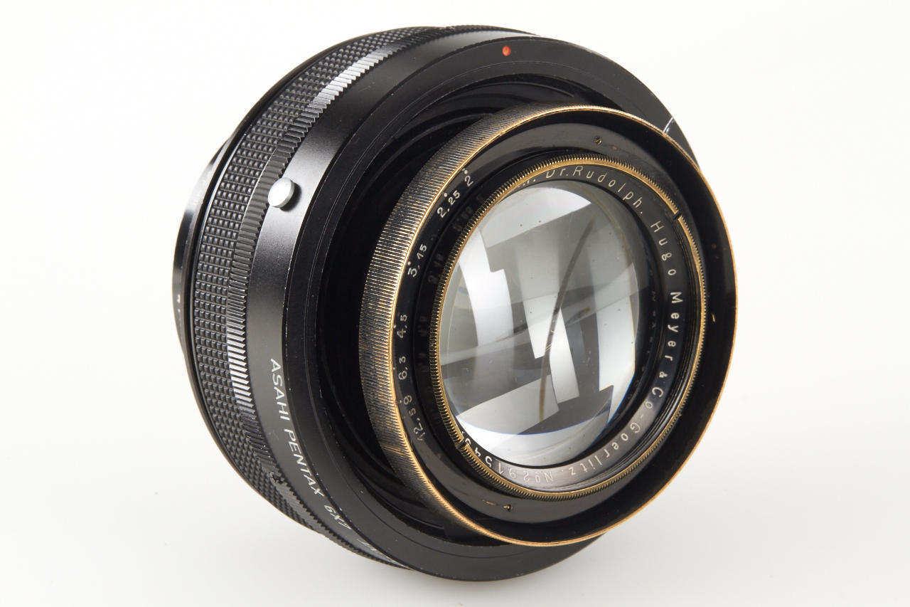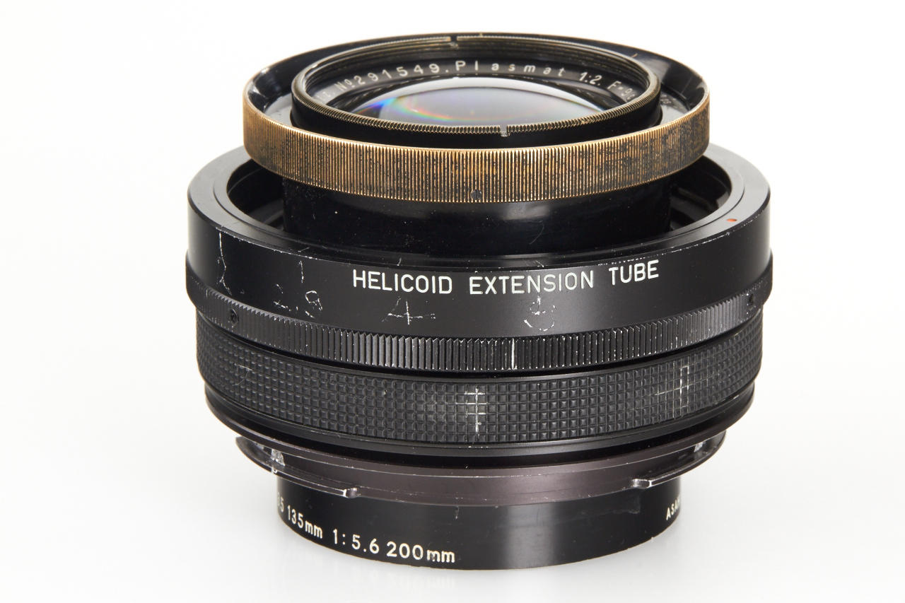 rare and very fast lens with focusing adapter for Pentax 67, good optics with few small cleaning marks, inclusive hood and leather cap