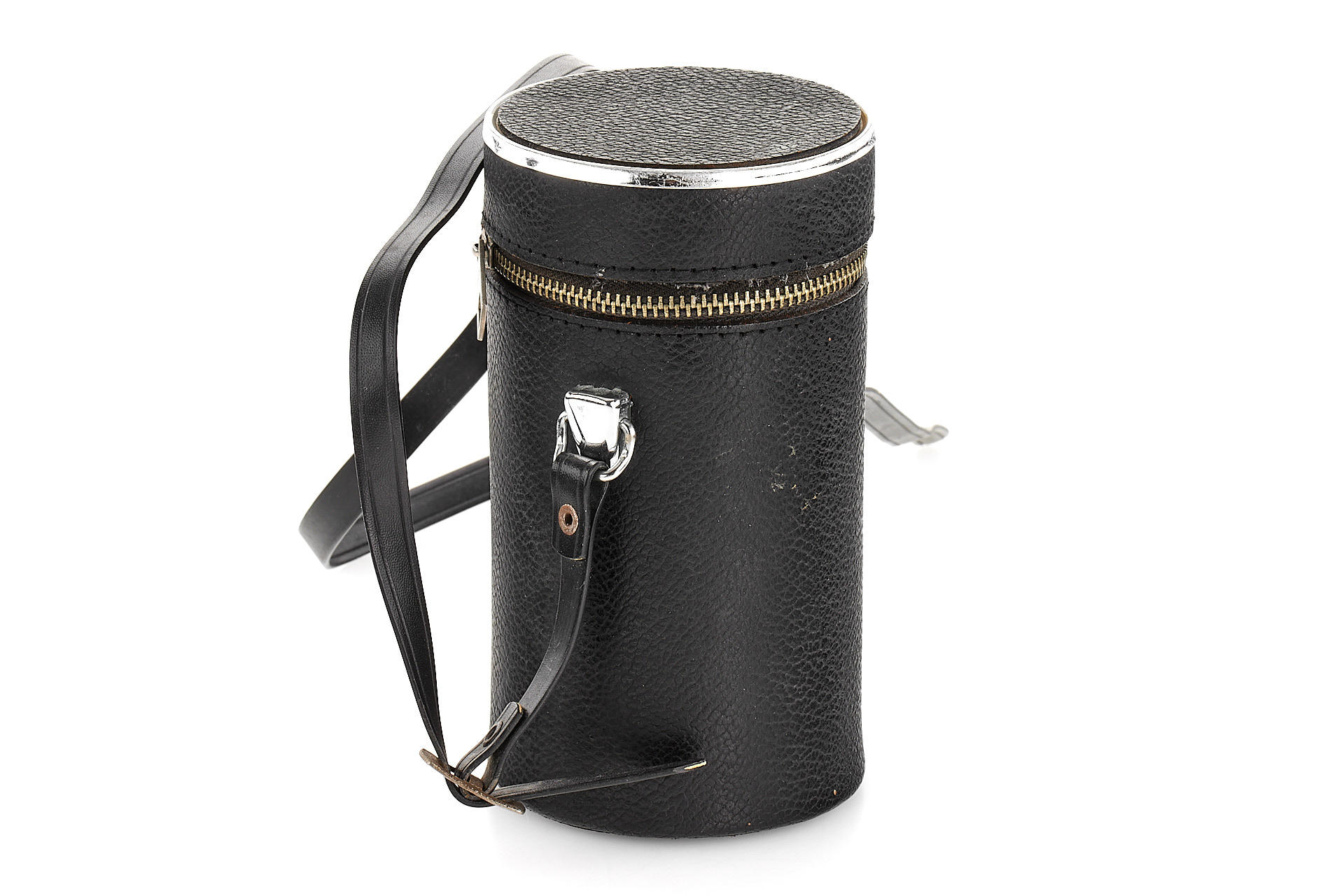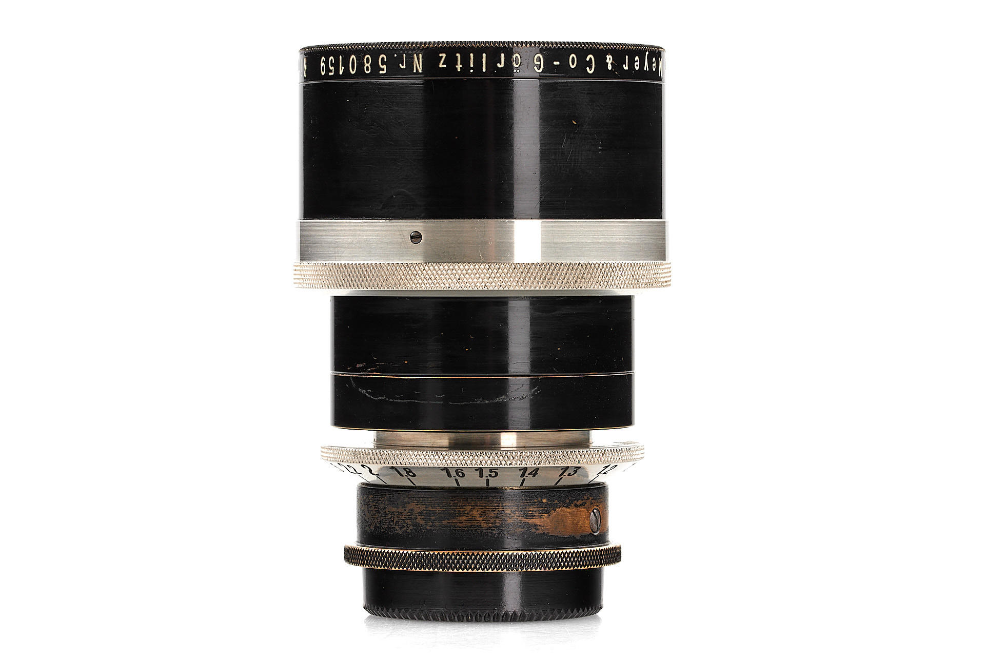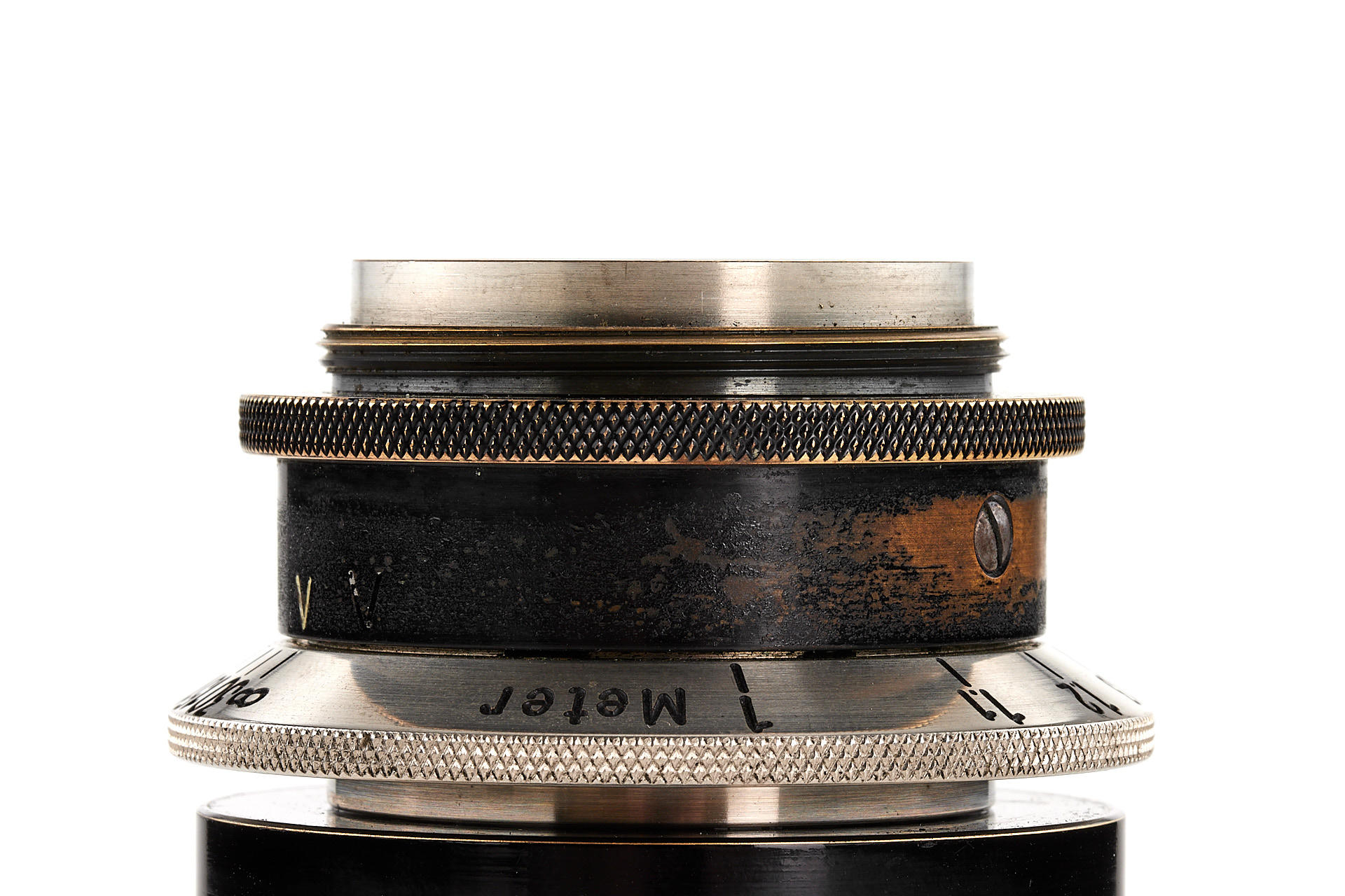 Rare and sought-after portrait lens in original rangefinder coupled Leica M39 mount, version with meter scale and engraved with 'D.R.P. Dr. Rudolph Hugo Meyer & Co Görlitz', black paint body with a nickel focusing ring, in very good condition, good uncoated optics, incl. original black paint hood, and rear cap