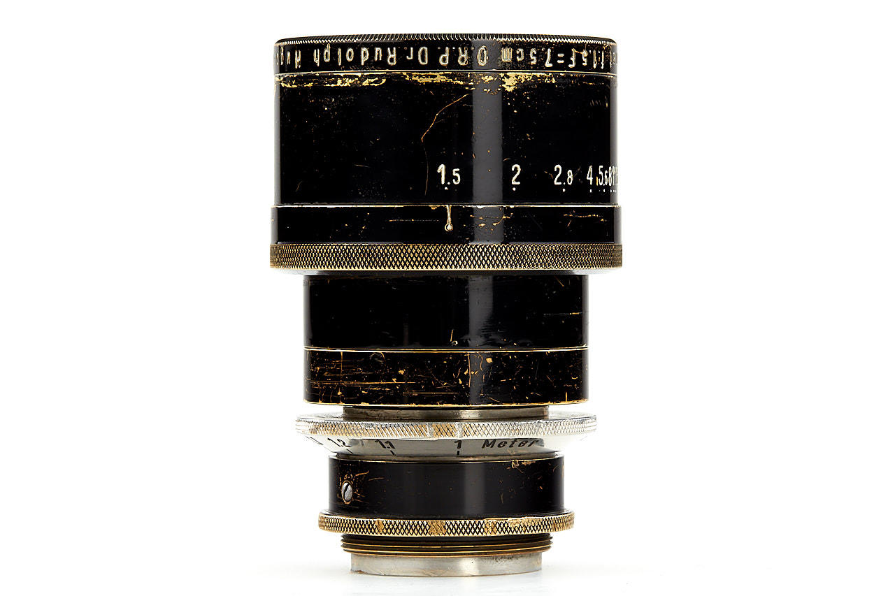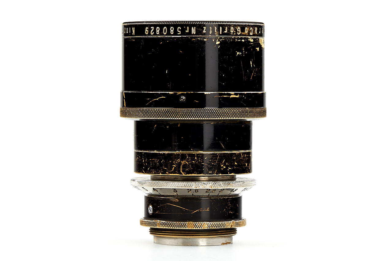 rare and sought-after portrait lens in original rangefinder-coupled M39 mount, version with meter scale and engraved with 'Dr. Rudolph Hugo Meyer & Co. Görlitz', black paint body with nickel focusing ring, in fine condition, uncoated optics with only two tiny scratches on front element, incl. nickel hood