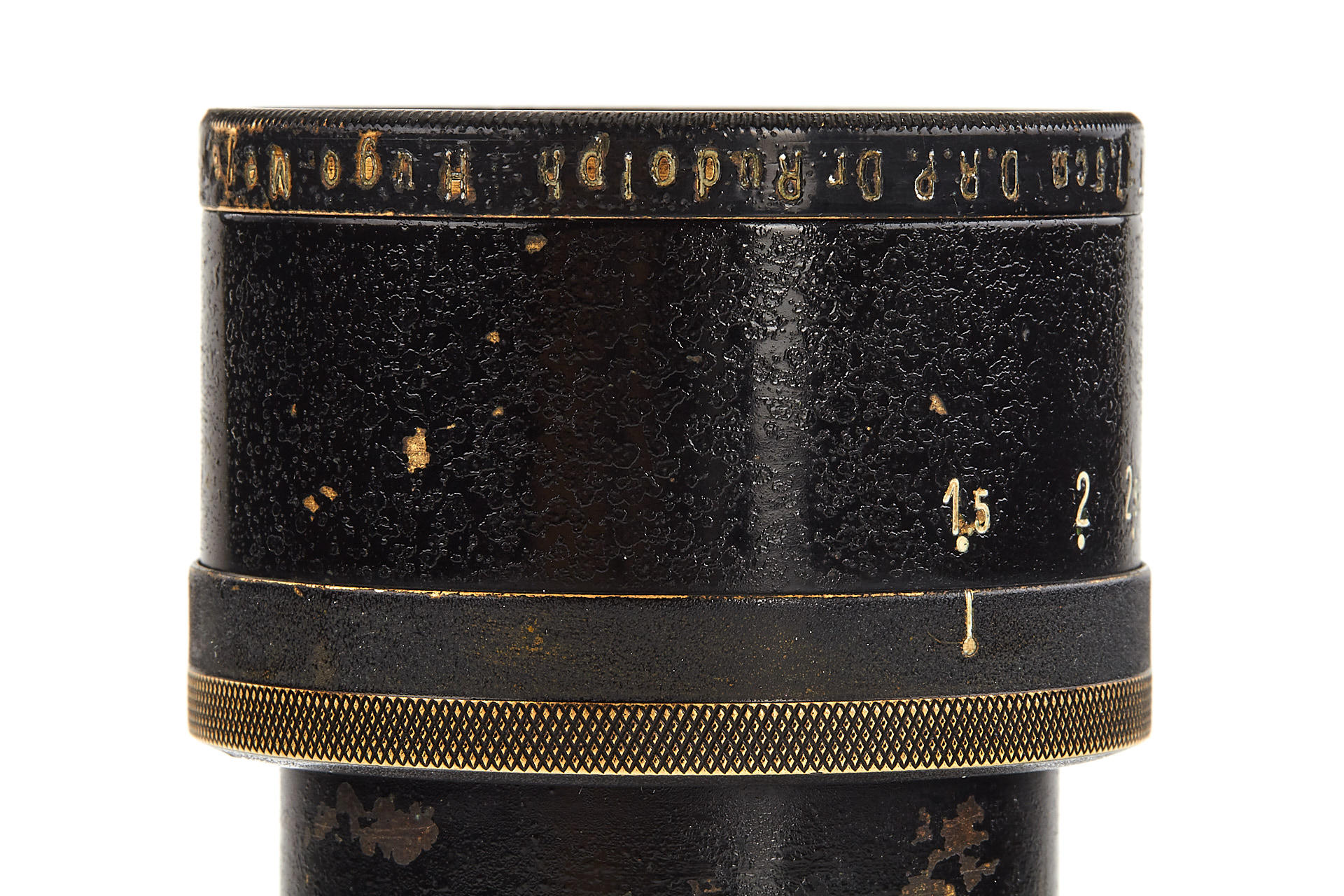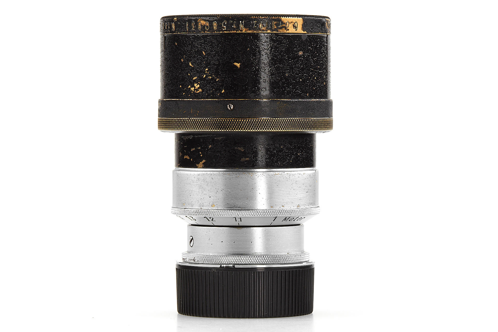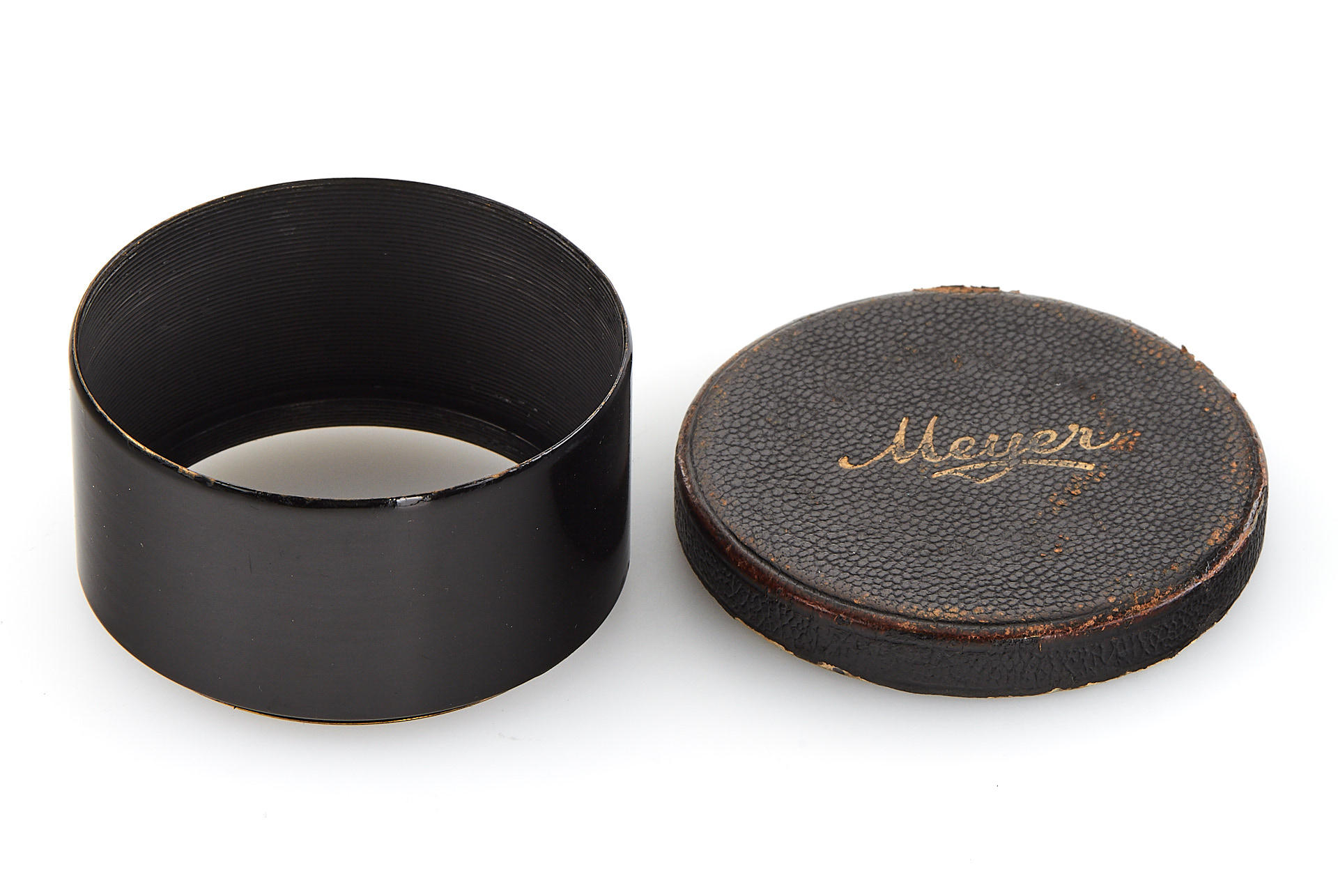 rare and sought-after portrait lens in original rangefinder-coupled M39 mount, version with meter scale and engraved with 'Dr. Rudolph Hugo Meyer & Görlitz', black paint body with a chrome focusing ring, in fine condition, very good uncoated optics, incl. black paint hood, front cap, M-adapter, leather case, Nikon F and Canon EF adapters for the lens head