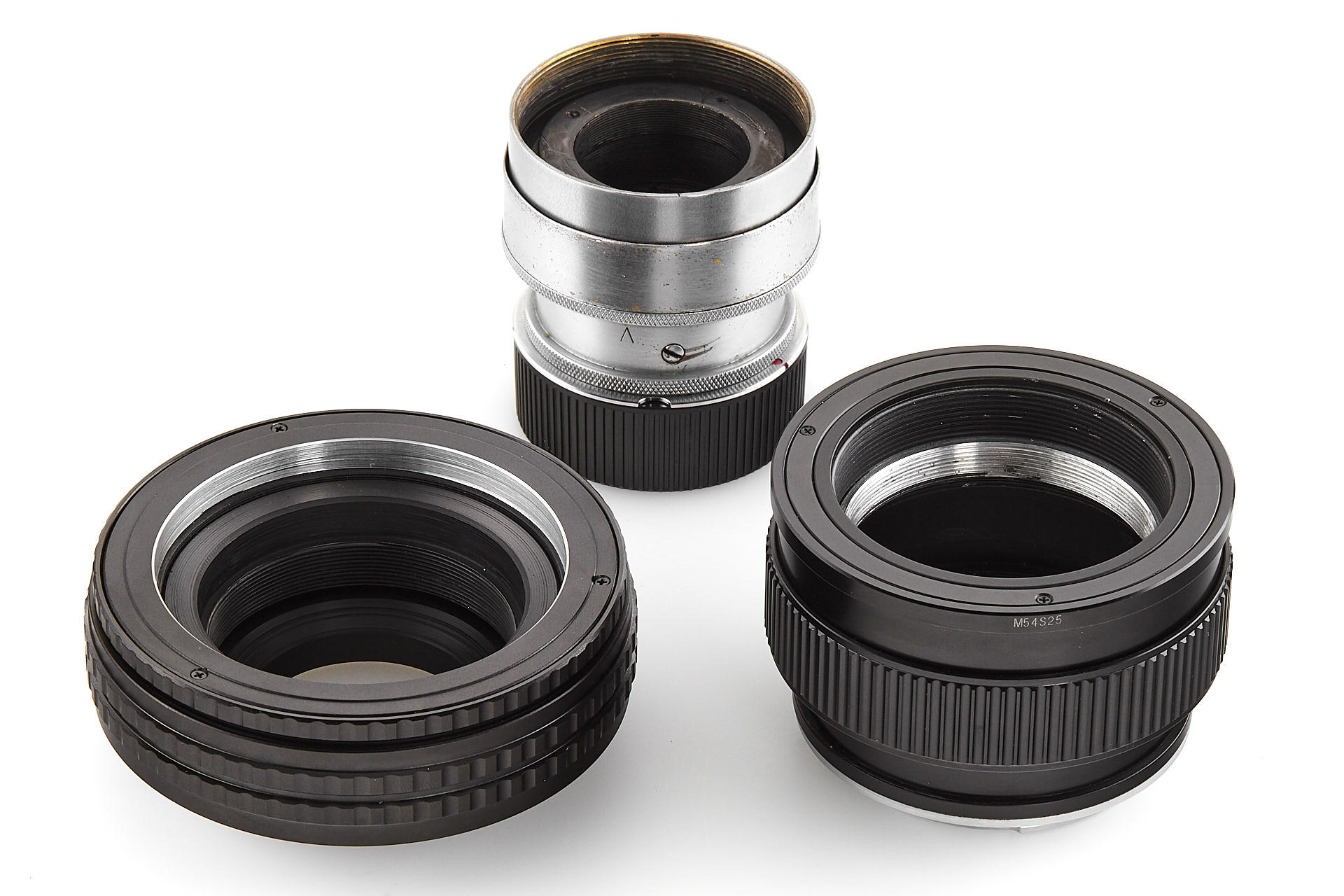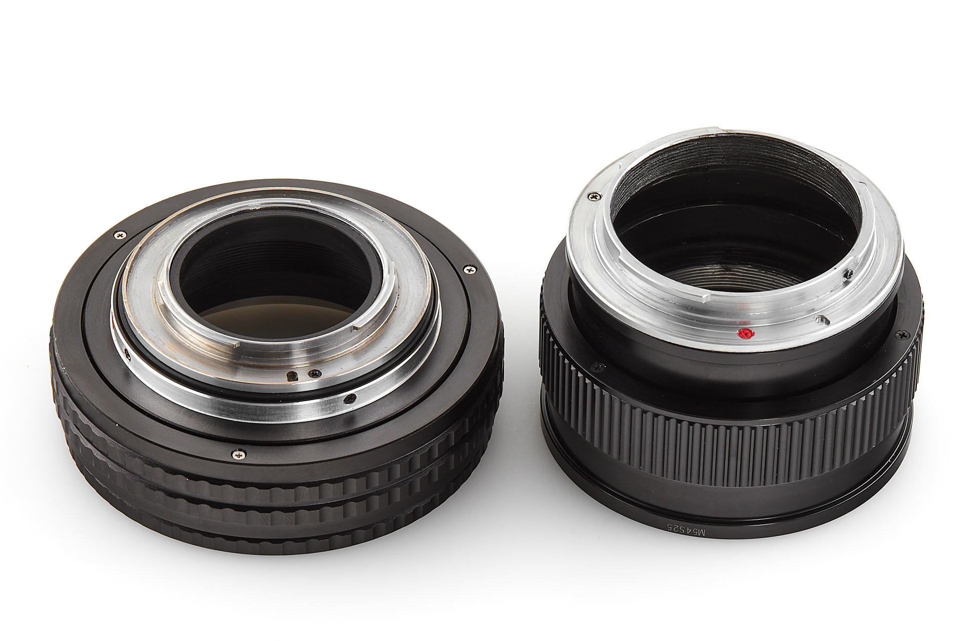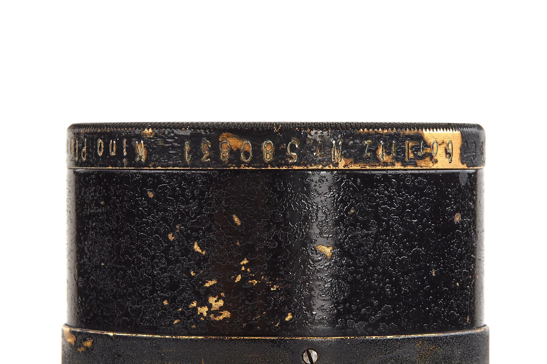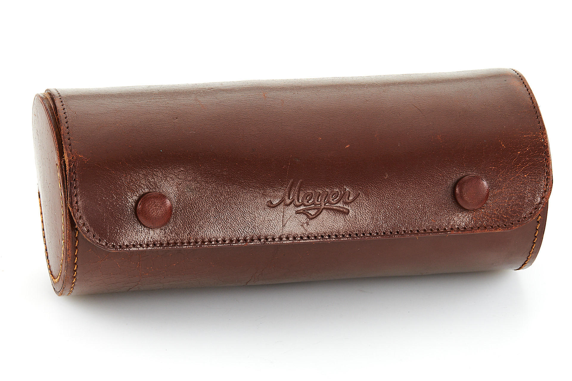 rare and sought-after portrait lens in original rangefinder-coupled M39 mount, version with meter scale and engraved with 'Dr. Rudolph Hugo Meyer & Görlitz', black paint body with a chrome focusing ring, in fine condition, very good uncoated optics, incl. black paint hood, front cap, M-adapter, leather case, Nikon F and Canon EF adapters for the lens head