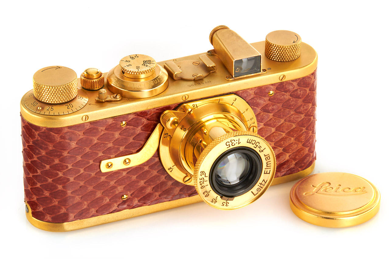 very well made gold plated replica of 'Luxus' I Mod.A, based on a body from matching batch, snakeskin covering, with Elmar 3.5/5cm, inclusive gold plated cap