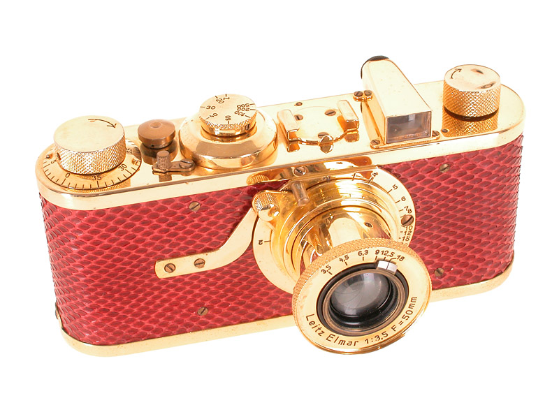 early Leica I with close-focus Elmar 3.5/50mm with all early features, in feet, baseplate engraved with: Sold by Sinclair London etc., the camera was gold-plated and covered with reptile leather, gold-plated cap