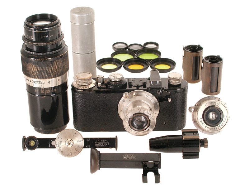 extremely rare outfit in original condition: listed IC Non-Standard no.52430 with swinging mask for 135mm, Elmar 3.5/50mm no.430, Elmar 3.5/3.5cm no.430 (focus to 0.5m), Elmar 4.5/135mm no.430 - all lenses in uncoupled original condition, early and very rare VISOR torpedo finder, WINKO, FOFER, various filters and close-focus lenses - all in matching outfit case ETGRO! An outfit with 3 matching lenses is extremely hard to find and one of the greatest Leitz rarities! See also: VIDOM no.78. In the Leitz salesbook the camera no.52430 is listed as LESAM, this code means that the camera was delivered with three Elmar lenses!
