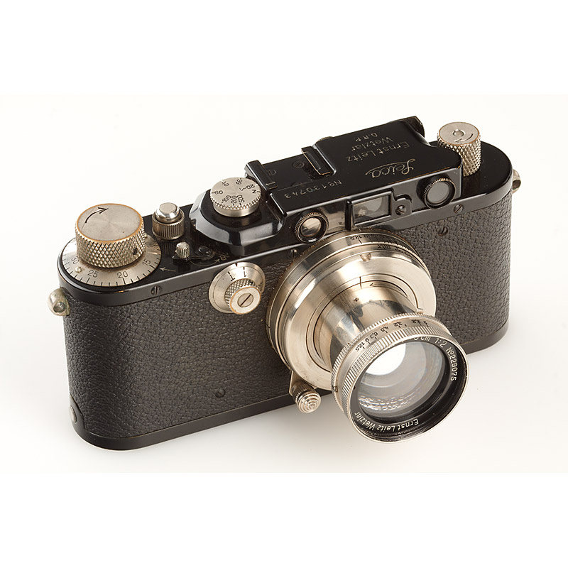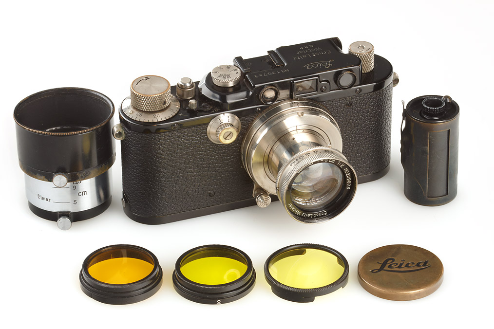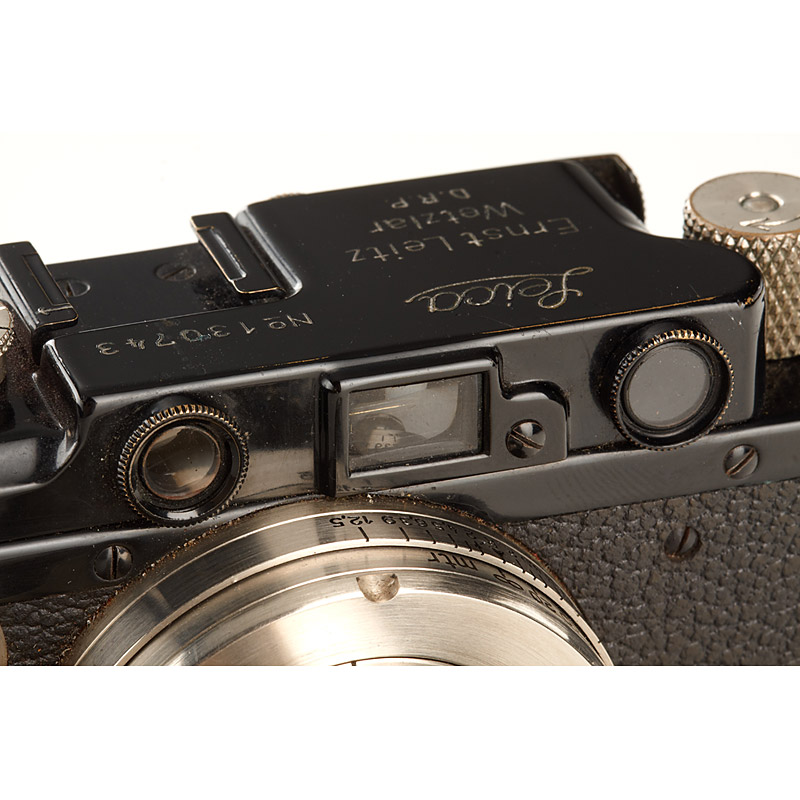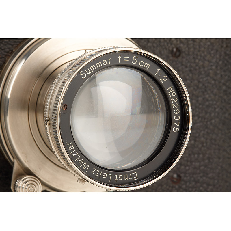 body in good working order, apart from a dent on the left side of the top-plate in very fine original condition, matching nickel Summar 2/5cm no.229075 (fungus, cleaning marks), cap, FIKUS hood, 3 yellow filters, outfit case