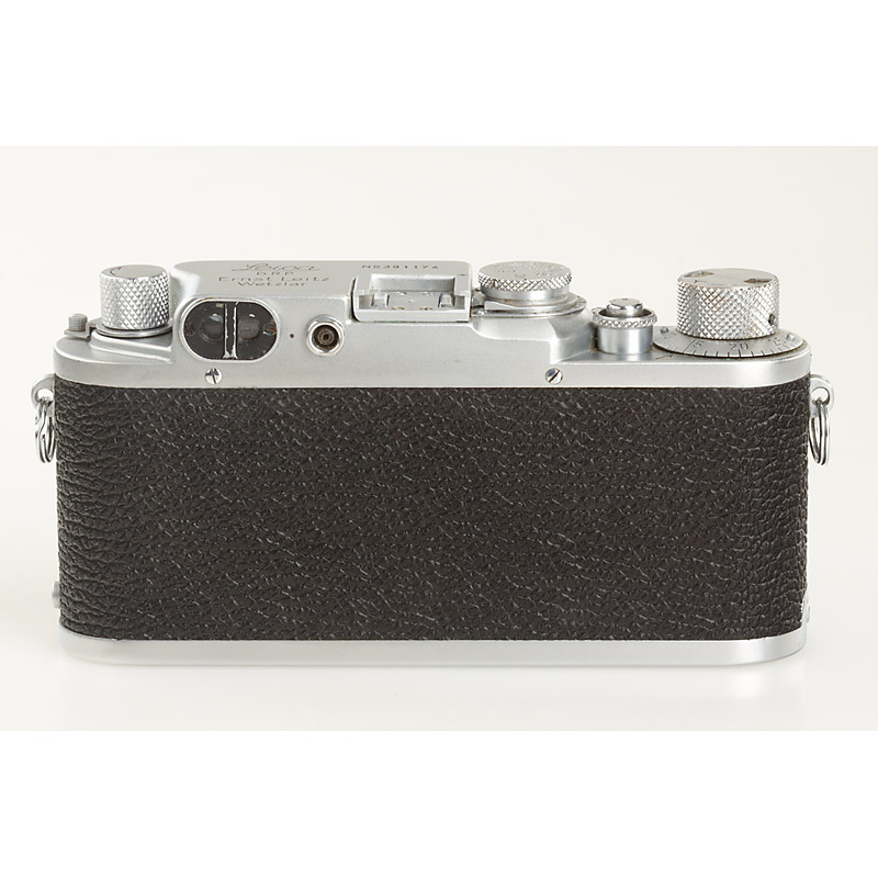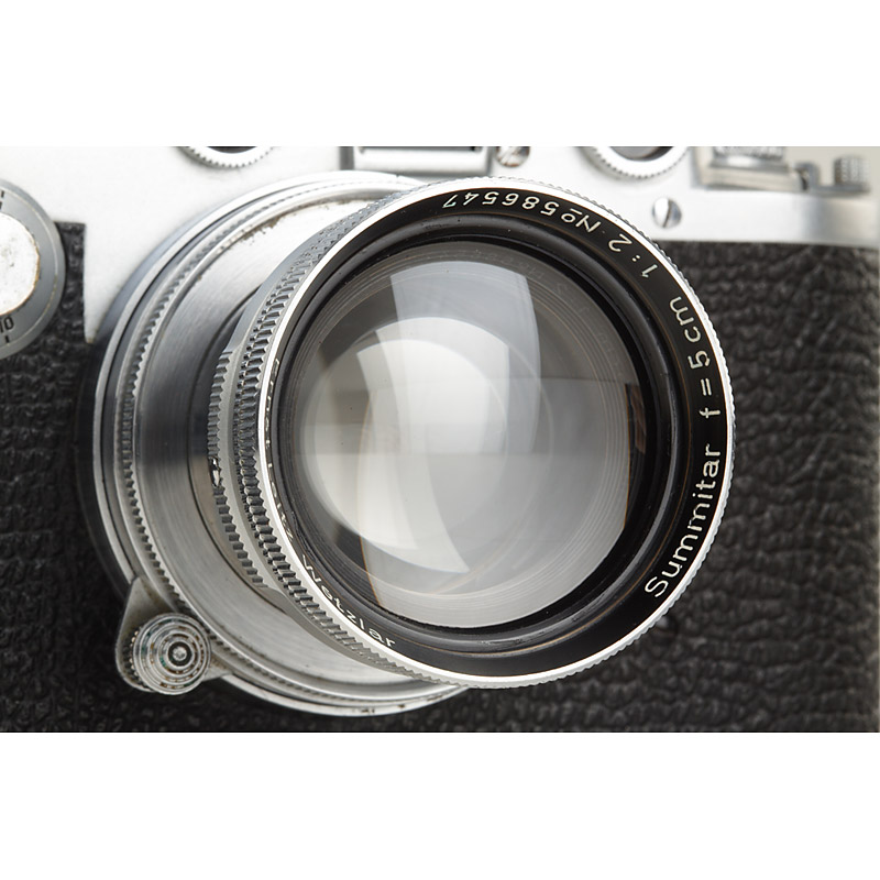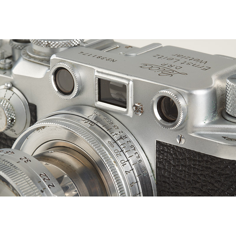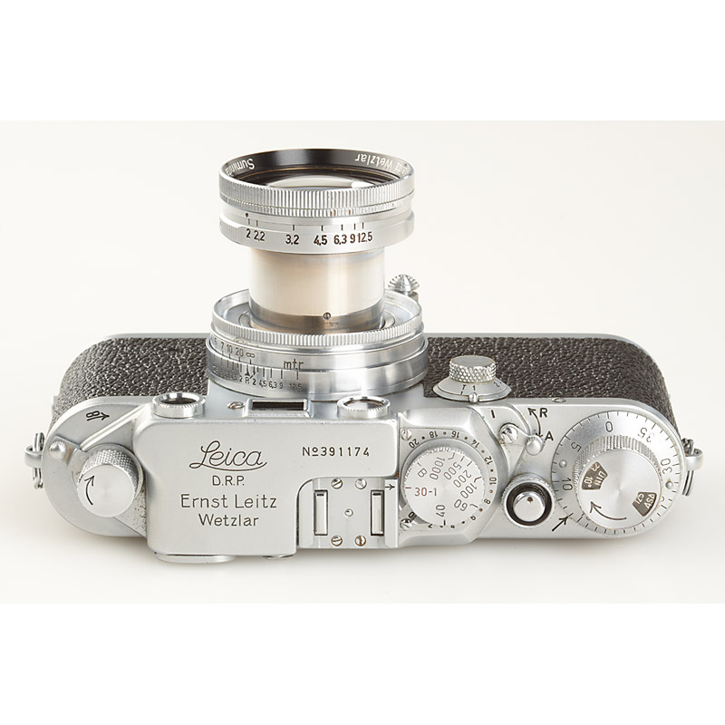 chrome war-time body in fine condition, original top-plate and base-plate (upgraded to syn in early 50s), white K on shutter curtain (nos.391101-391300 are all chrome K cameras without 'K' after serial number, only the shutter curtain with 'K'), delivered to the American Army on July 24th, 1945 (delivery number 8175), Summitar 2/5cm no.586574 (cap), delivered as SOORE-B (Belag, coated) to AES (American Exchange Service) on June 30th, 1946 (delivery number 16436), with booklet by Alfred Klein 'Mit der Leica als Berufsphotograph und Bildberichterstatter' (a very rare war-time book with many illustrations)