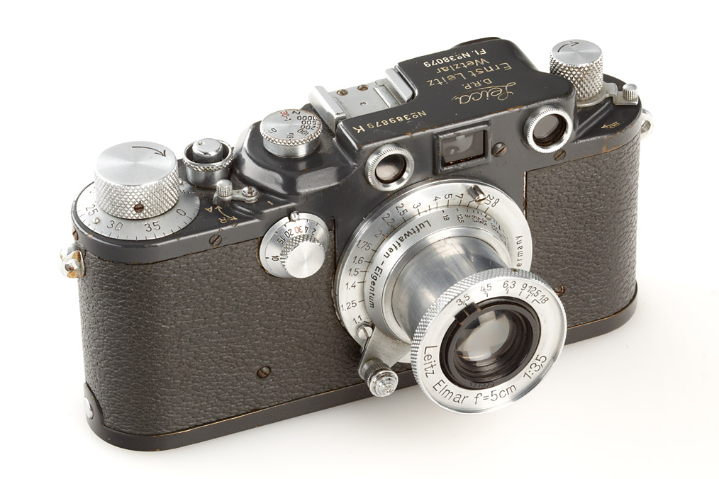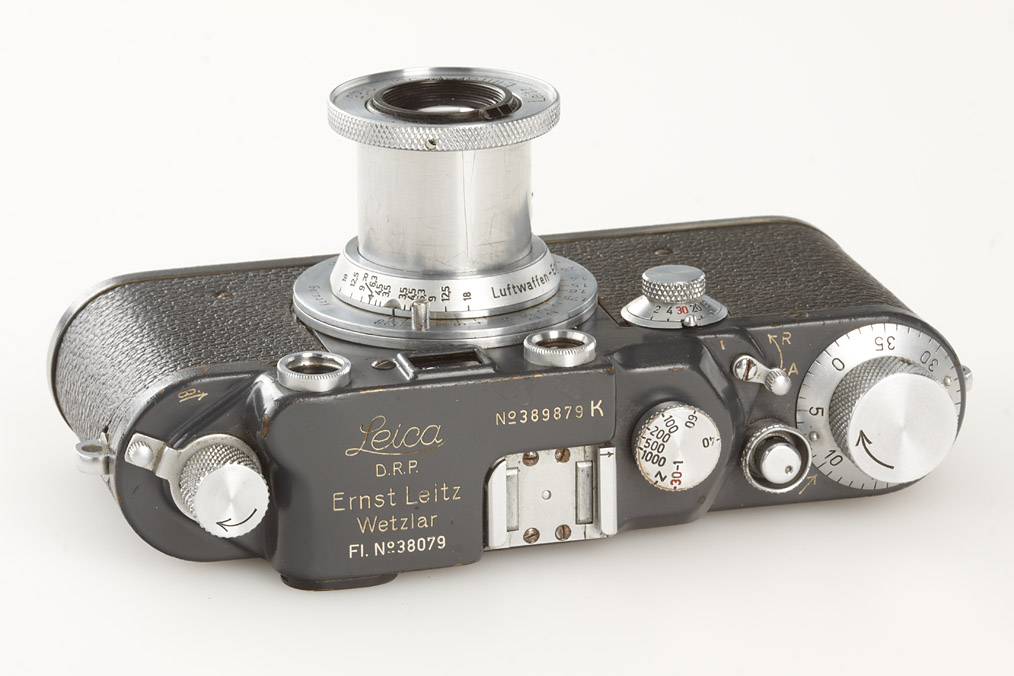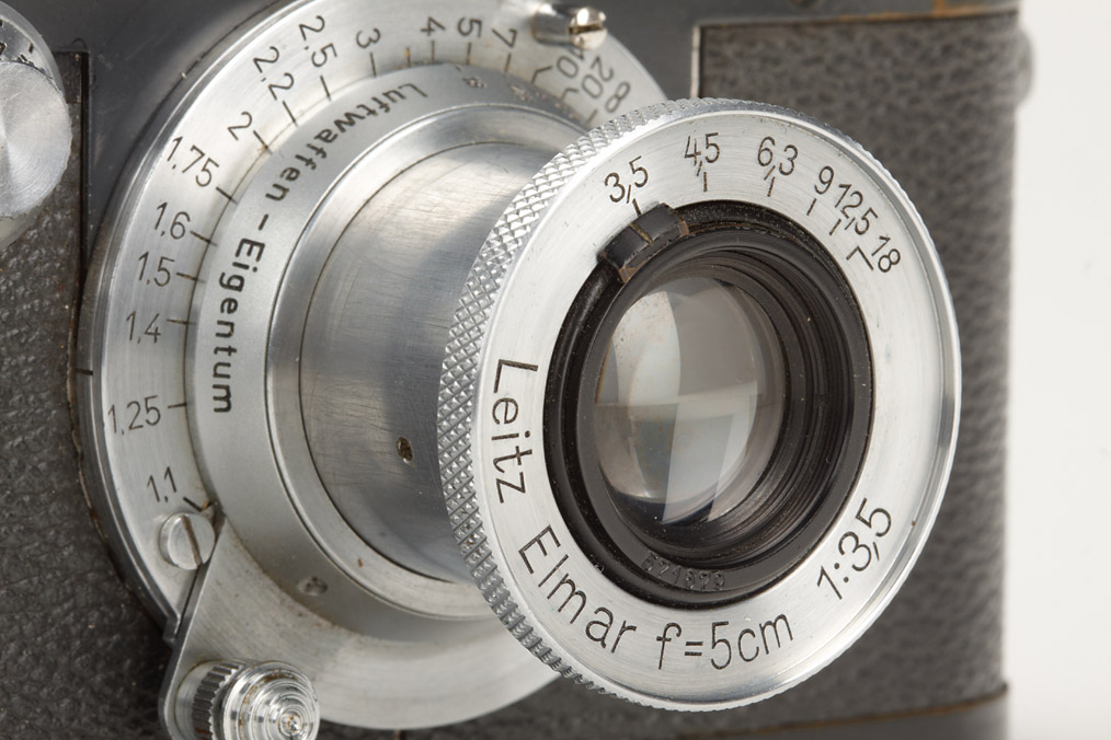 100% original military IIIc grey in beautiful condition, engraved ''Luftwaffen-Eigentum' + FL. no.38079', delivered as LOOKX B on August 24th, 1943 to BLN Berlin (delivery number 9909), white K on shutter blind, with Elmar 3.5/5cm no.571679 engraved 'Luftwaffen-Eigentum', delivered on November 4th, 1941 to BLN Berlin (delivery number 29142), very rare grey painted bakelite lens cap, grey everready case marked 'Luftwaffeneigentum'