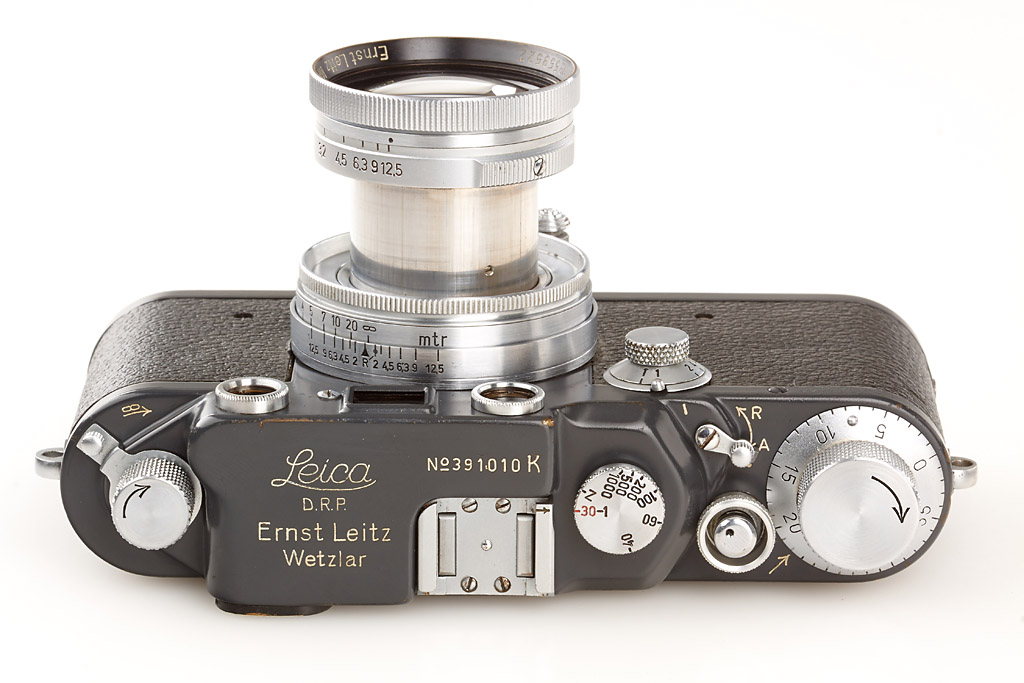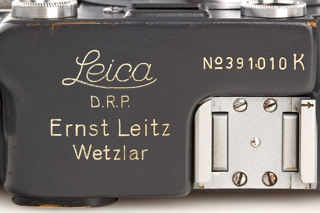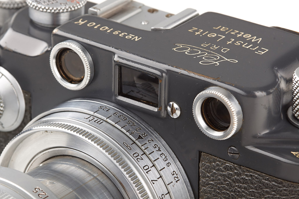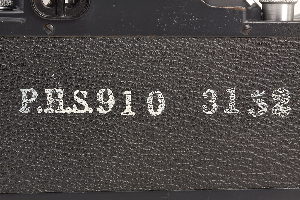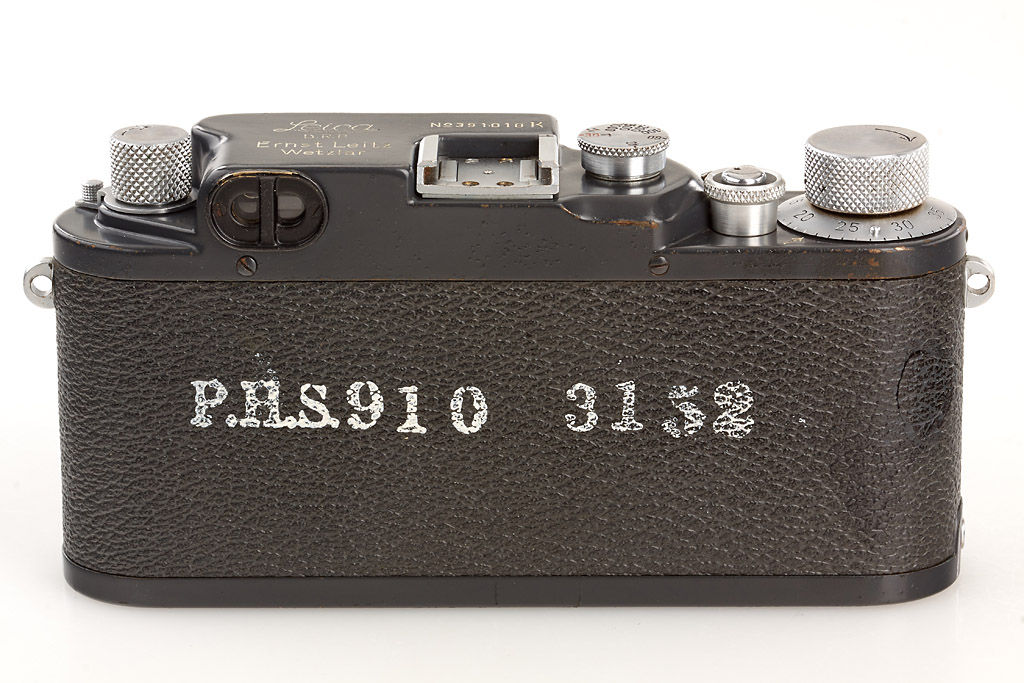 late grey IIIc K in beautiful, original condition (white K on shutter, grey leather covering), with white lettering print on rear for US Army (P.H.S.910 3152), Summitar 2/5cm no.559522 (cap)