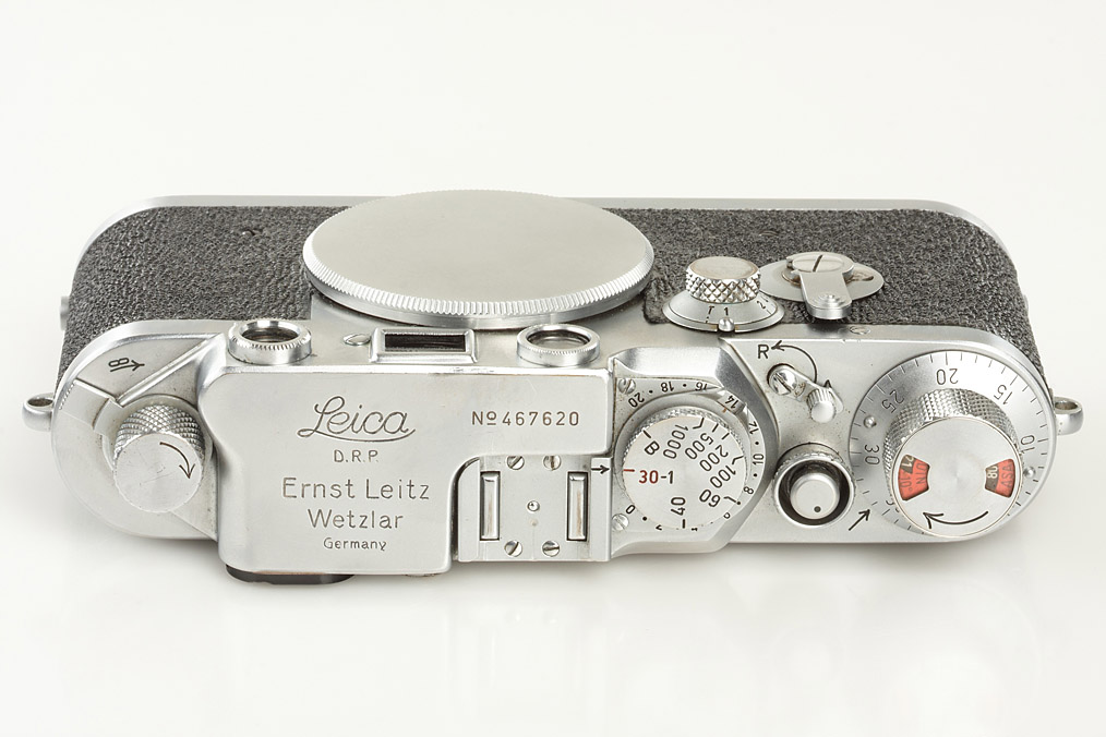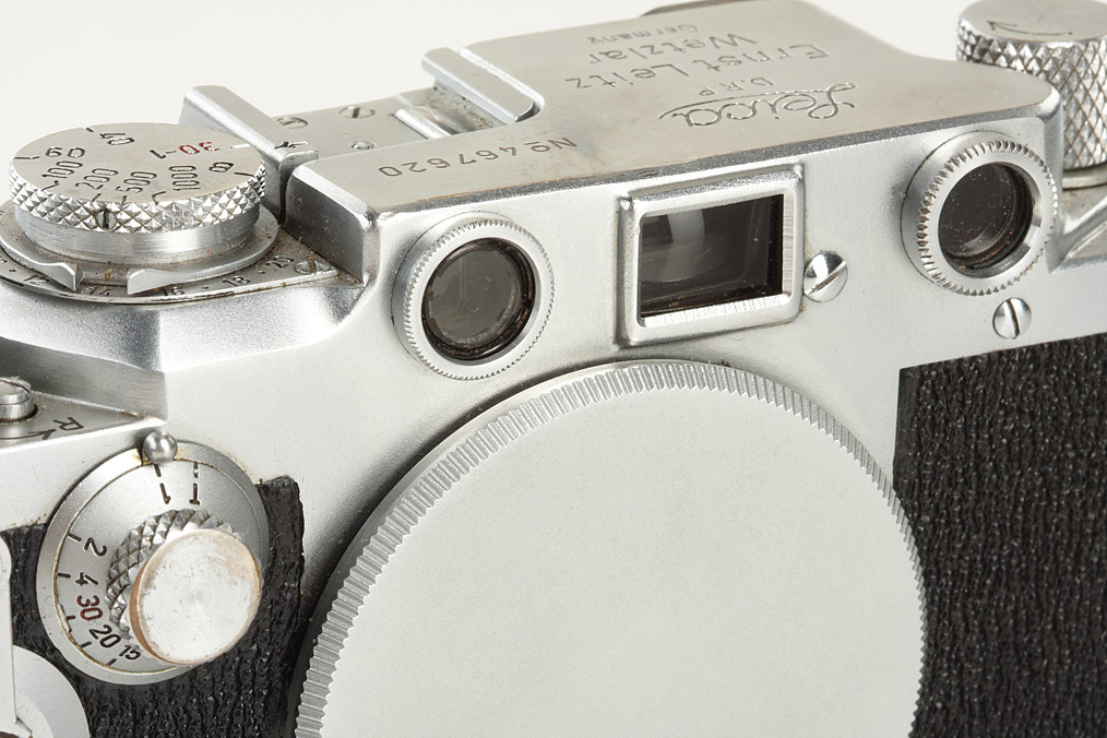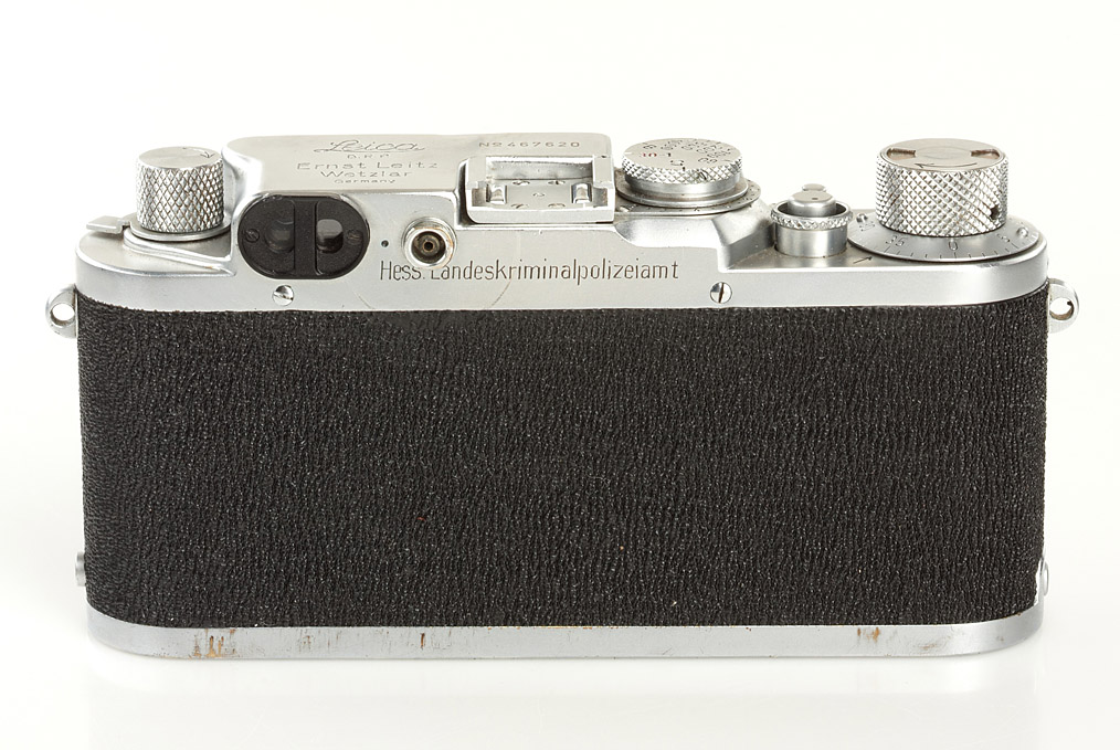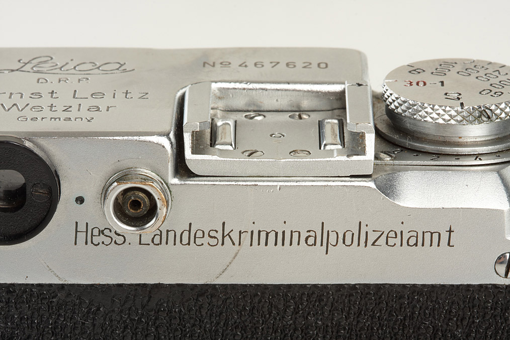 Hess.Landeskriminalpolizeiamt' (Criminal Police Office in Hessen) engraved on back of top plate, original German Police camera with sharkskin leather covering, synchronized, according to a letter by Leica company dated 1990, the camera was delivered on February 18th, 1949 to the commandership of the Police in Wiesbaden - ex. Ansaldi collection
