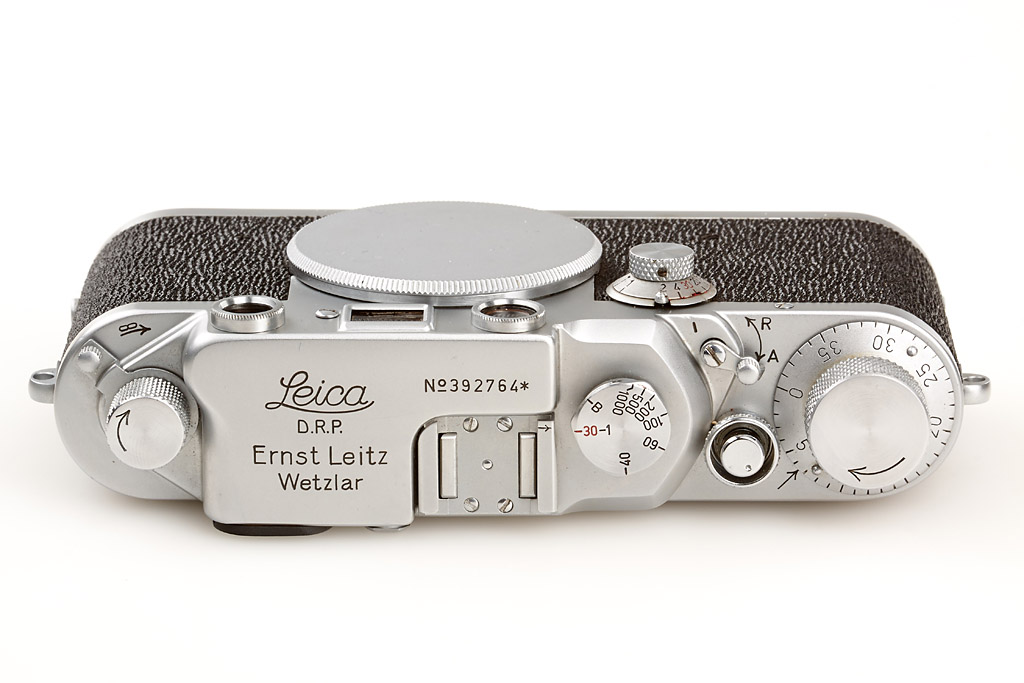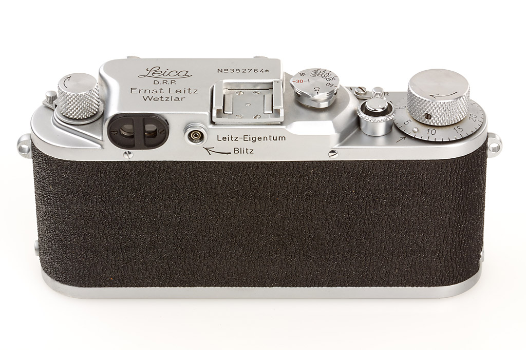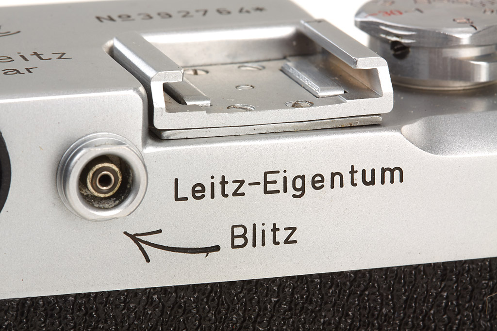very interesting camera: wartime body with asterisk after serial number, engraved 'Leitz-Eigentum' and 'Blitz' with an arrows (the arrow points to the f-synchronization), special 'flash' speed dial, sharkskin leather covering