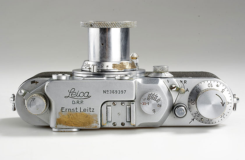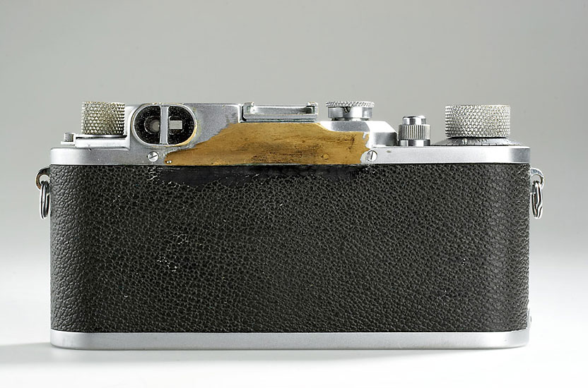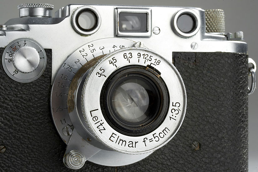 original Luftwaffen camera (military engravings defaced), red shutter blind, matching Elmar 3.5/5cm no.545020 (Luftwaffen-Eigentum engraving defaced), grey ever ready case (Luftwaffen-Eigentum defaced), camera and lens were delivered to Luftwaffe Bln. on January 14th, 1941 (delivery number 19786)